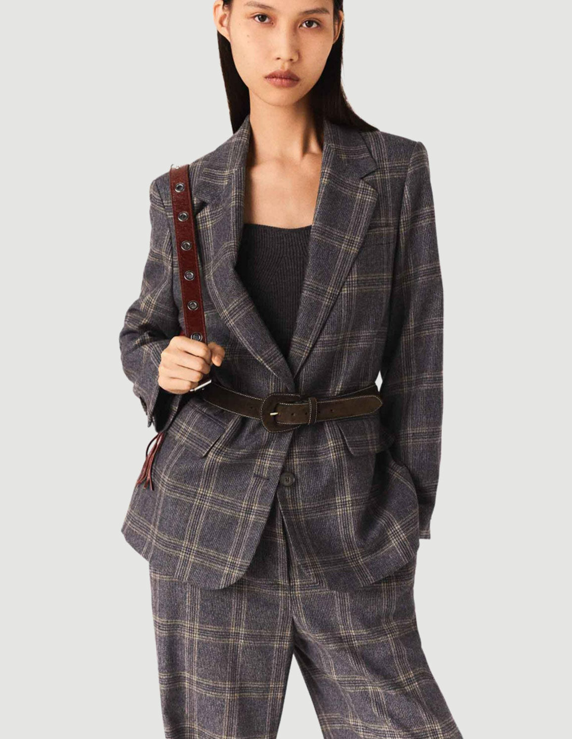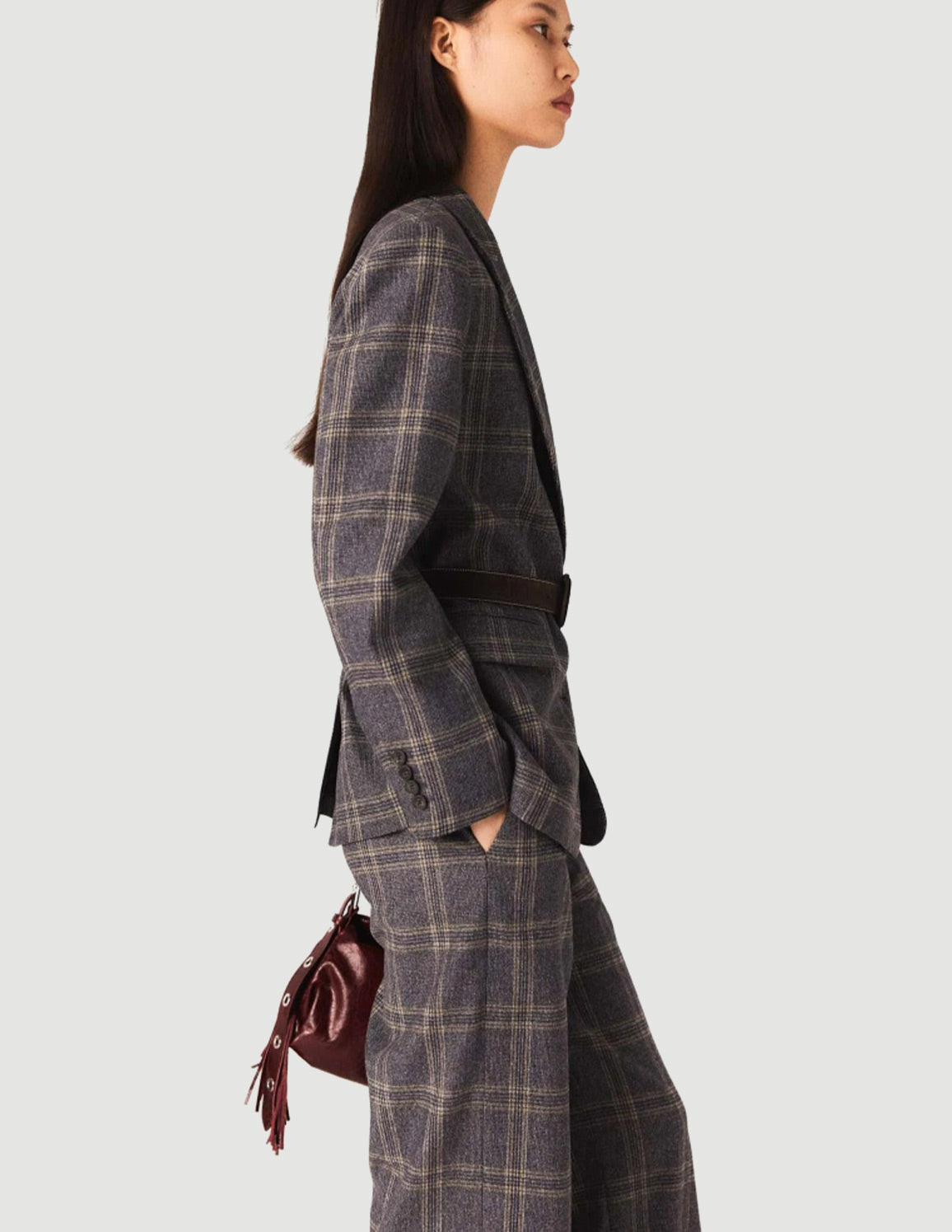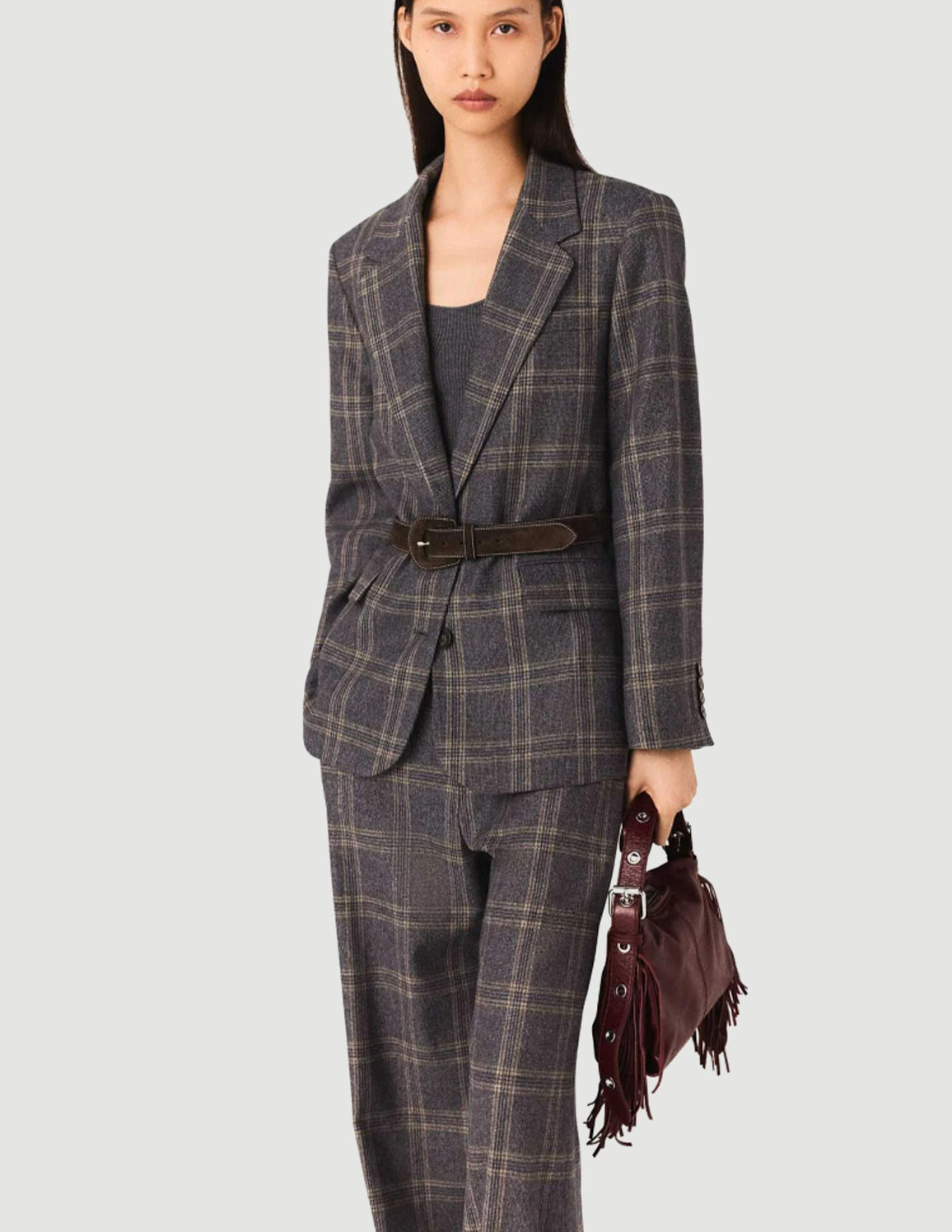 • With its bold checks and removable structuring belt, this jacket embodies modern elegance. Featuring long sleeves and a button fastening, it adapts to all styles. Worn as a total look with the matching trousers, it is accessorised with the season's signature pieces: a fringed leather bag and leather boots.