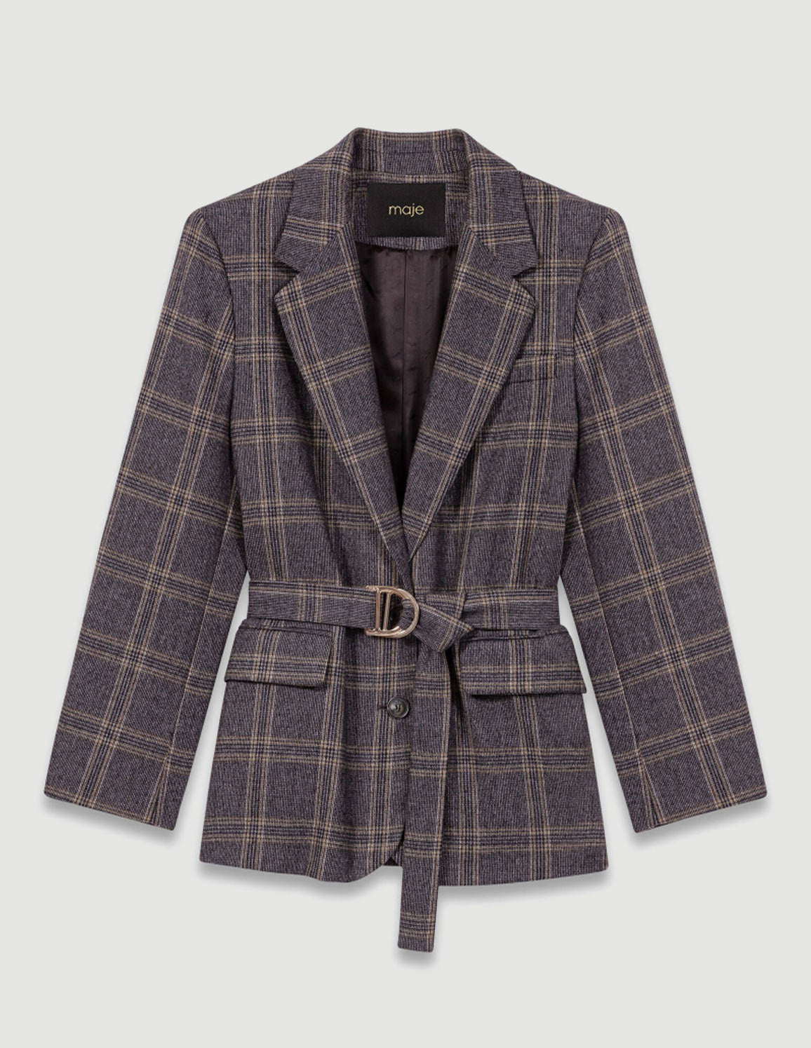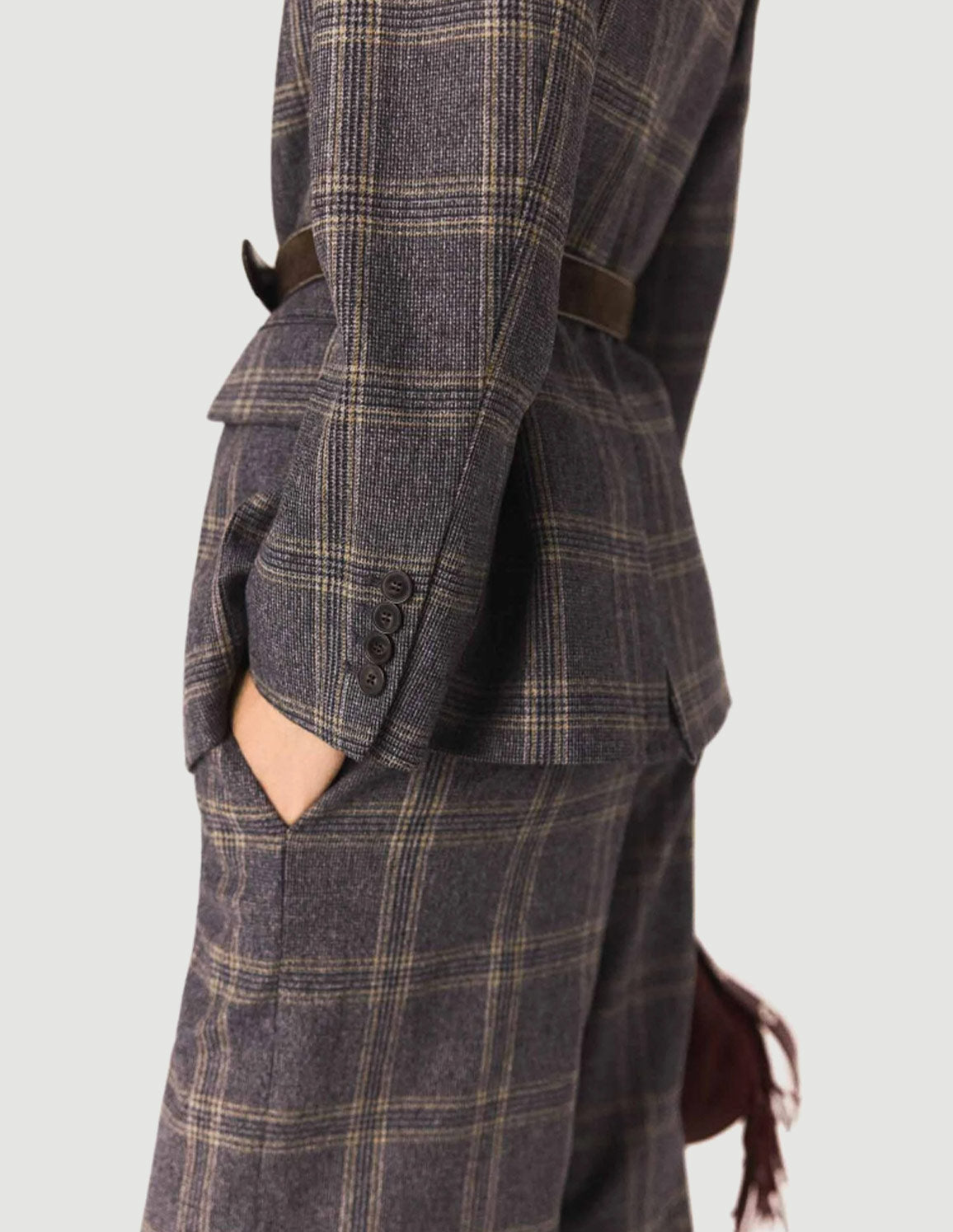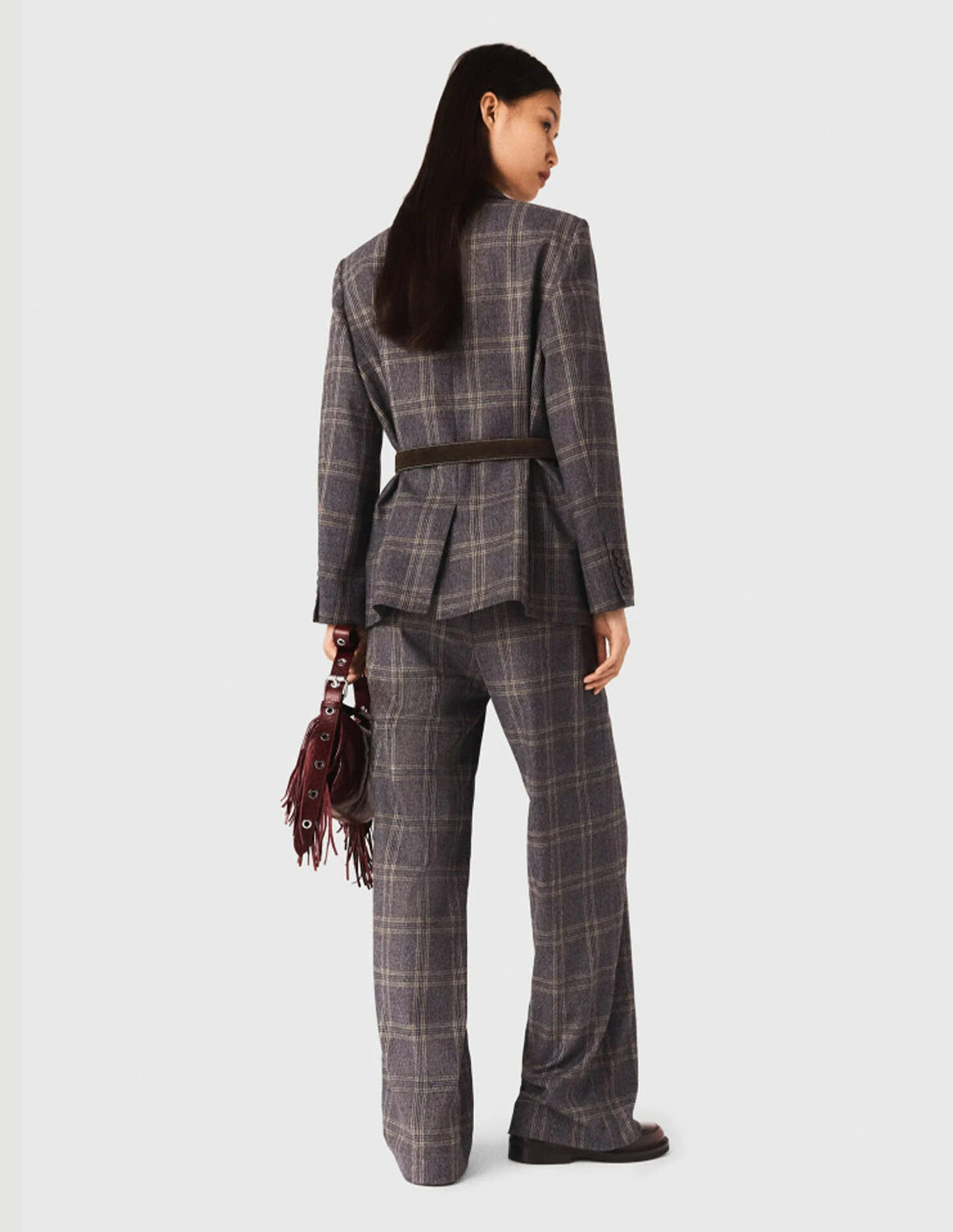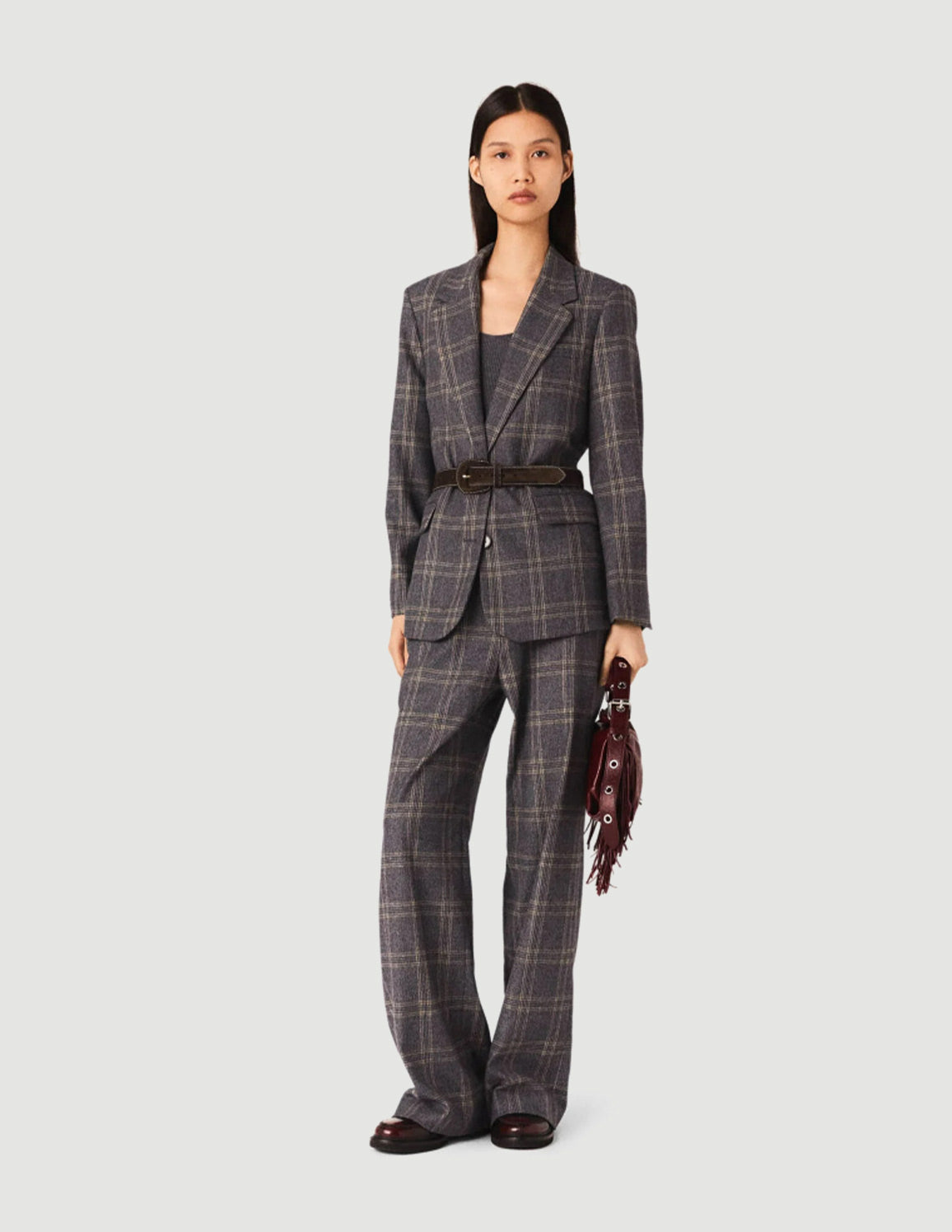 • With its bold checks and removable structuring belt, this jacket embodies modern elegance. Featuring long sleeves and a button fastening, it adapts to all styles. Worn as a total look with the matching trousers, it is accessorised with the season's signature pieces: a fringed leather bag and leather boots.