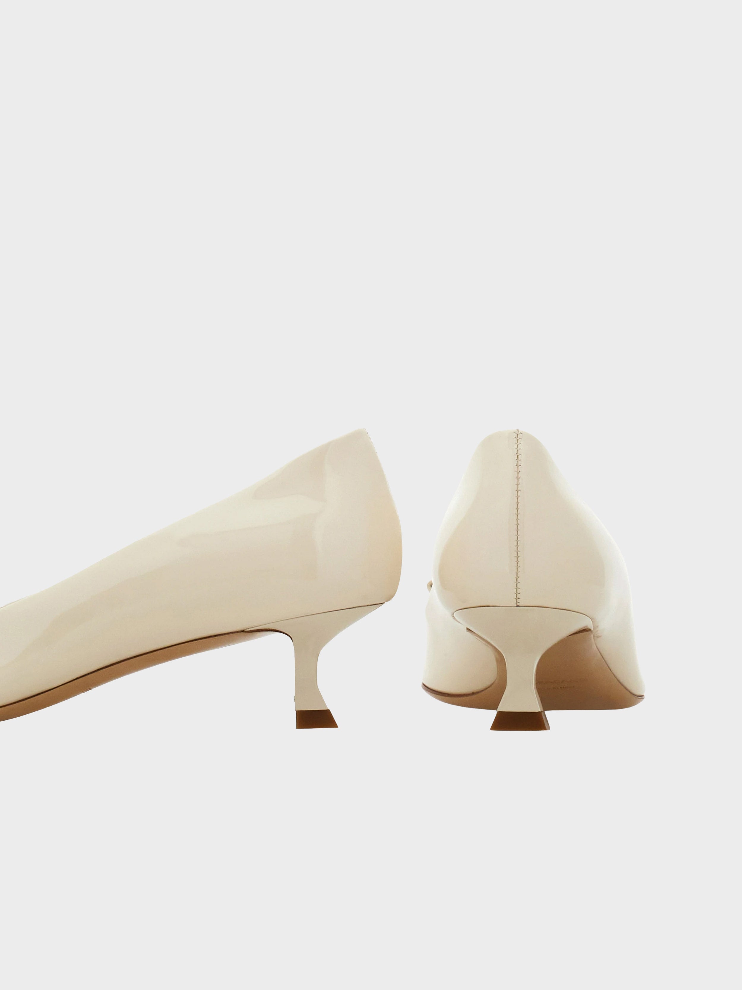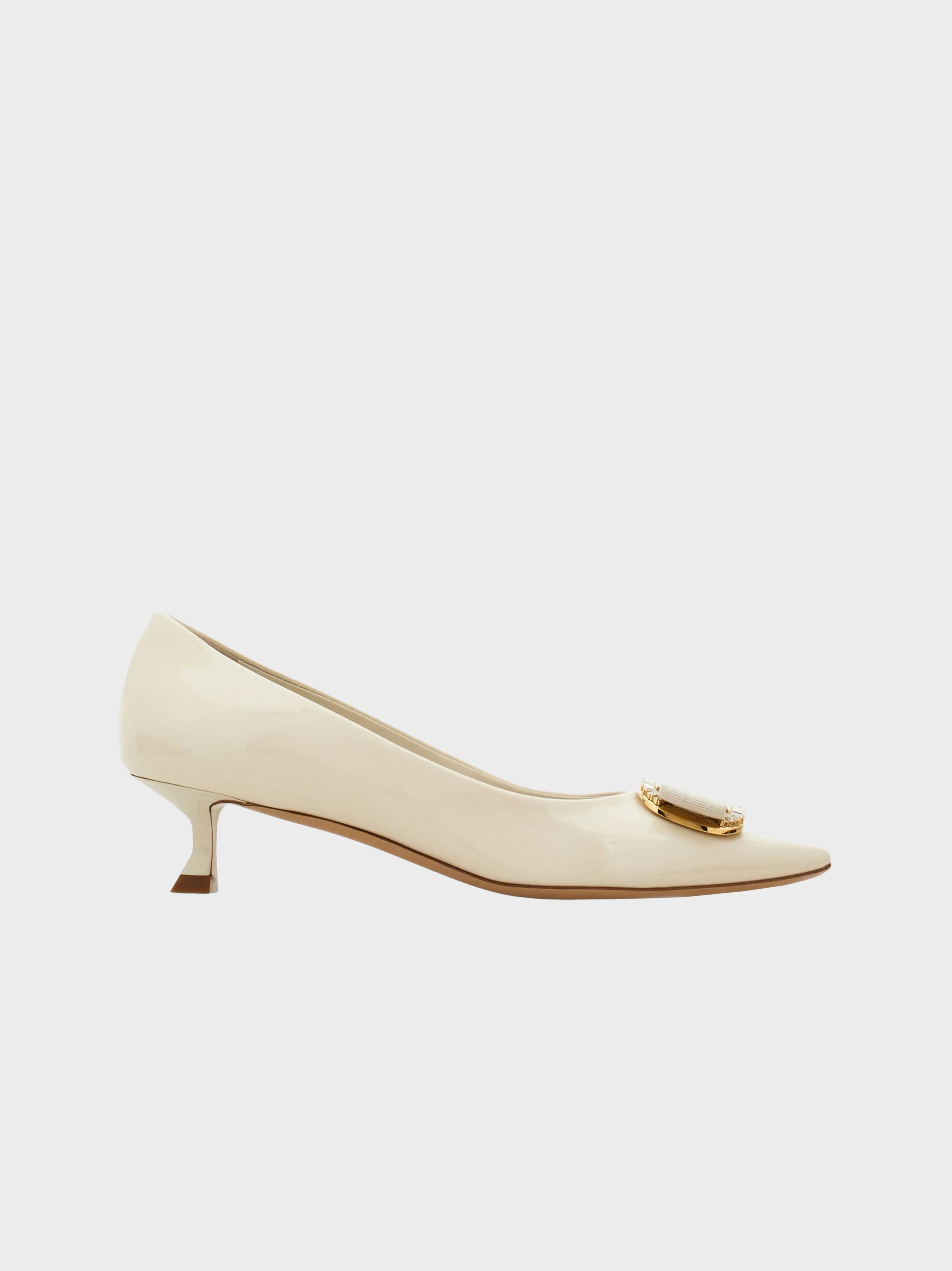 • The Ferragamo pump revised in an ultra-sophisticated key: patent leather gives this sleek slip on a glamorous twist. Detailed with micro crystals on the Vara buckle for a touch of sparkle.