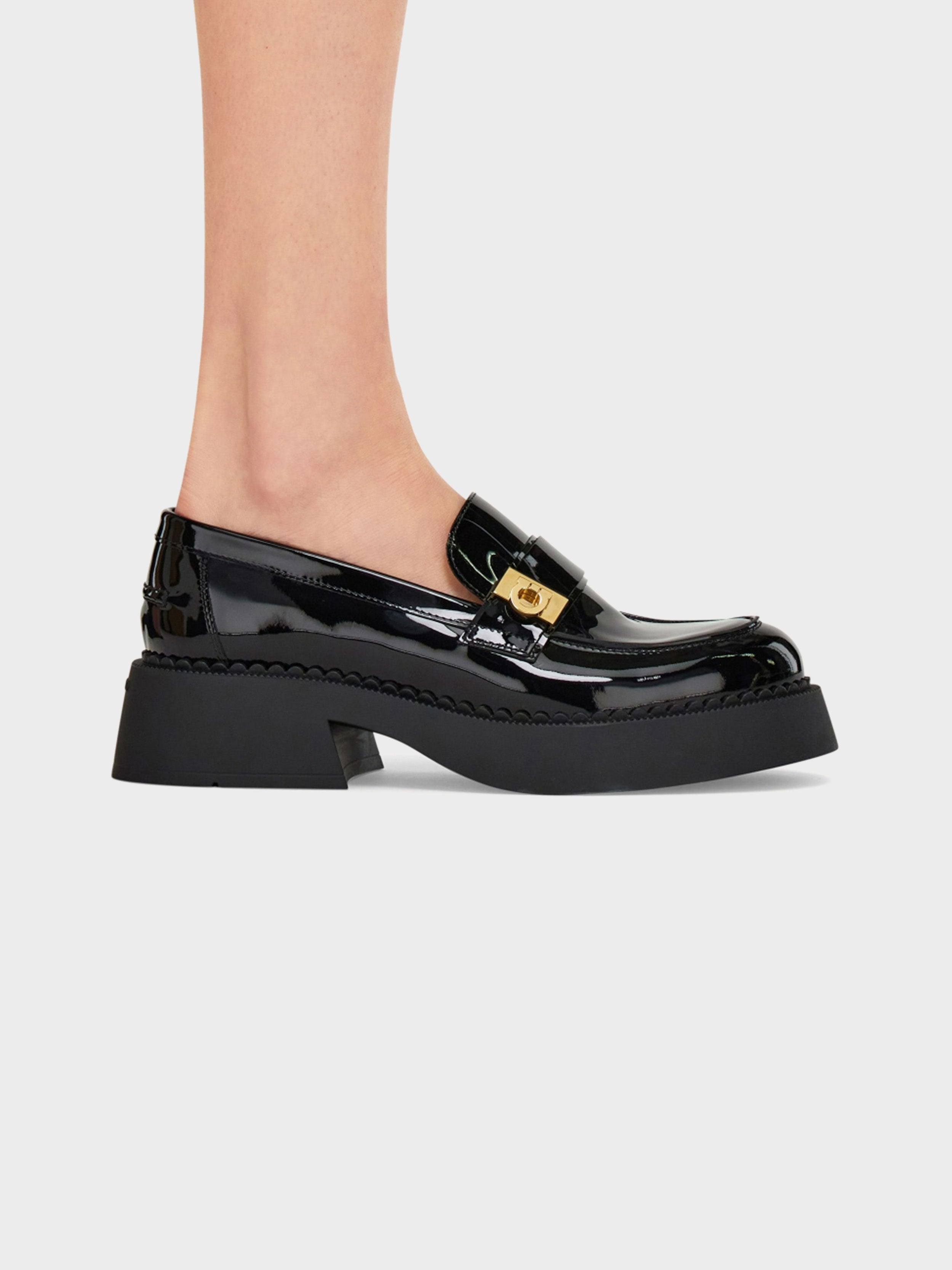 • A bold choice: this new loafer features a chunky profile set on sculptural rubber soles – thick yet ultra-lightweight. The elegant strap across the vamp reveals a golden Hug buckle on the side.