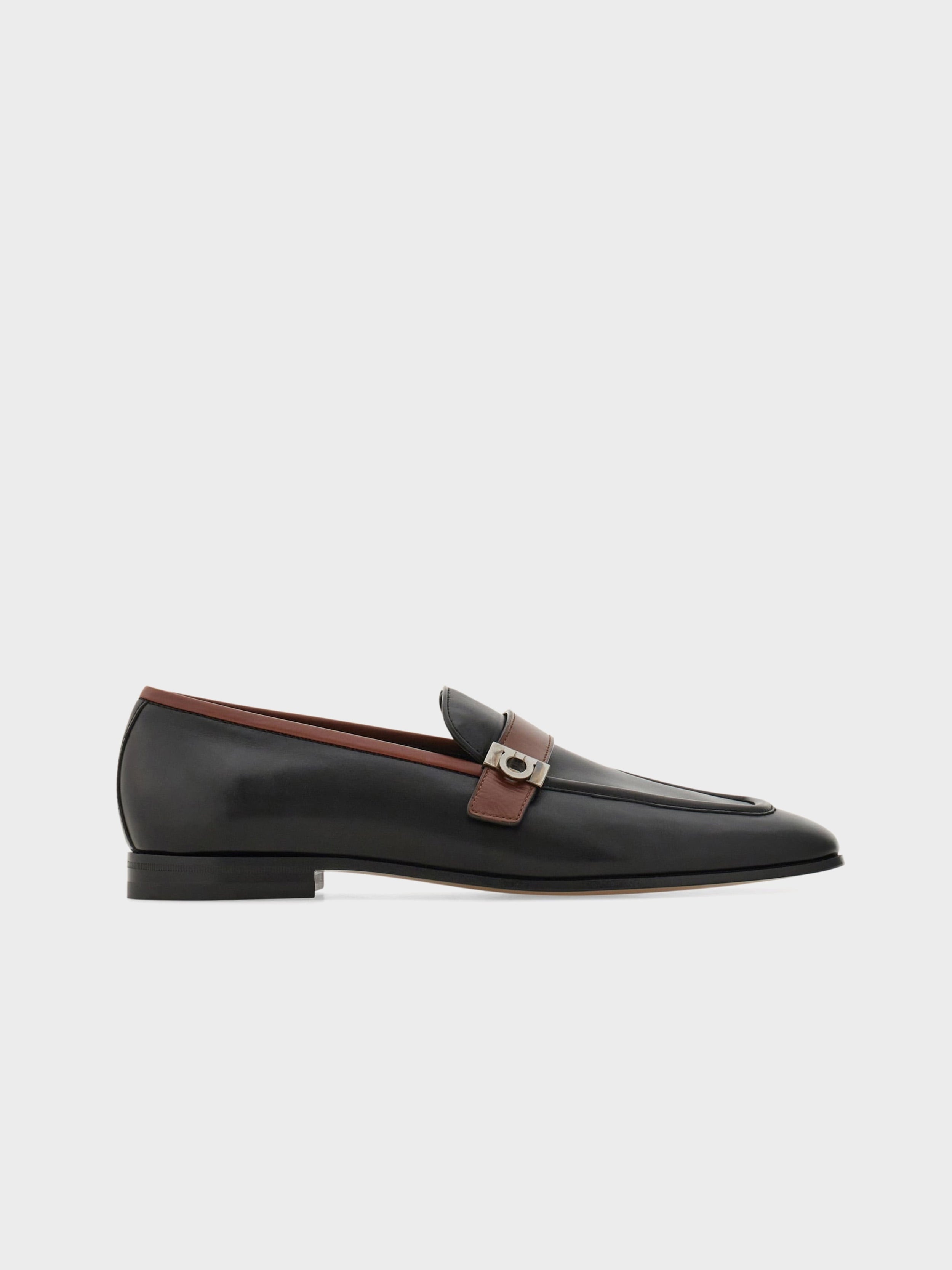 • The new formal: this loafer in two-tone calf leather features a square toe enhanced with textural stitch detailing. A contrasting strap with a discreet Gancini Hug buckle on the side adds a refined touch. Leather sole.
