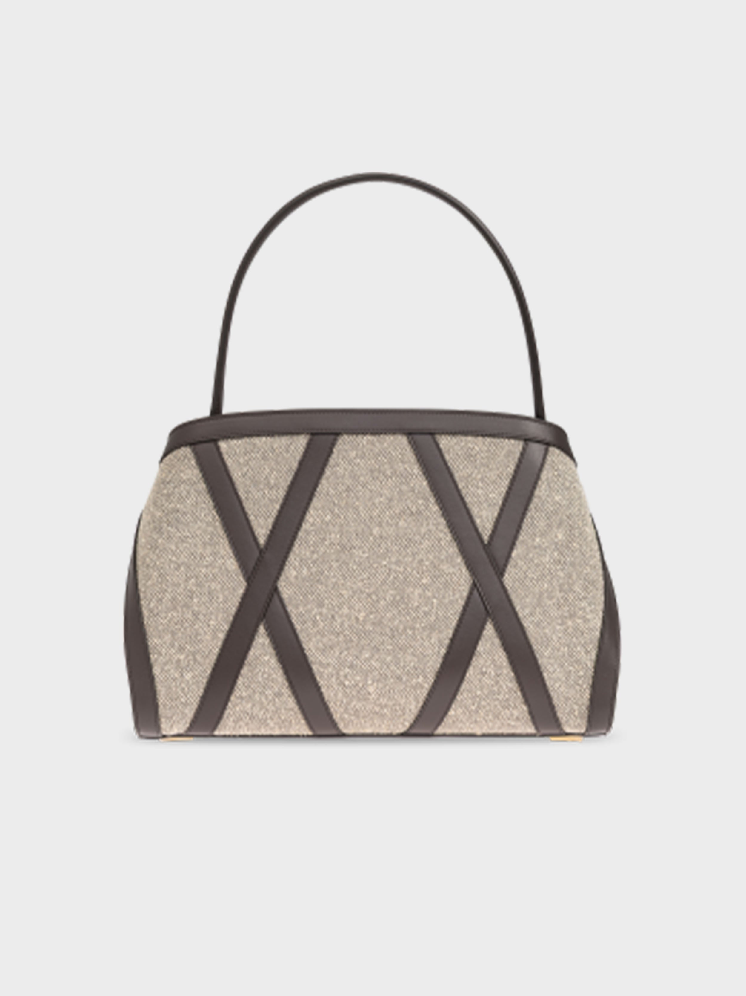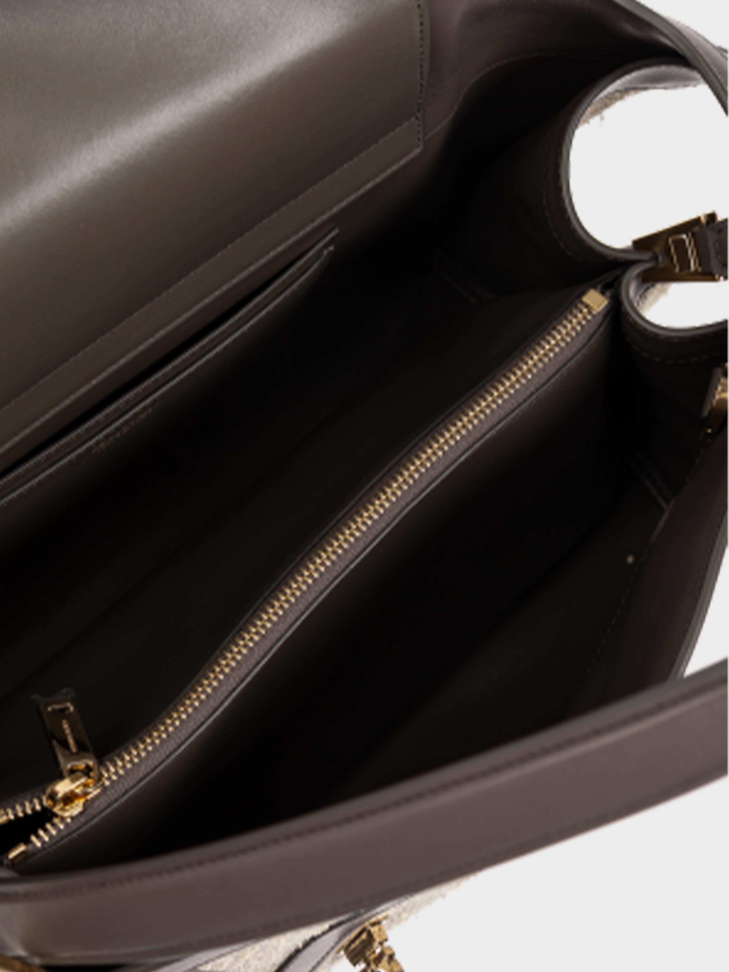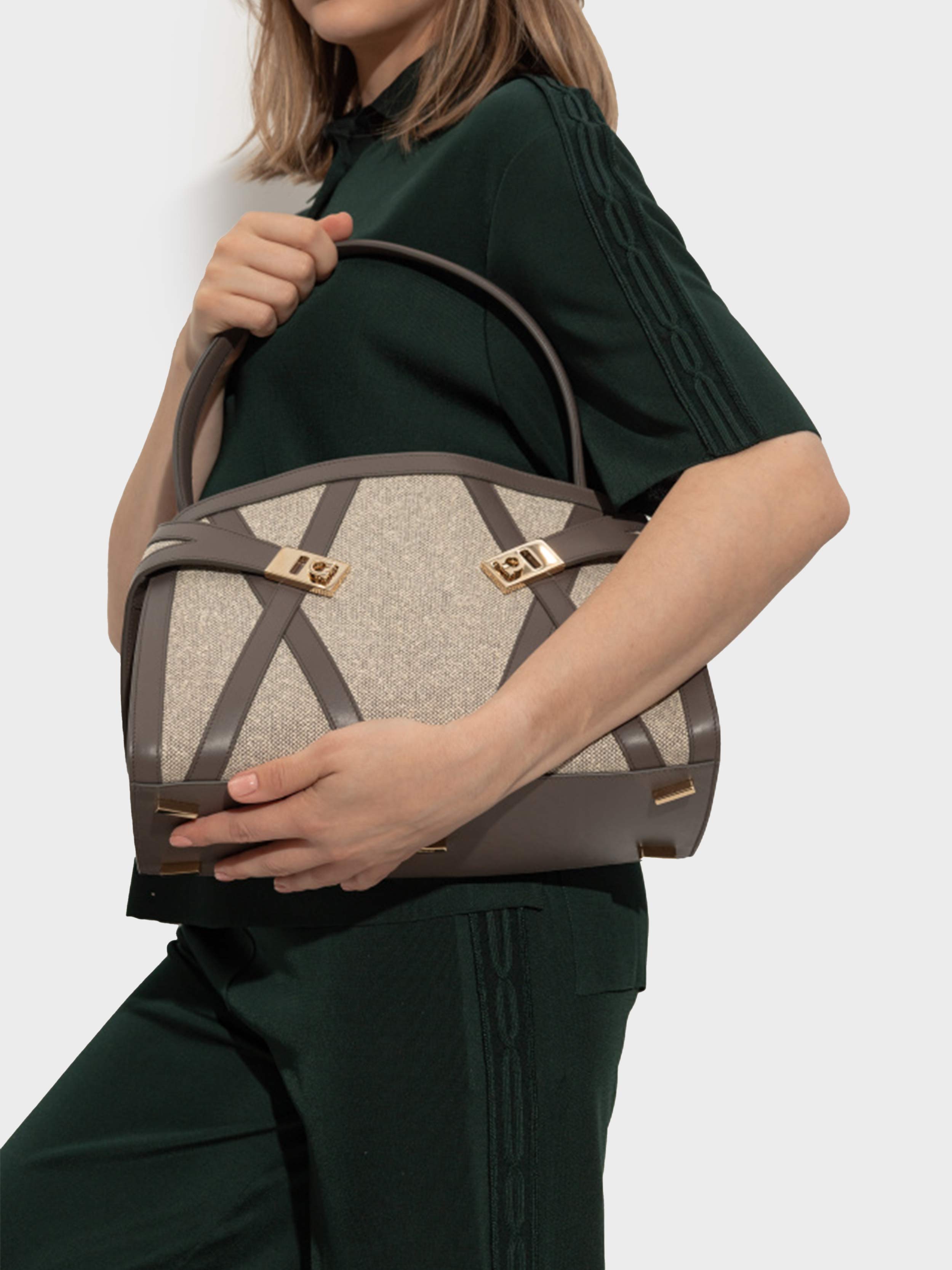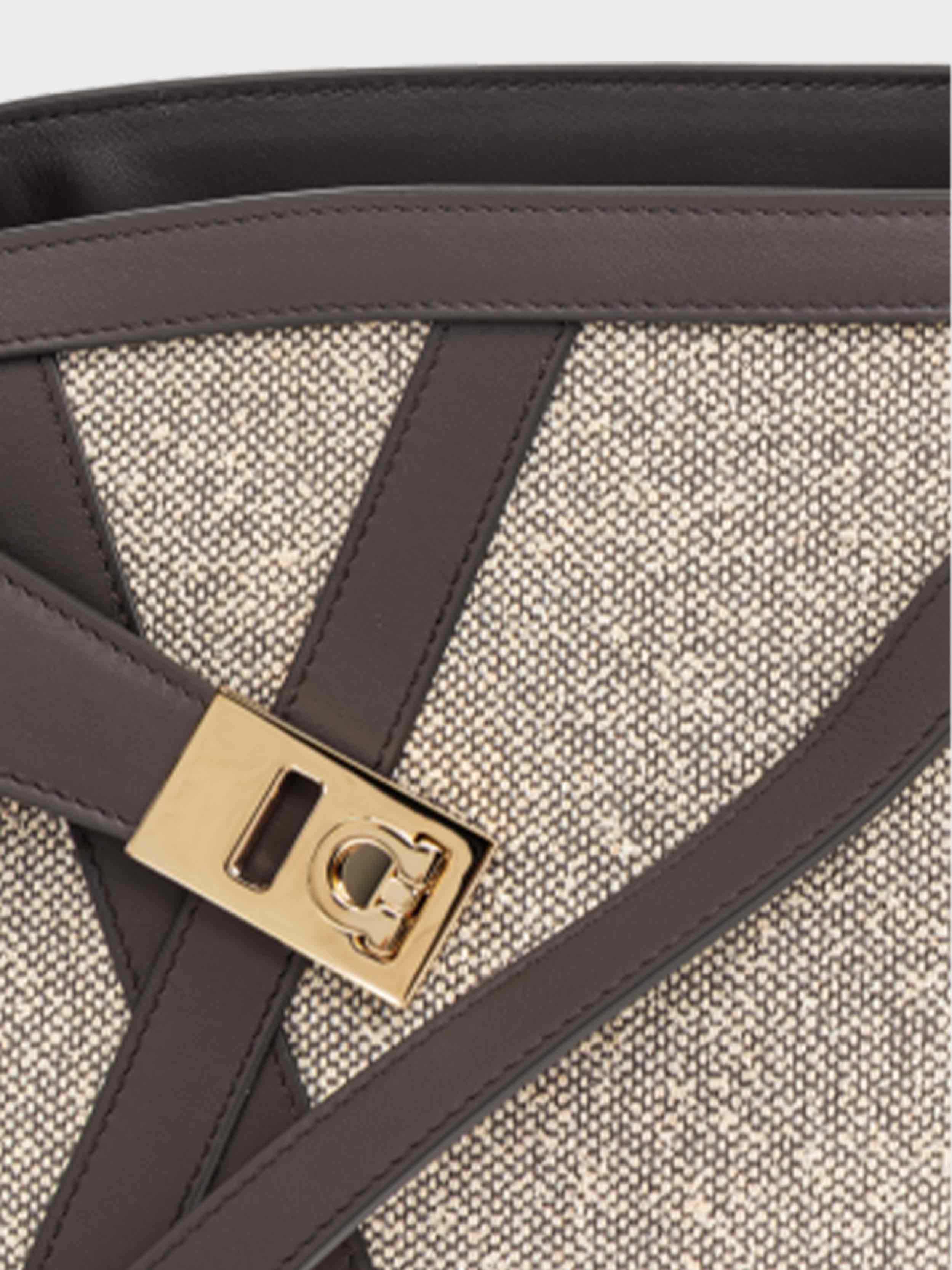 • The Hug bag cleverly blends recycled canvas and fine leather, reimagining the original design with sustainable materials. This version retains its classic shape, featuring a wraparound strap secured at the front with a gold-tone Gancio buckle. Diagonal lines across the front create a modern aesthetic.