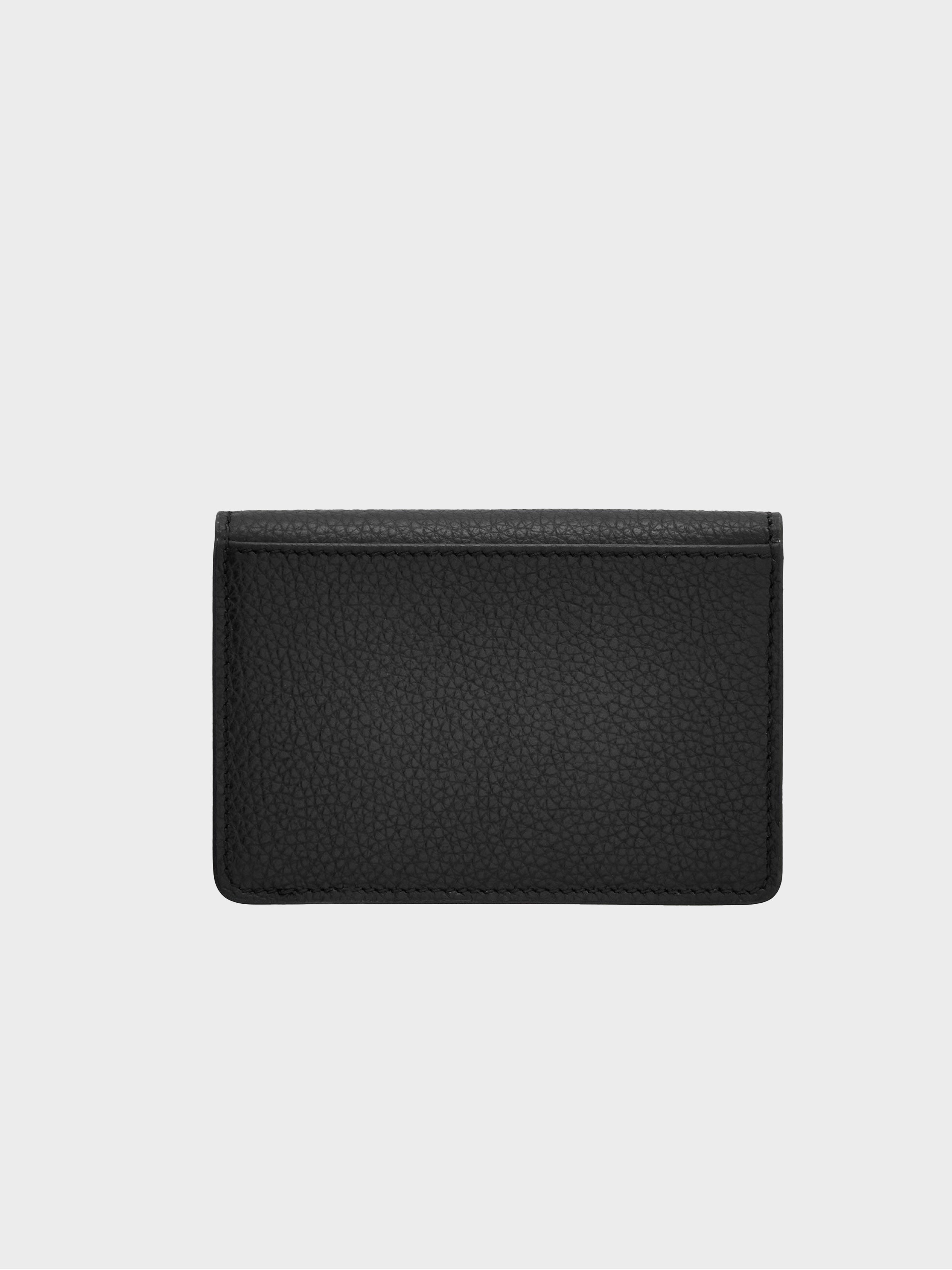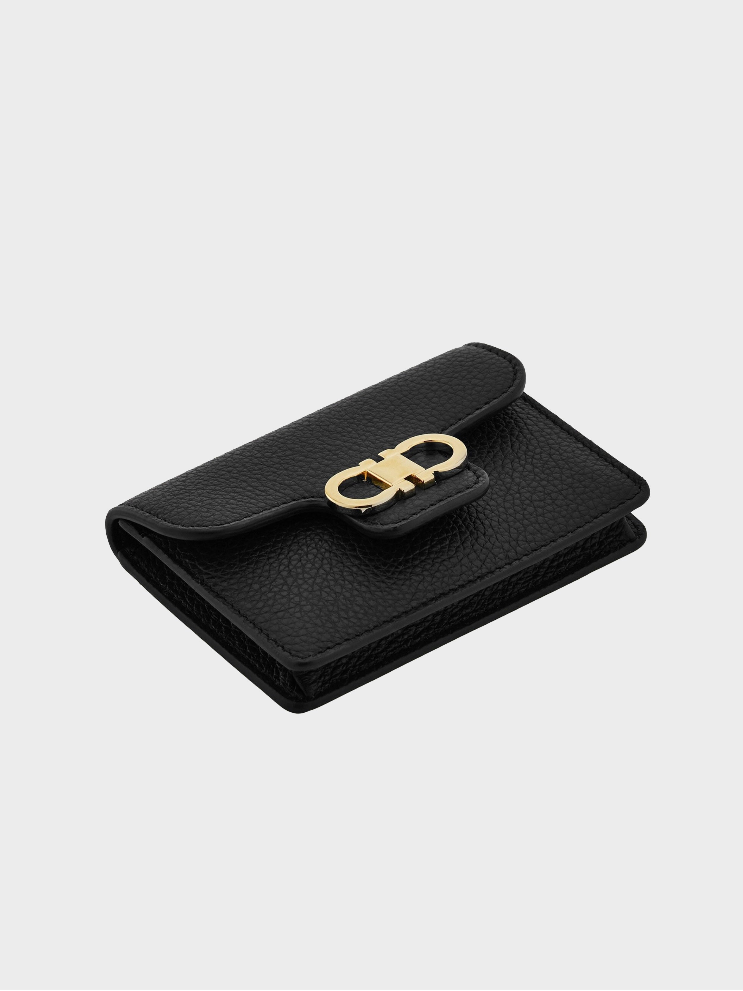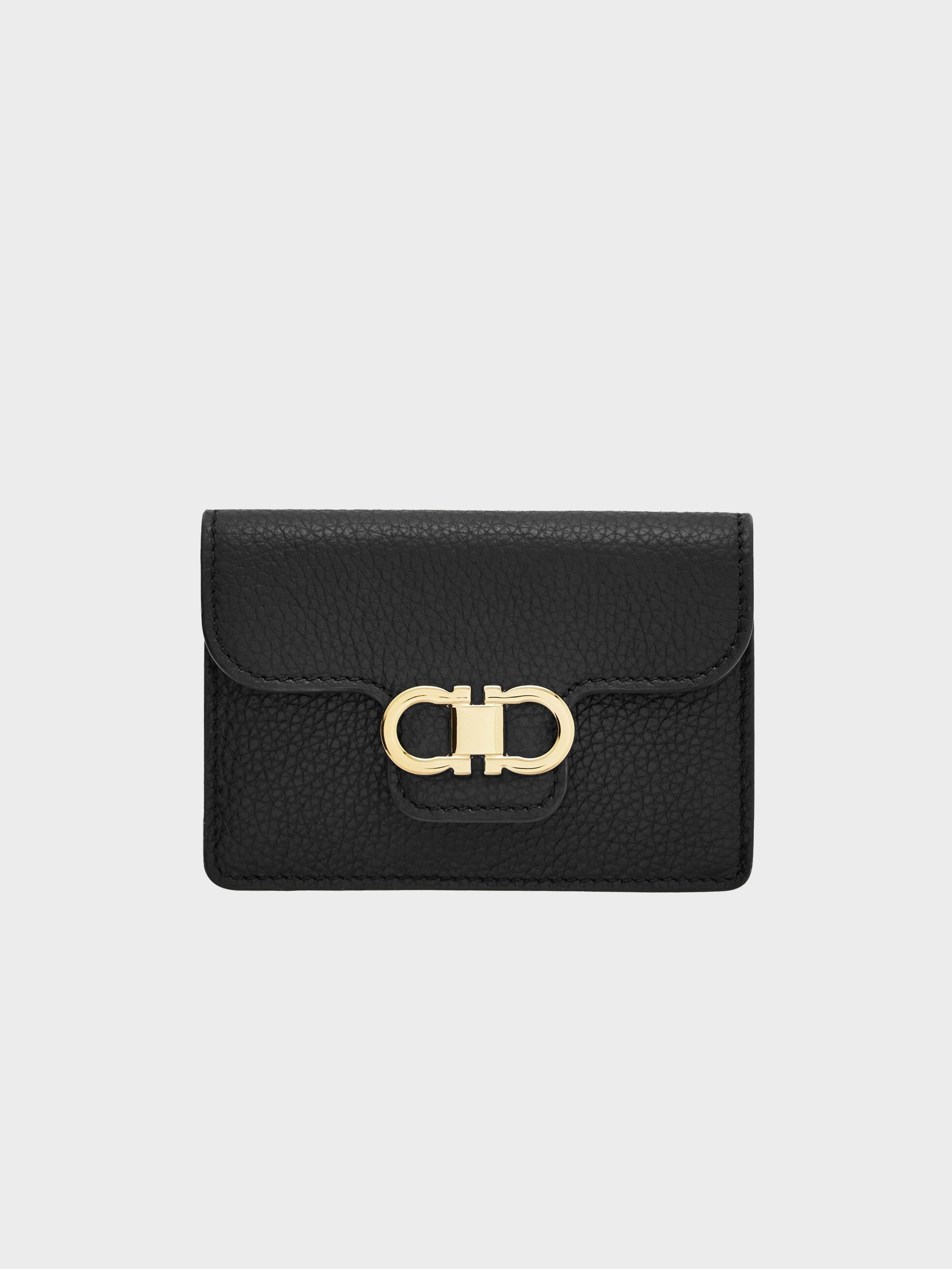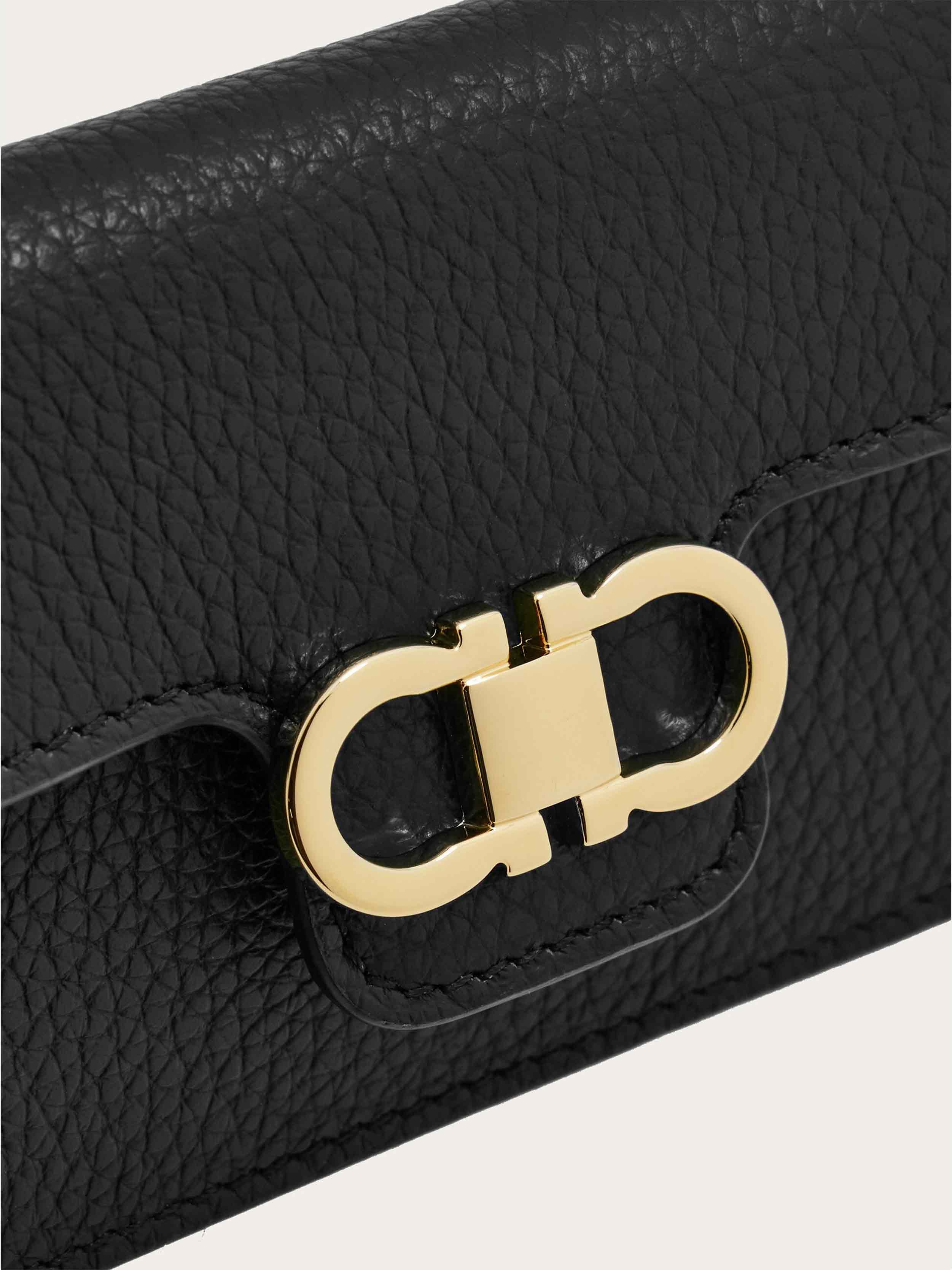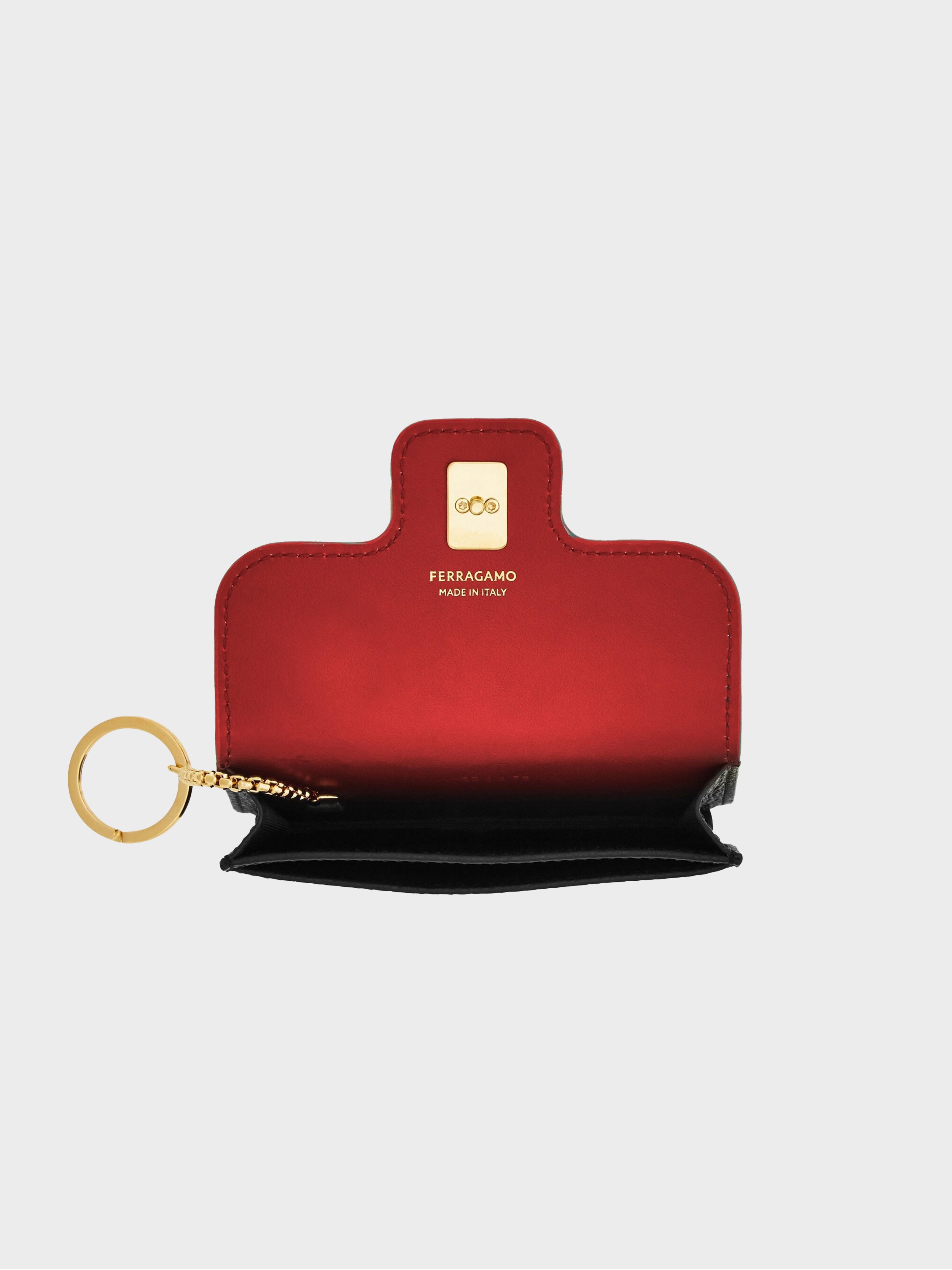• featuring a grained calfskin exterior and a double Gancini detail on the closure. Inside, a metal chain and key ring offer practical storage, while a small card slot adds extra functionality