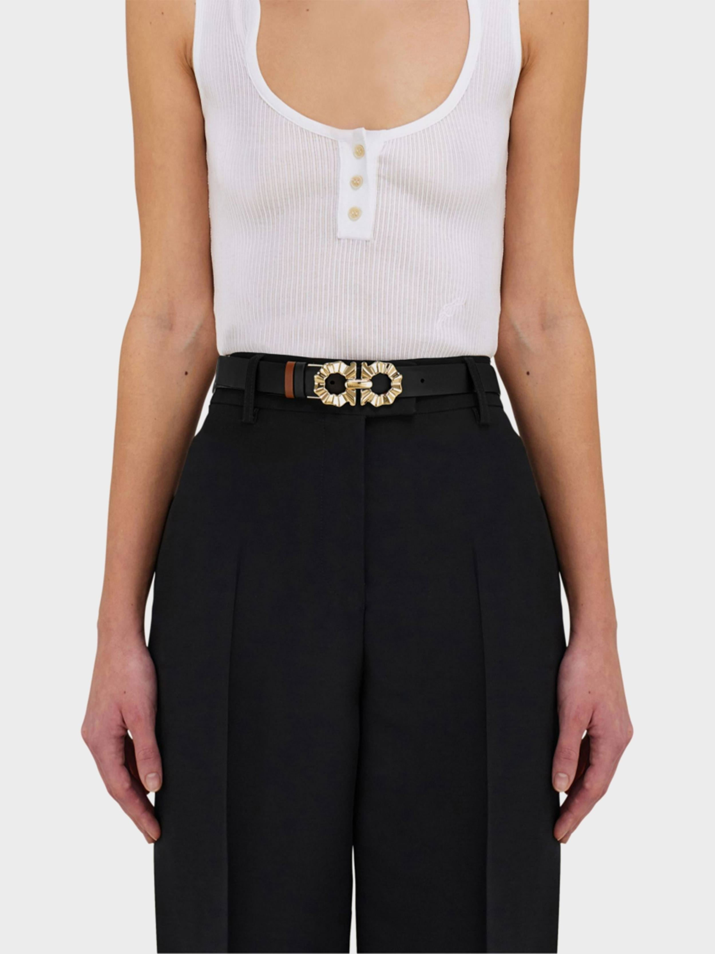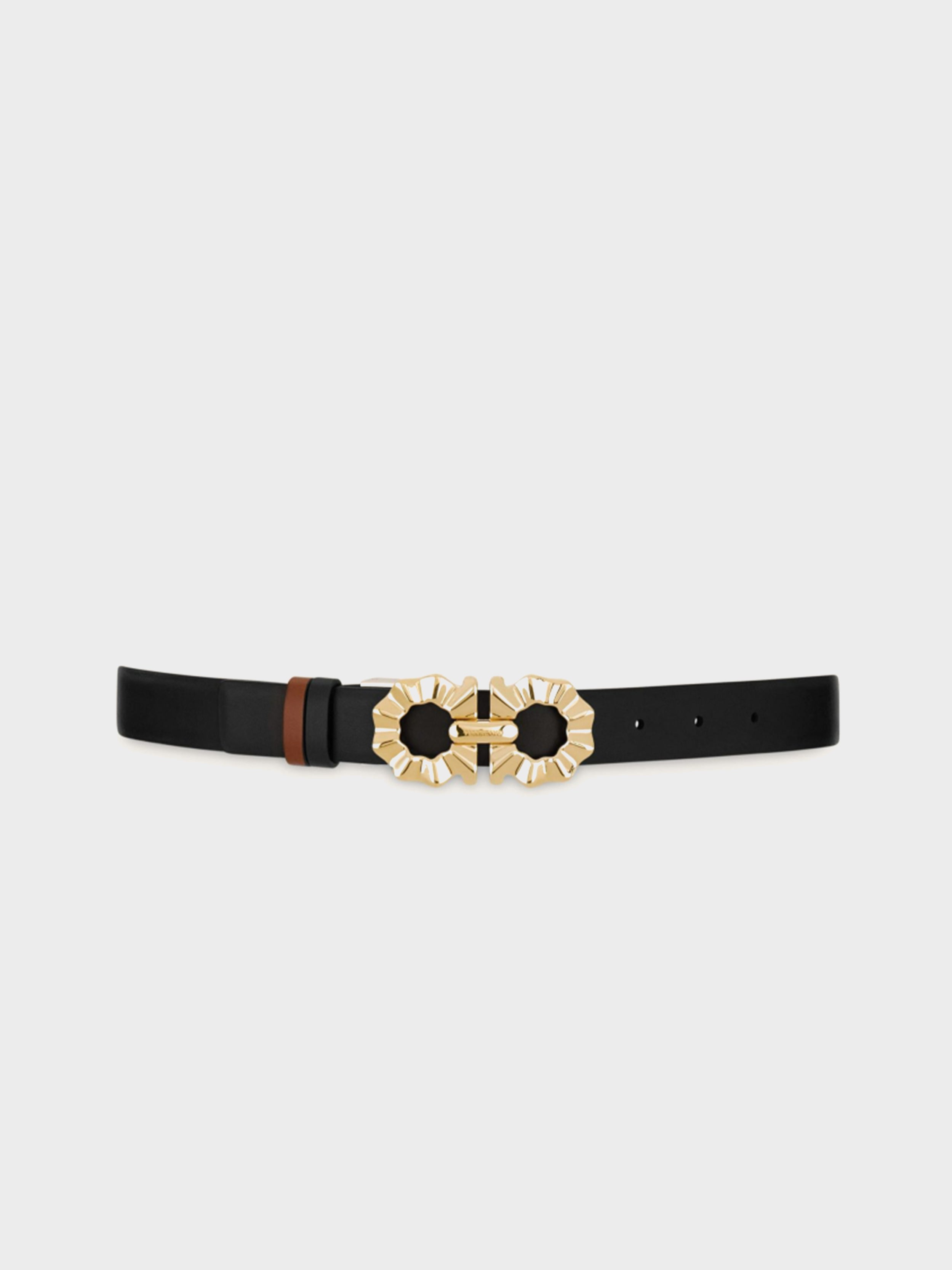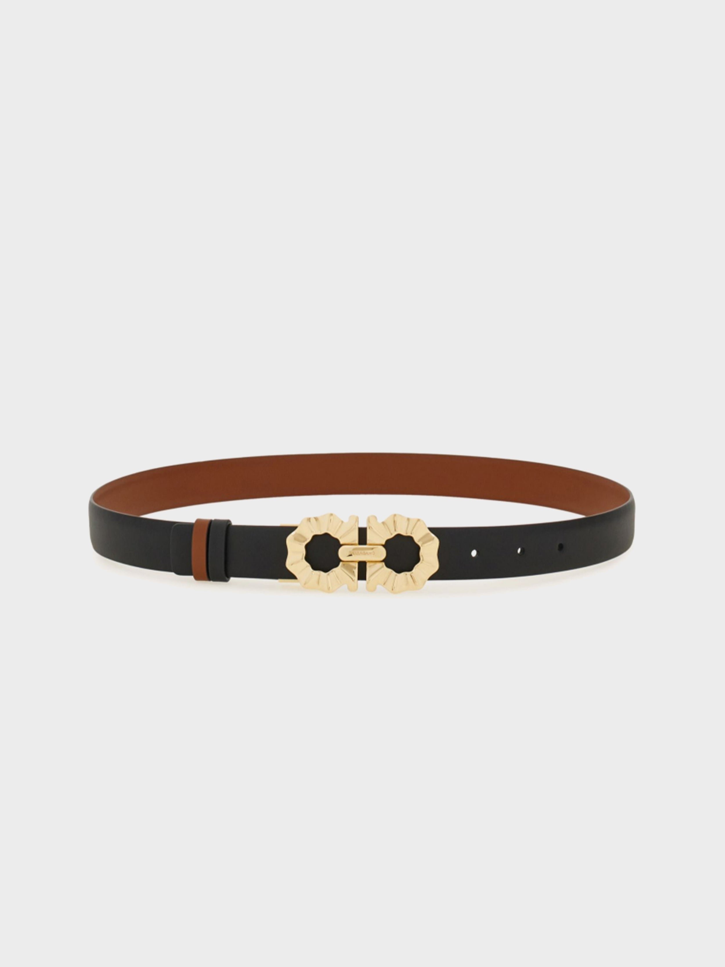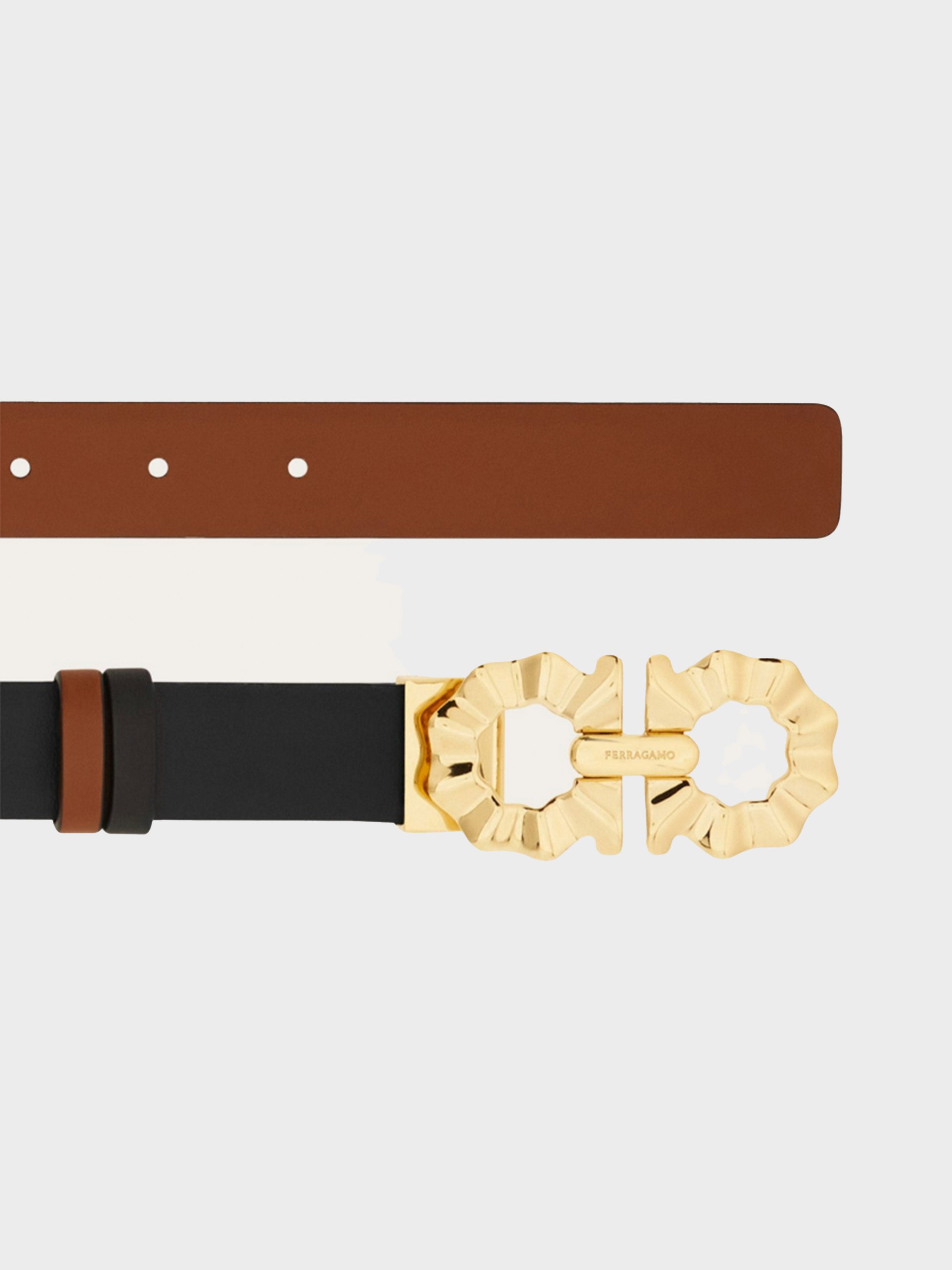 • This belt, featuring a double-sided, two-tone design, embodies the Ferragamo spirit with a feminine touch. The Gancini buckle features a sculptural texture inspired by the delicate pleats of fabric. The adjustable length allows for a tailored fit. For more information, please consult our size guide.