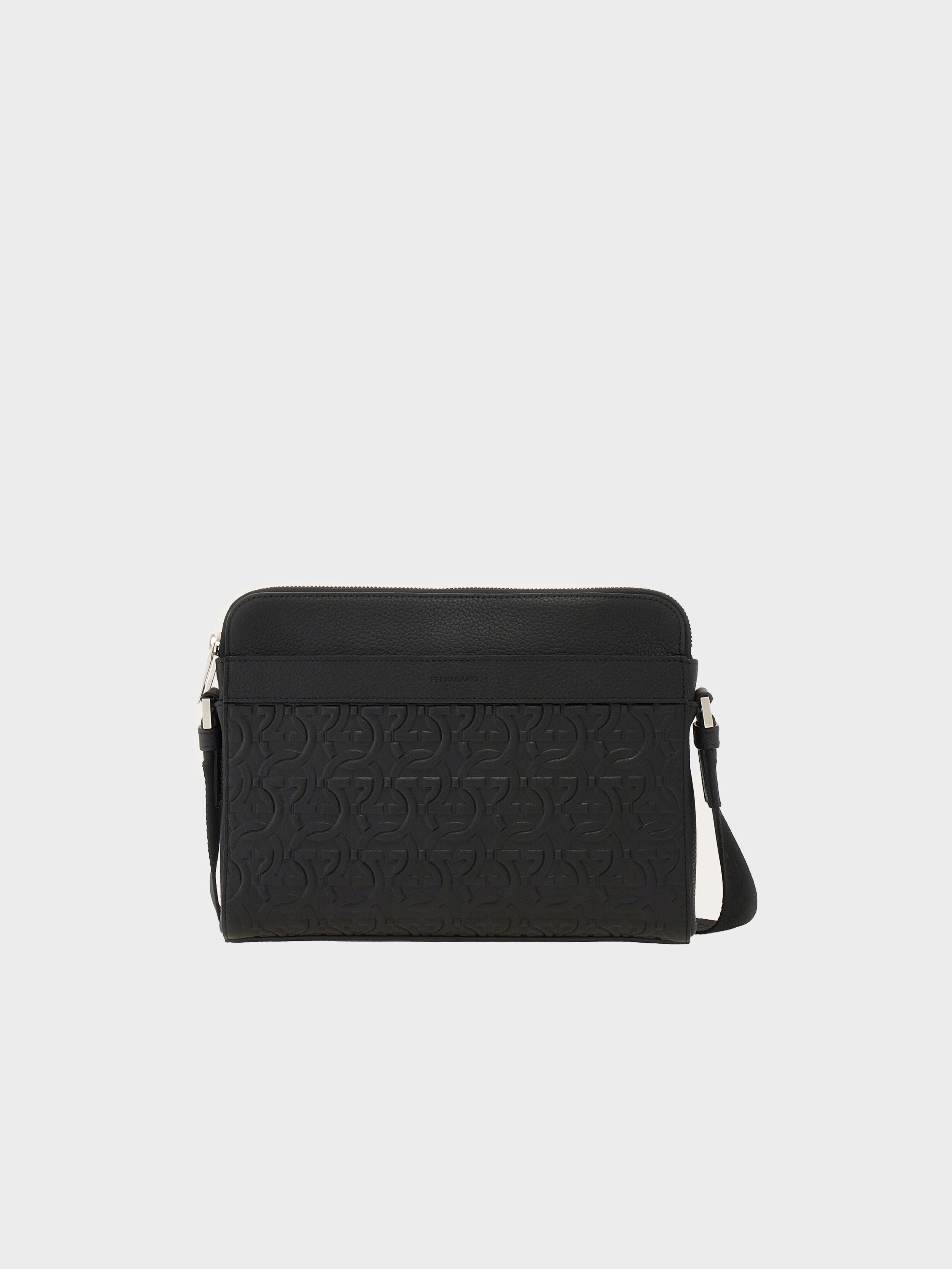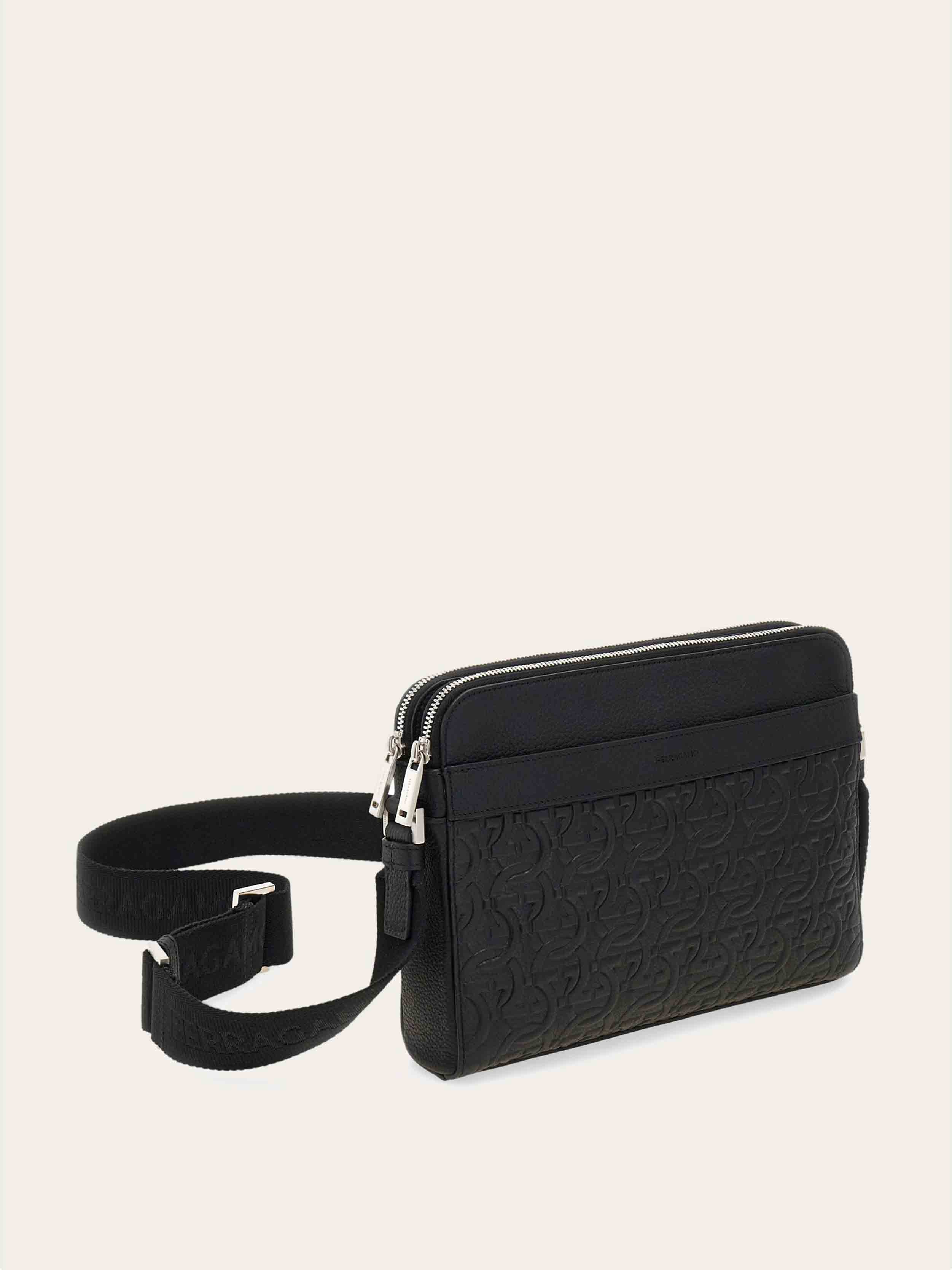 • This versatile crossbody bag comes crafted in hammered calfskin with Gancini-patterned embossing adorning the front panel. The structure features two compartments with metal zip fastening and a central flat pocket secured by a magnet, perfect for holding personal items. The adjustable jacquard tape shoulder strap flaunts tonal lettering embellishment.