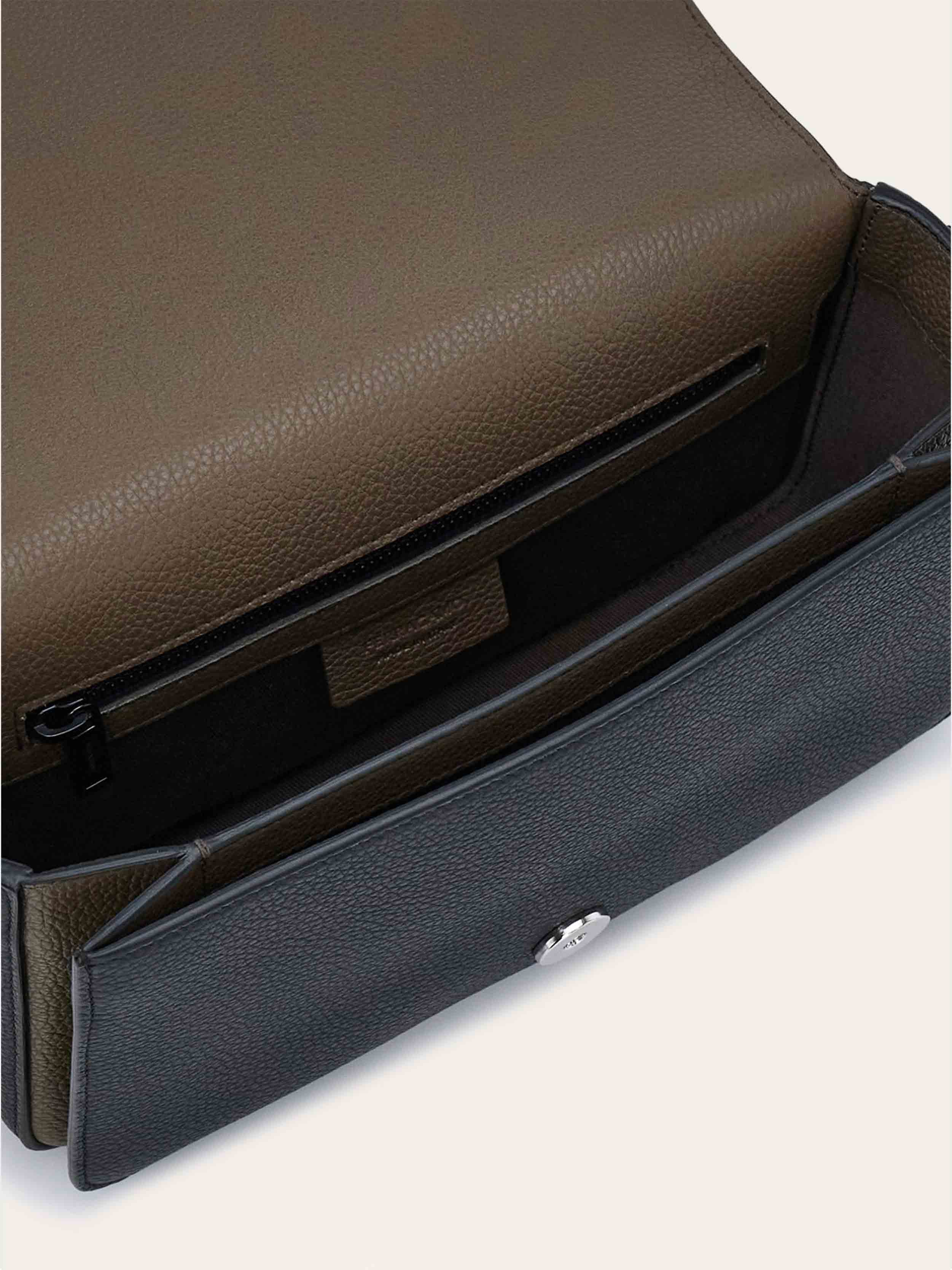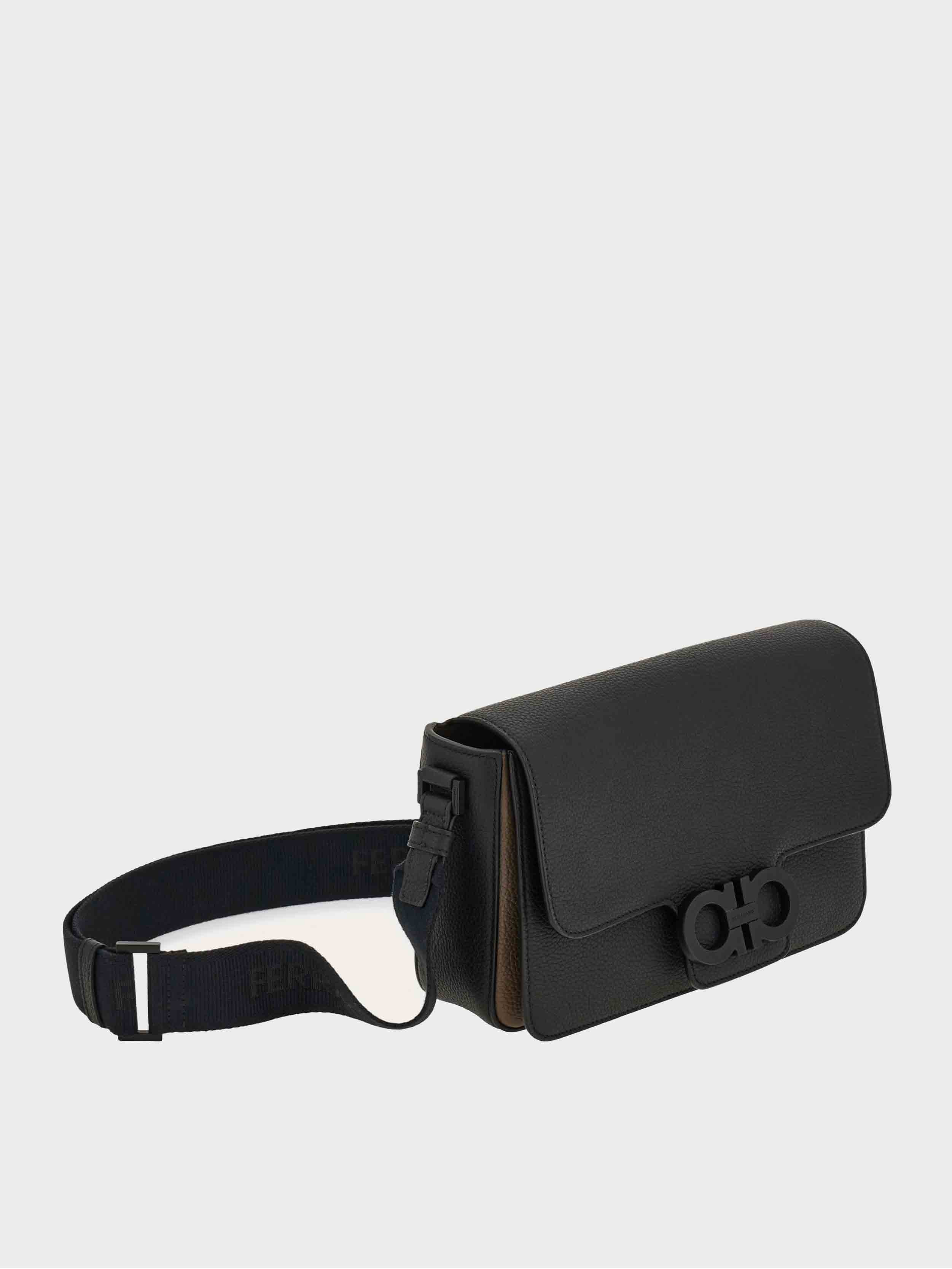 • The matte Gancio buckle on the front flap of this new Ferragamo messenger sets the tone for this luxurious accessory with an urban appeal. The two compartments in the lined interior are accompanied by a central zip slot, and the custom jacquard strap can be adjusted in length.