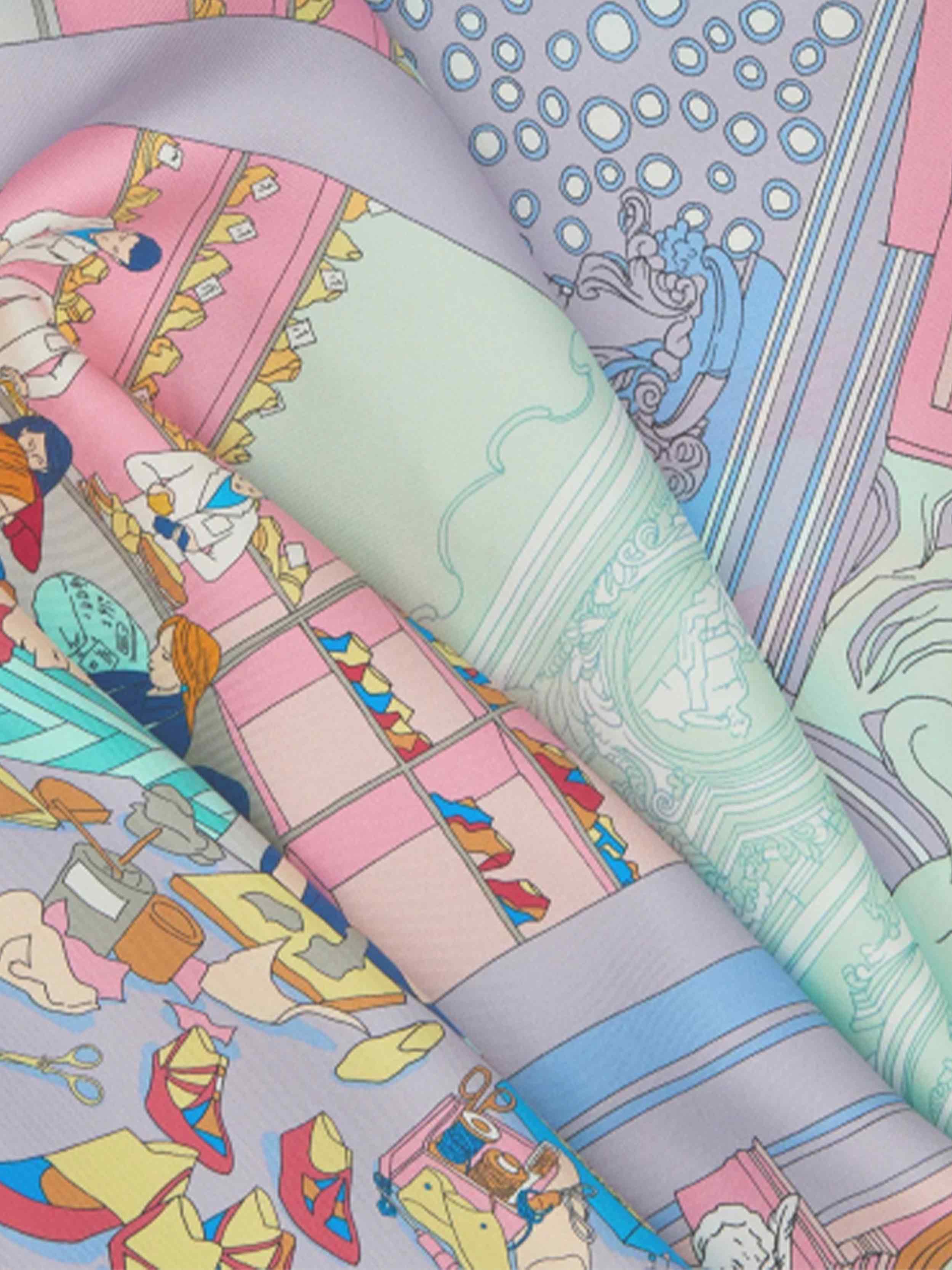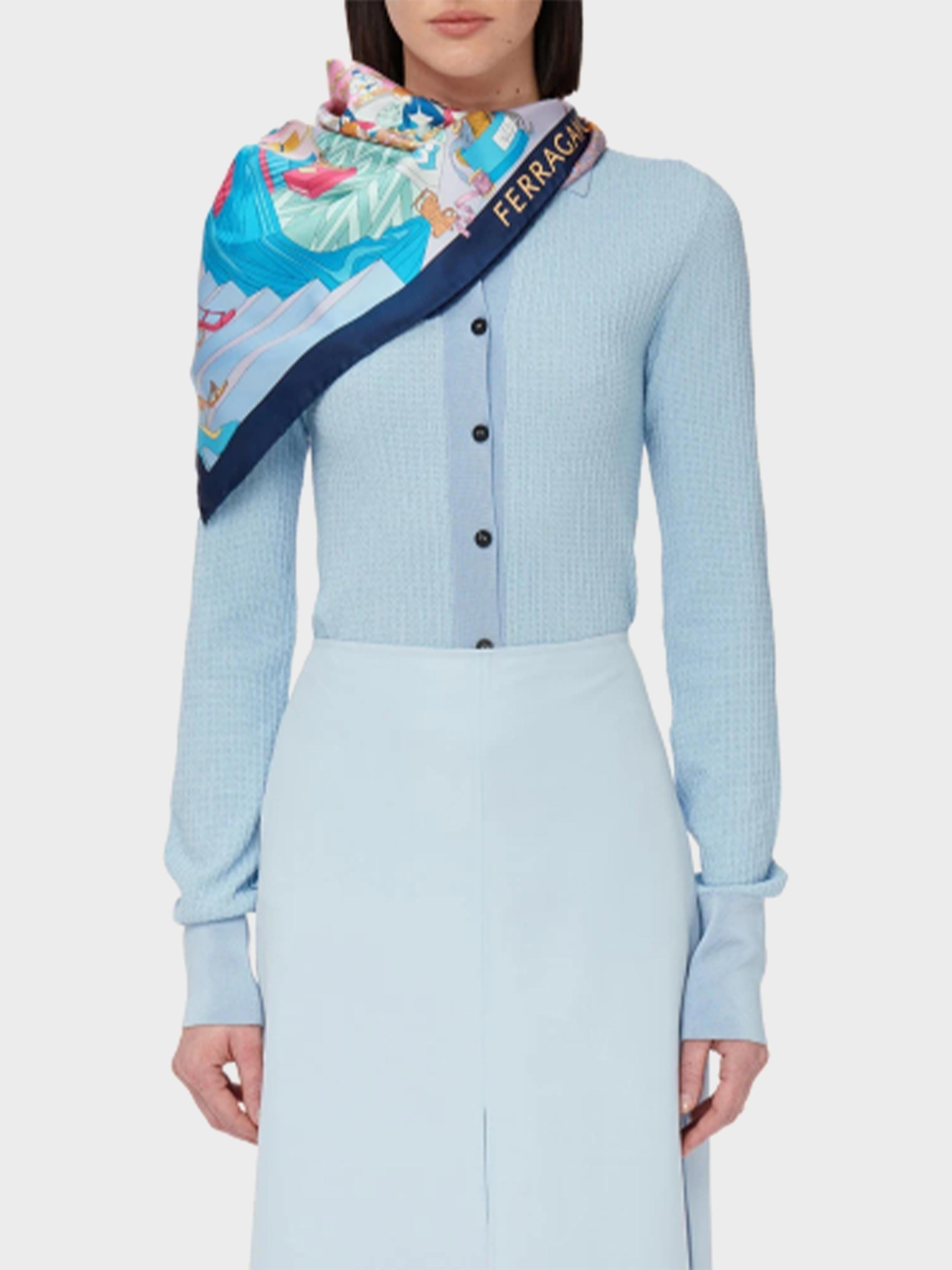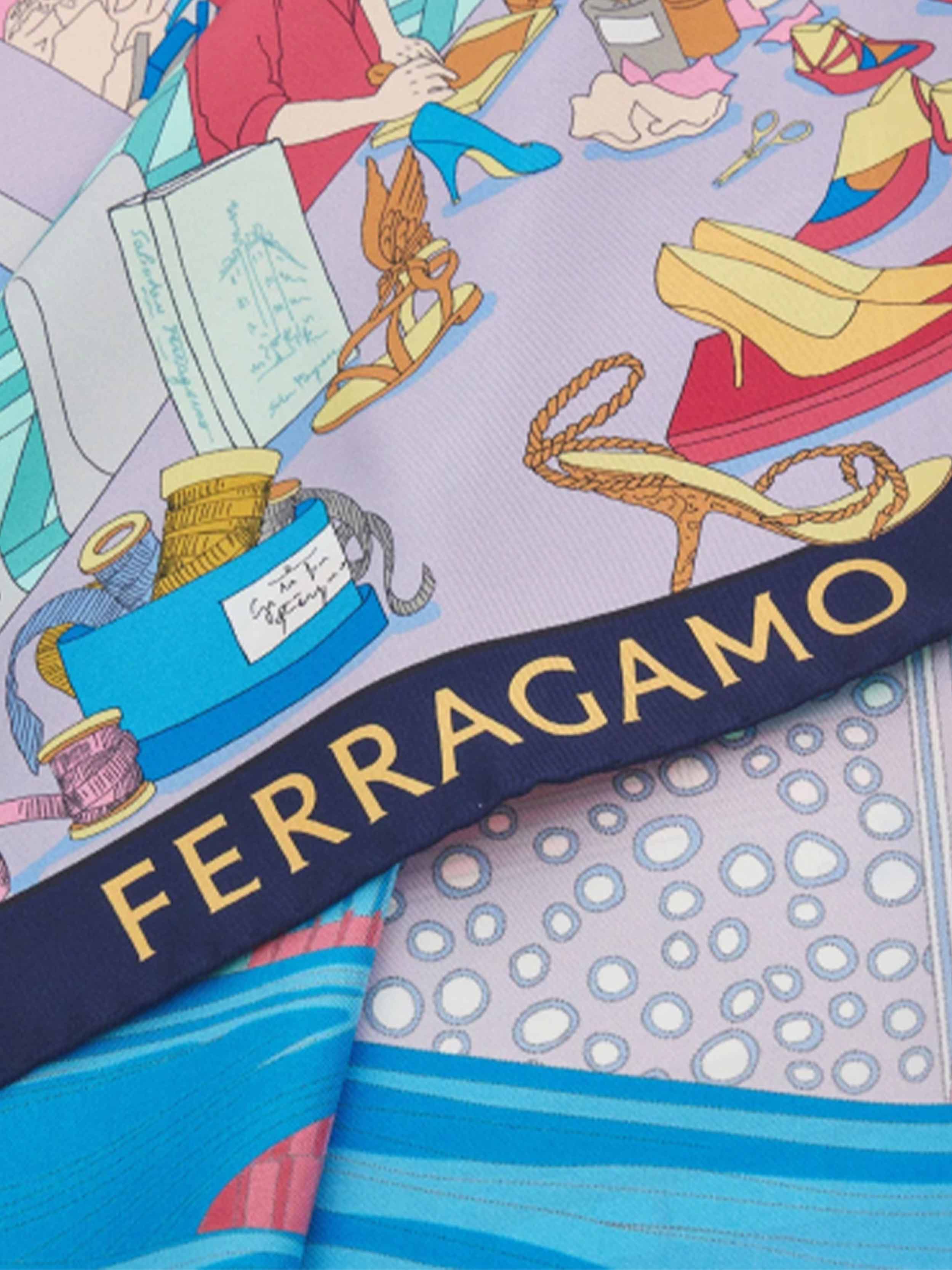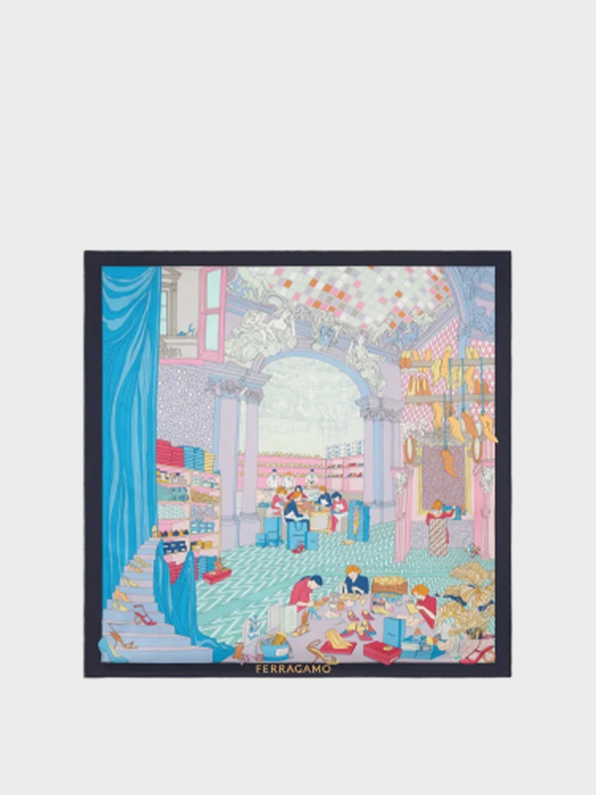 • Part of a graphic narrative that began a few seasons ago, this scarf features a multicolor print inspired by the Ferragamo world. Like a Renaissance painting, the scene is depicted with a wealth of detail: brand symbols, the shapes of Marilyn Monroe's shoes and the contrast between archival and new packaging are just some of the elements that make it a true tableau vivant to be explored at leisure.