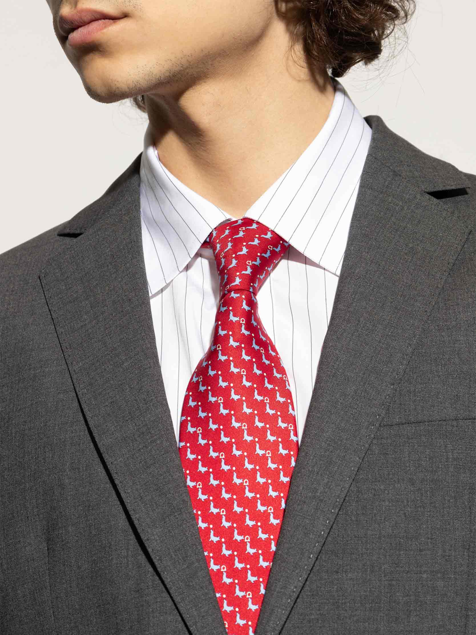 • Silk tie by Ferragamo is the embodiment of exquisite Italian design and masterful craftsmanship. The classic cut is enhanced by a chic detail: a repeating motif of miniature, stylized blue dogs with collars set against a striking red background.