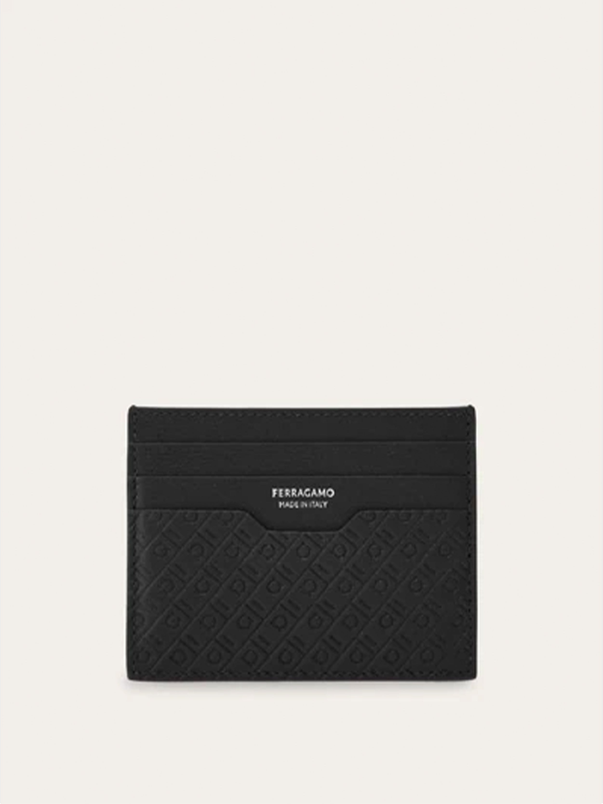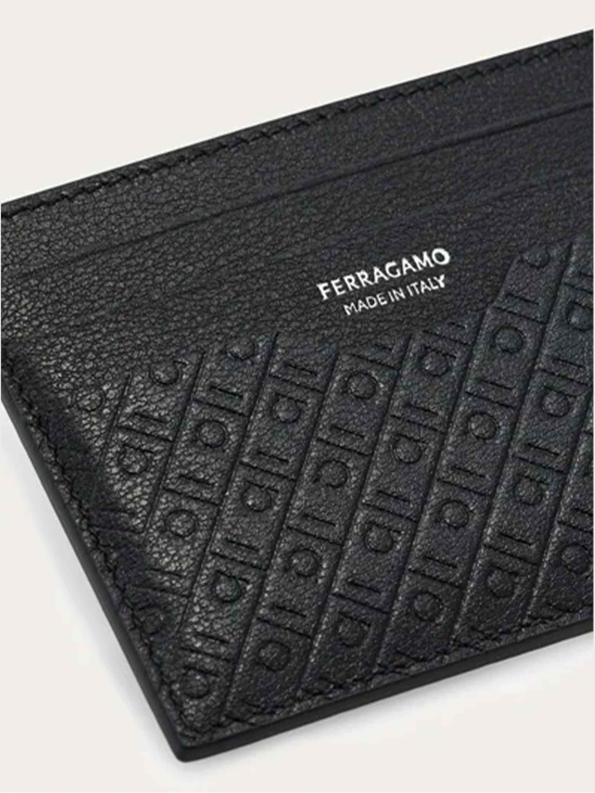 • Compact and functional, this credit card holder alternates smooth calfskin details with embossed panels decorated with the Ferragamo monogram. Slots on both sides ensure perfect functionality.