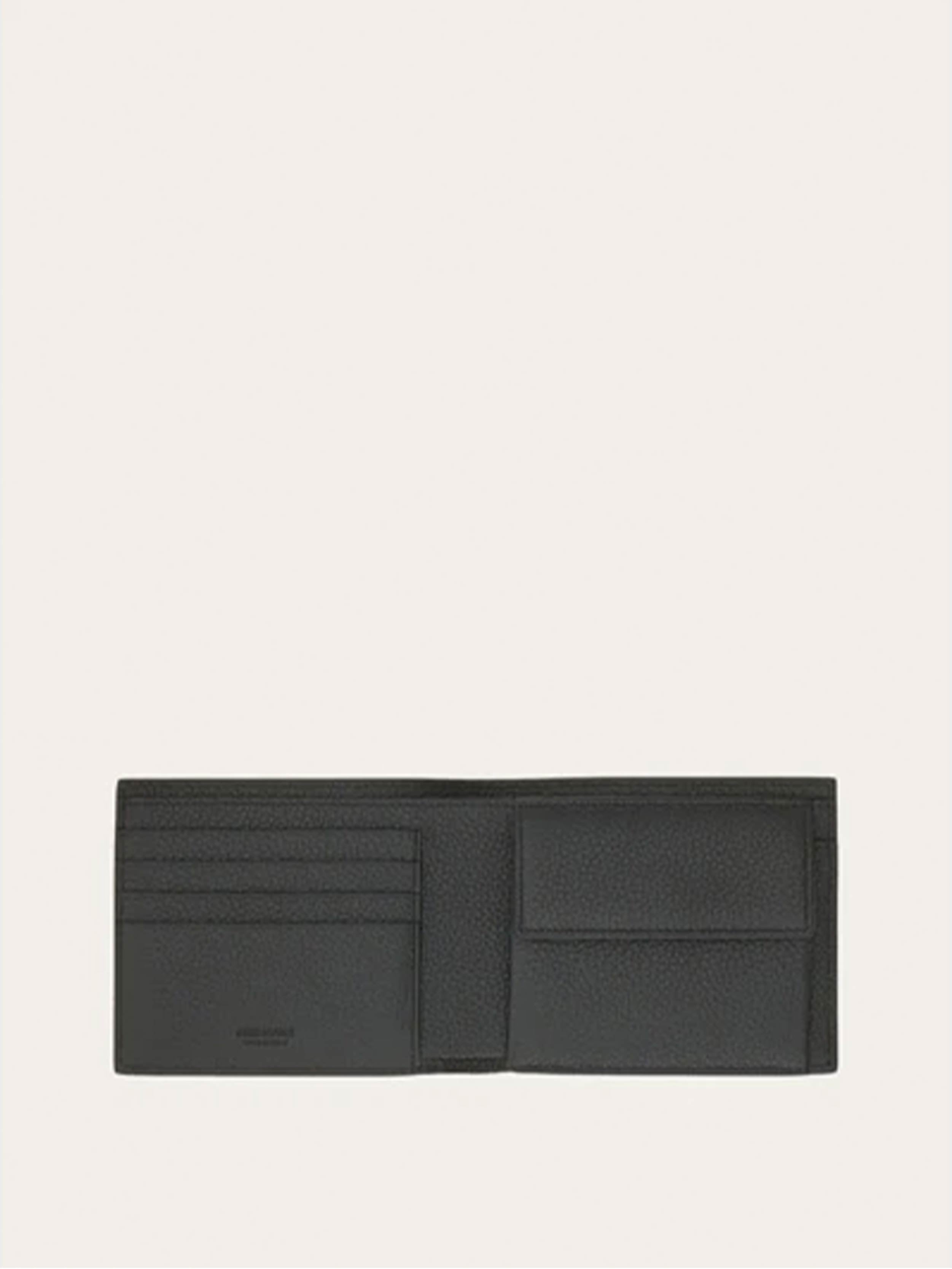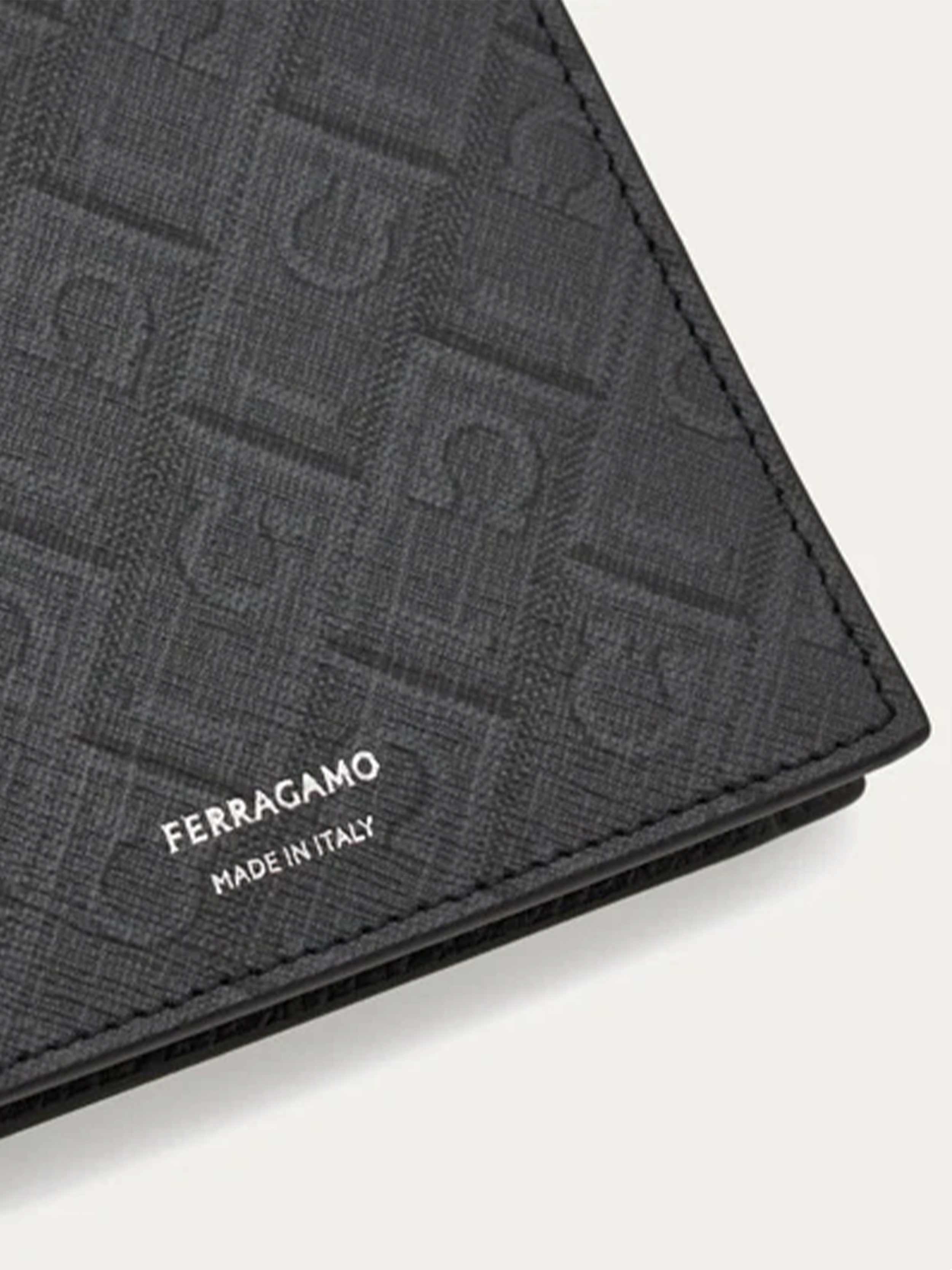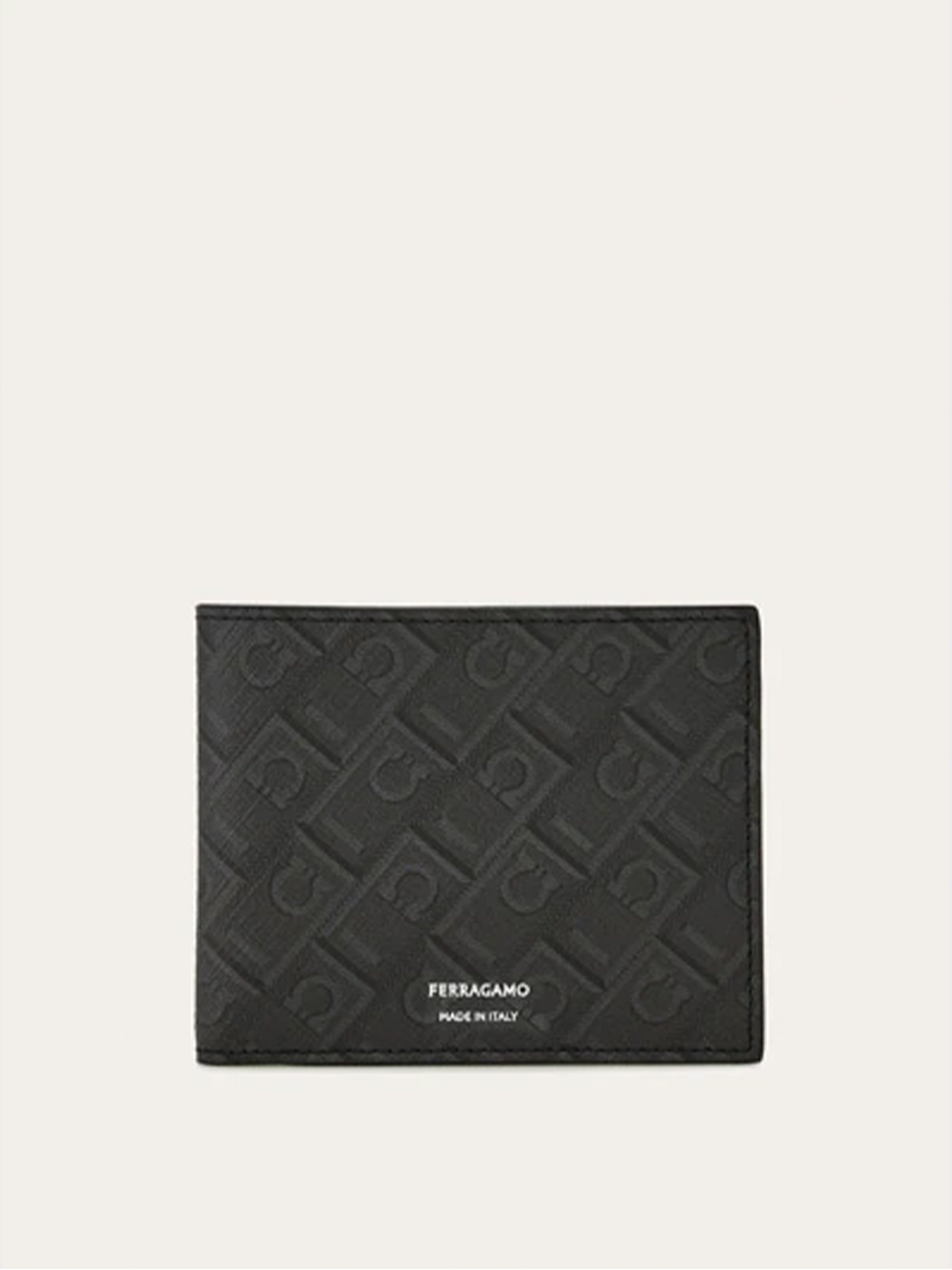 • New metropolitan proposal for the Ferragamo wallet, with hammered calfskin interior and coated fabric exterior, printed with the Ferragamo monogram. The structure features compartments, flat pockets, slots and a practical button coin pocket.