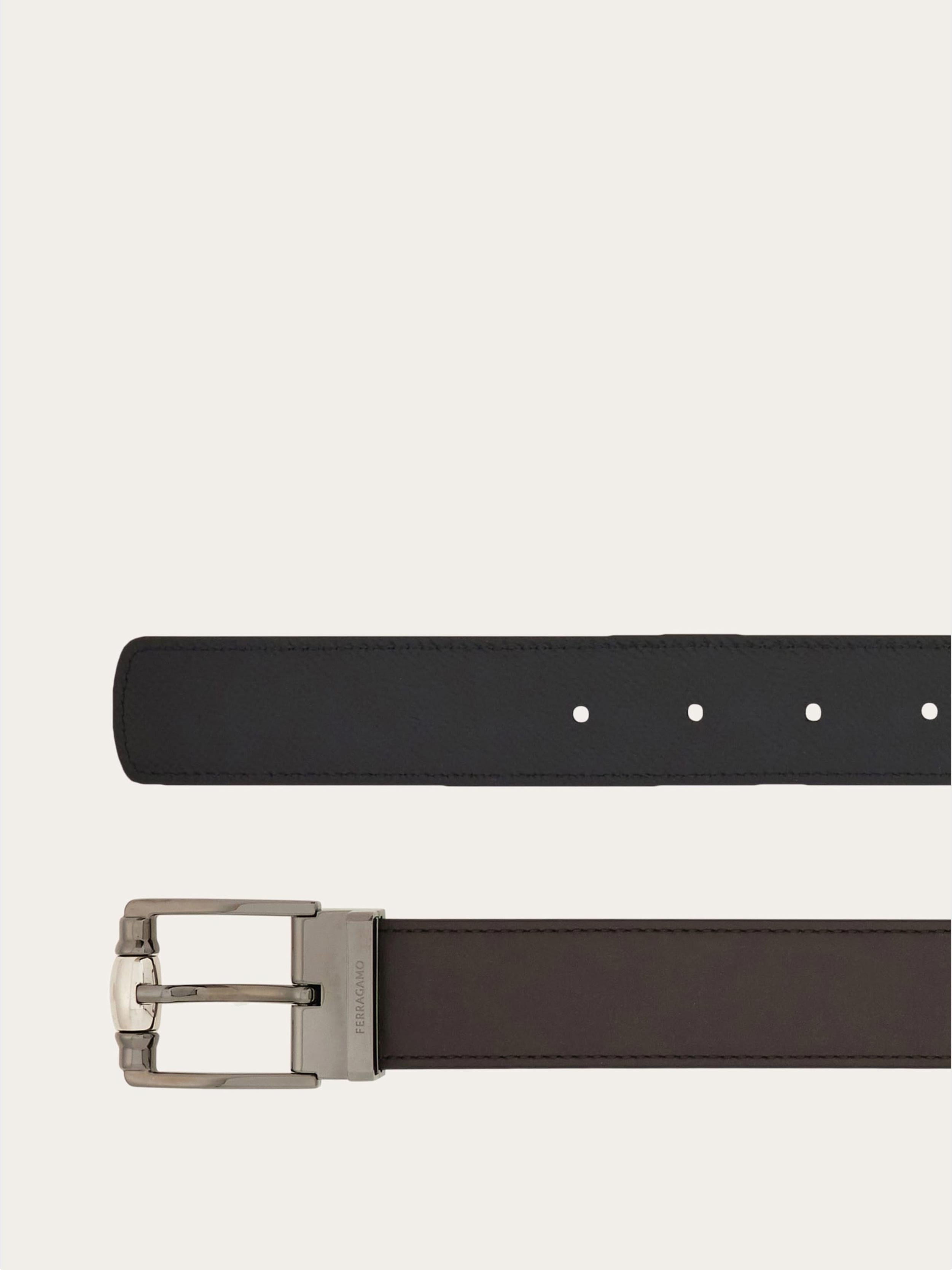 • The elegant buckle of this new Ferragamo belt sets a sophisticated tone. The calfskin shaft is reversible, with a natural texture on one side, and hammered finish on the other for a rich finish that is two belts in one. The length is adjustable. Please see the size guide for further details.