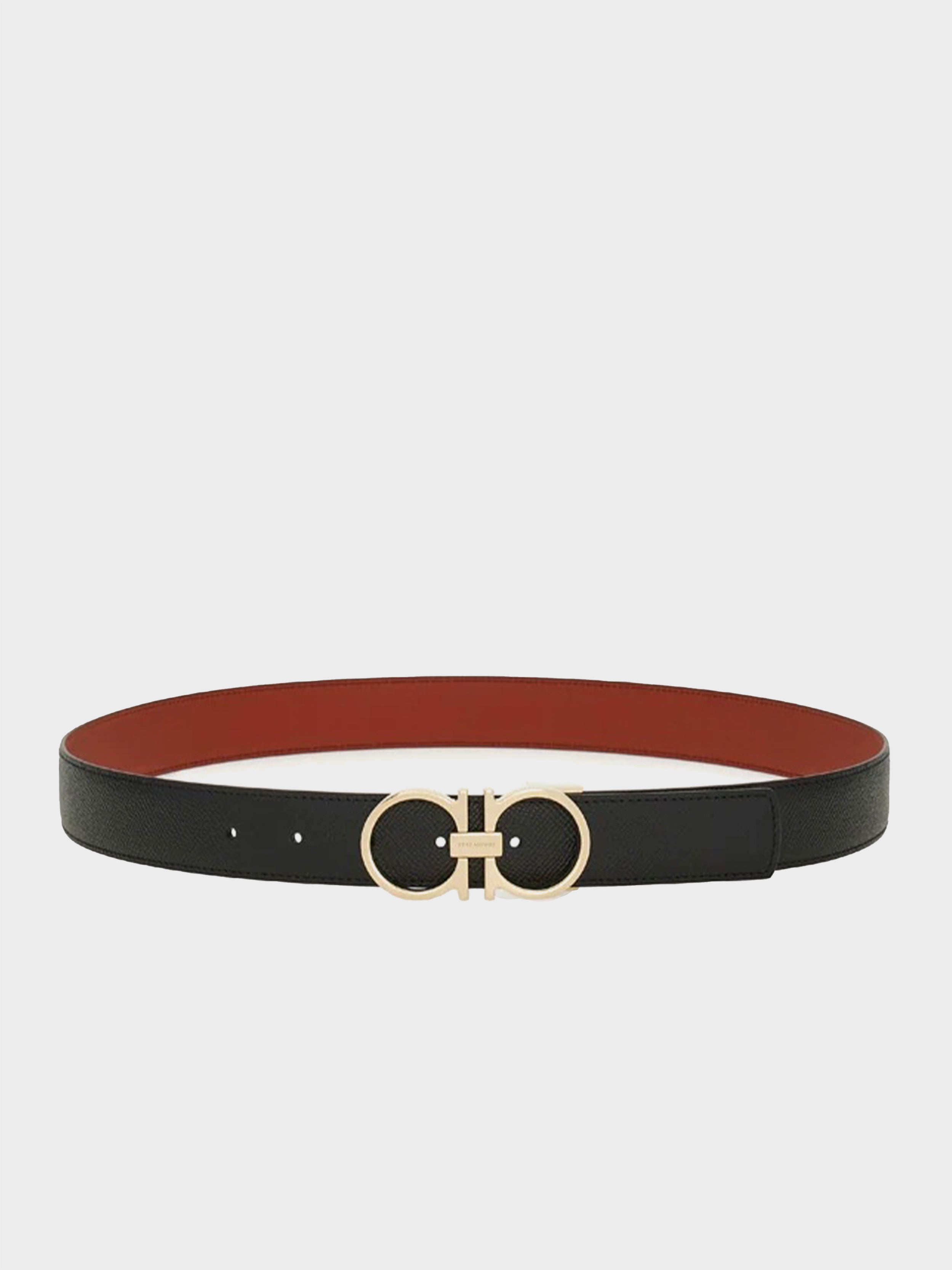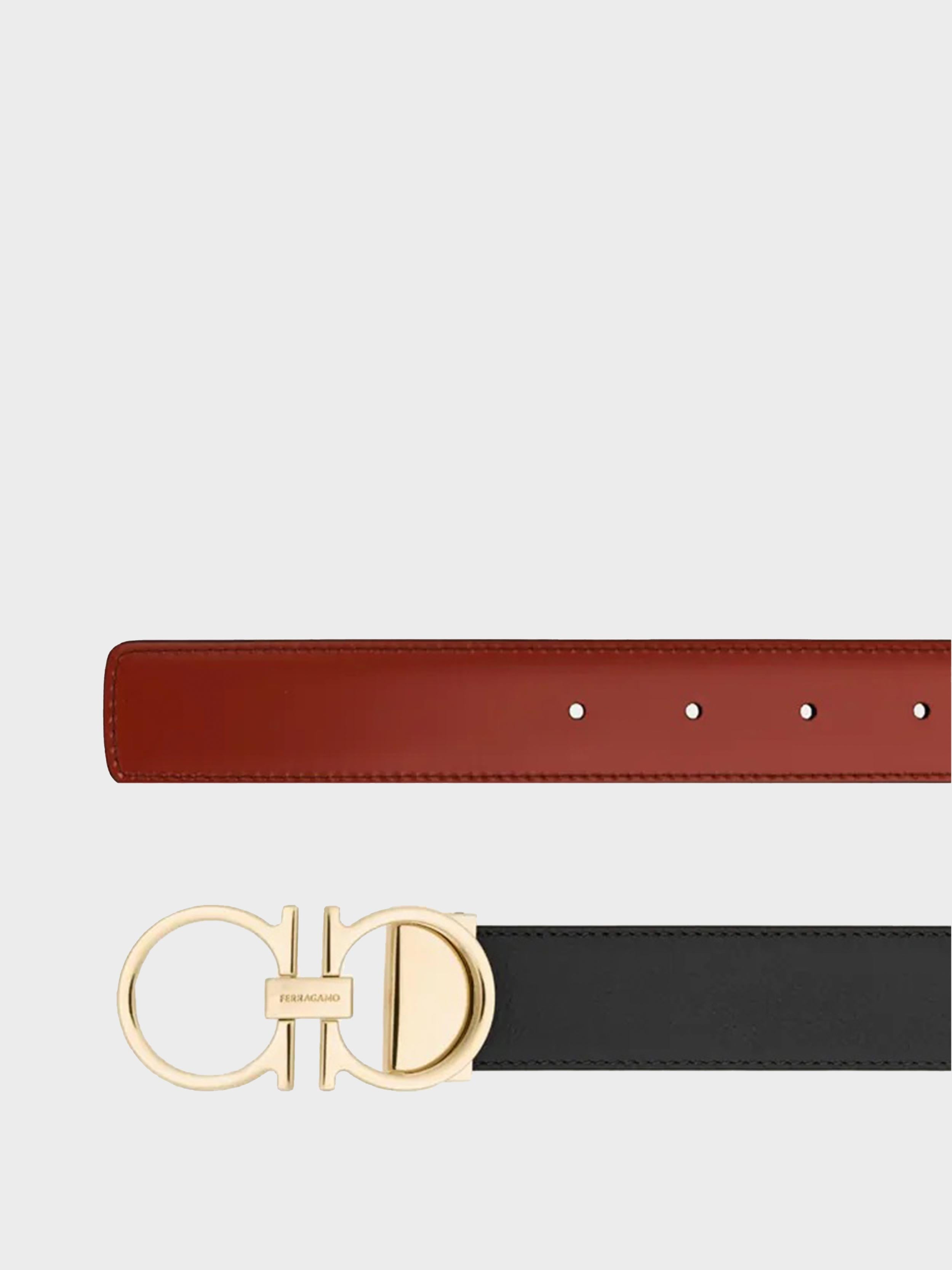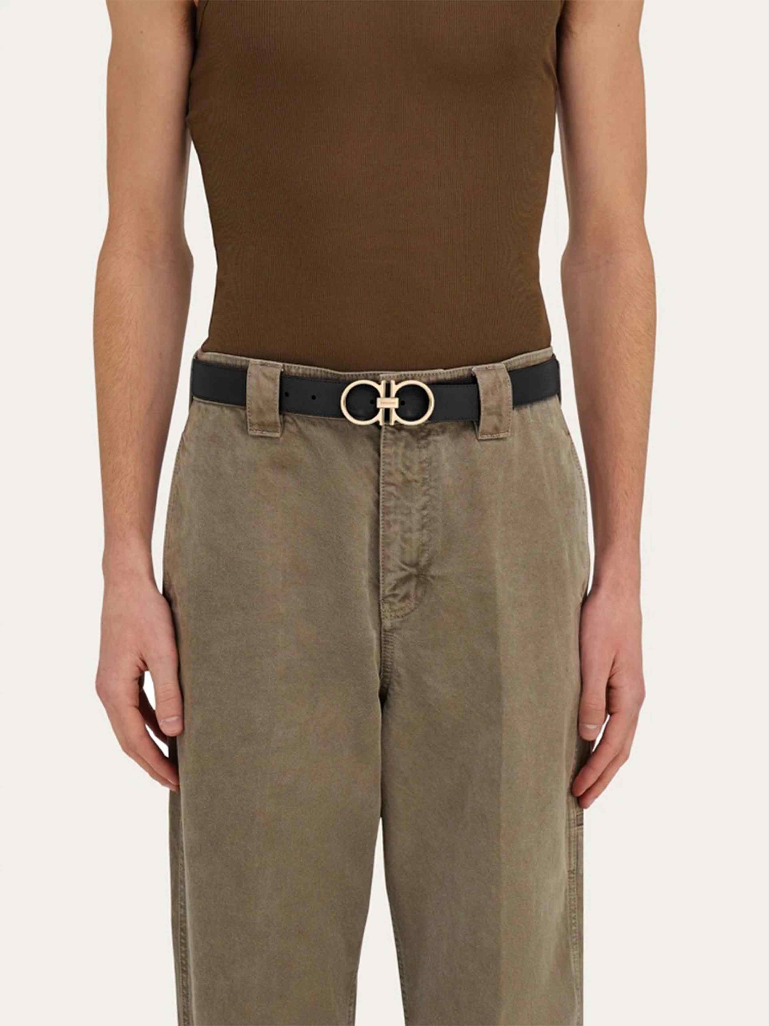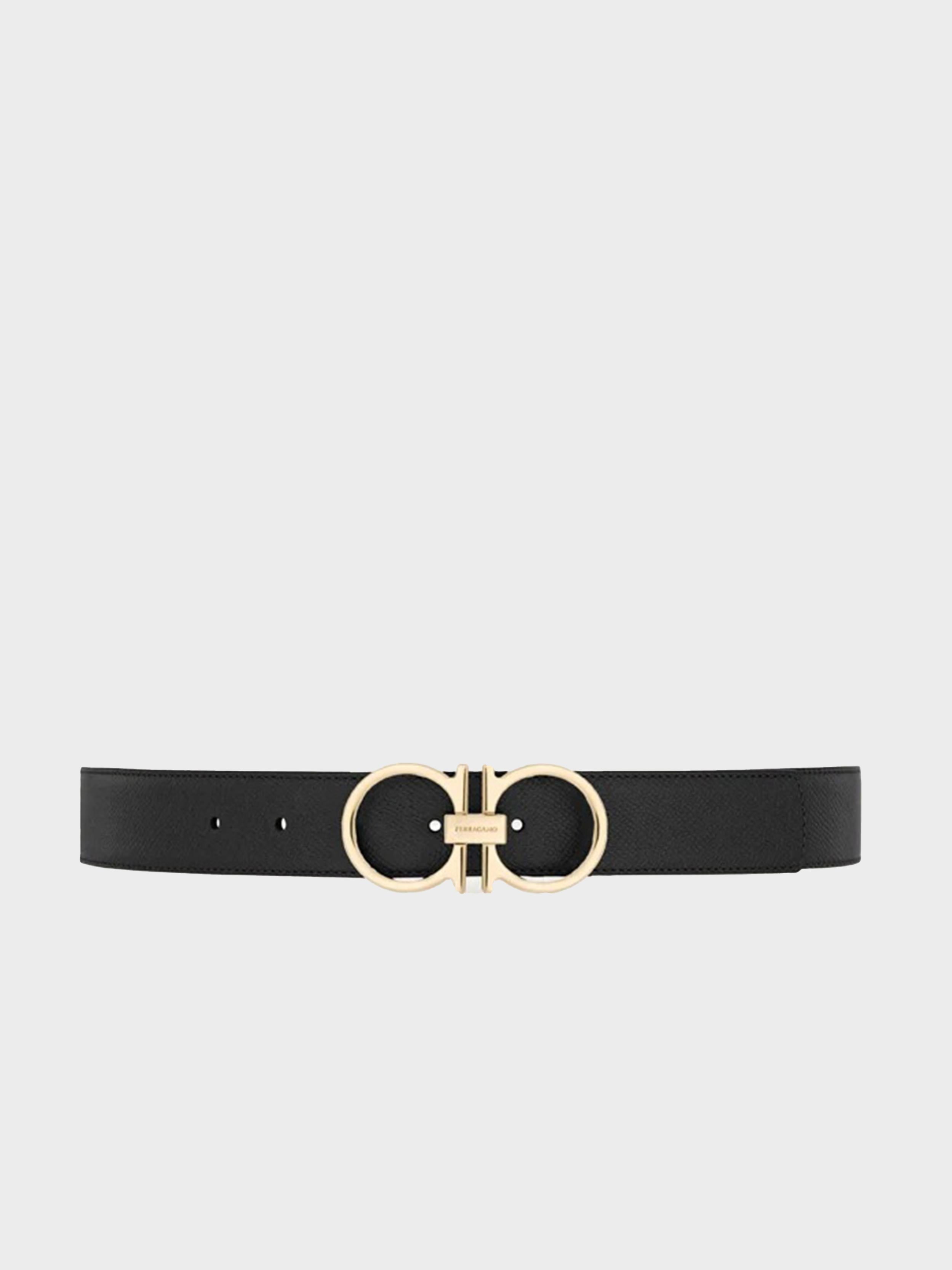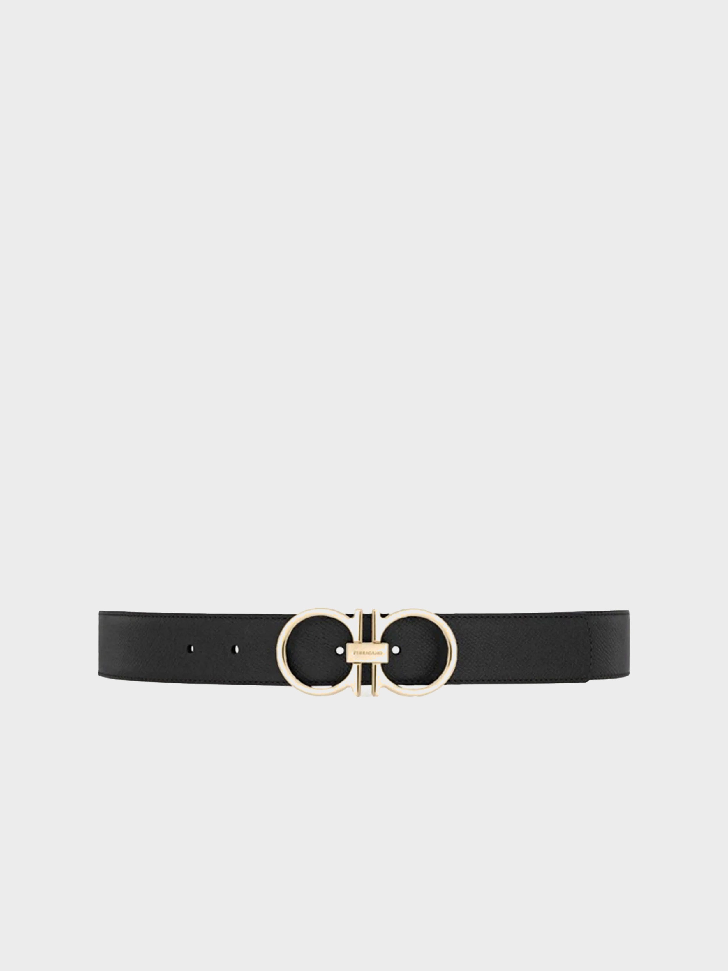 • A new belt with a sleek metropolitan vibe, featuring a reversible two-tone design for effortless versatility. The slim-profile Gancini buckle in a ruthenium finish adds a modern, refined touch. The adjustable length allows for a more personalized fit and style.