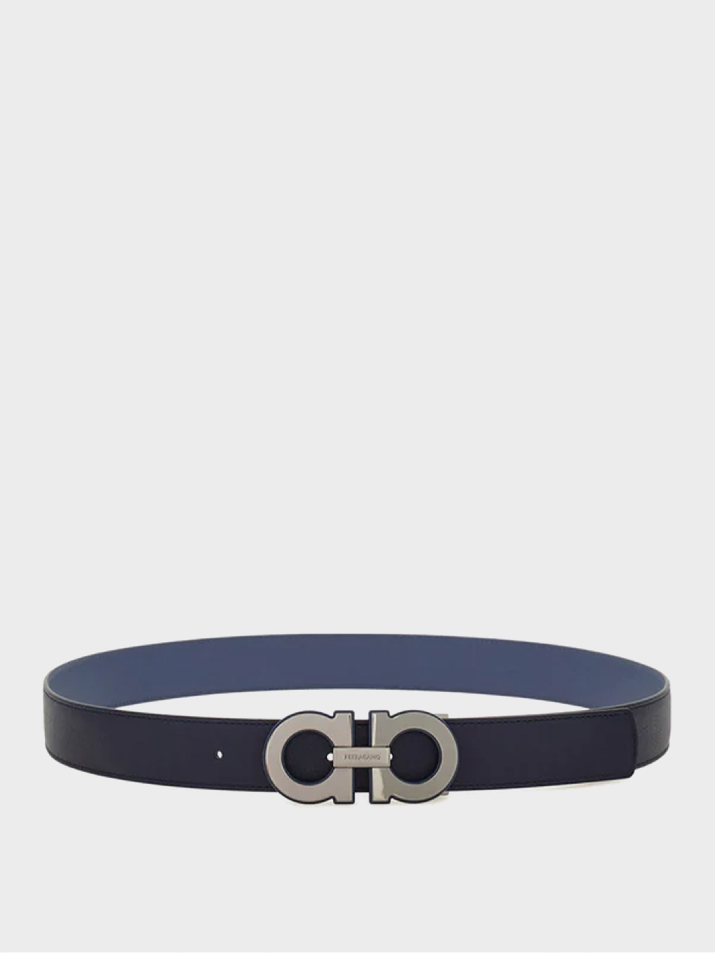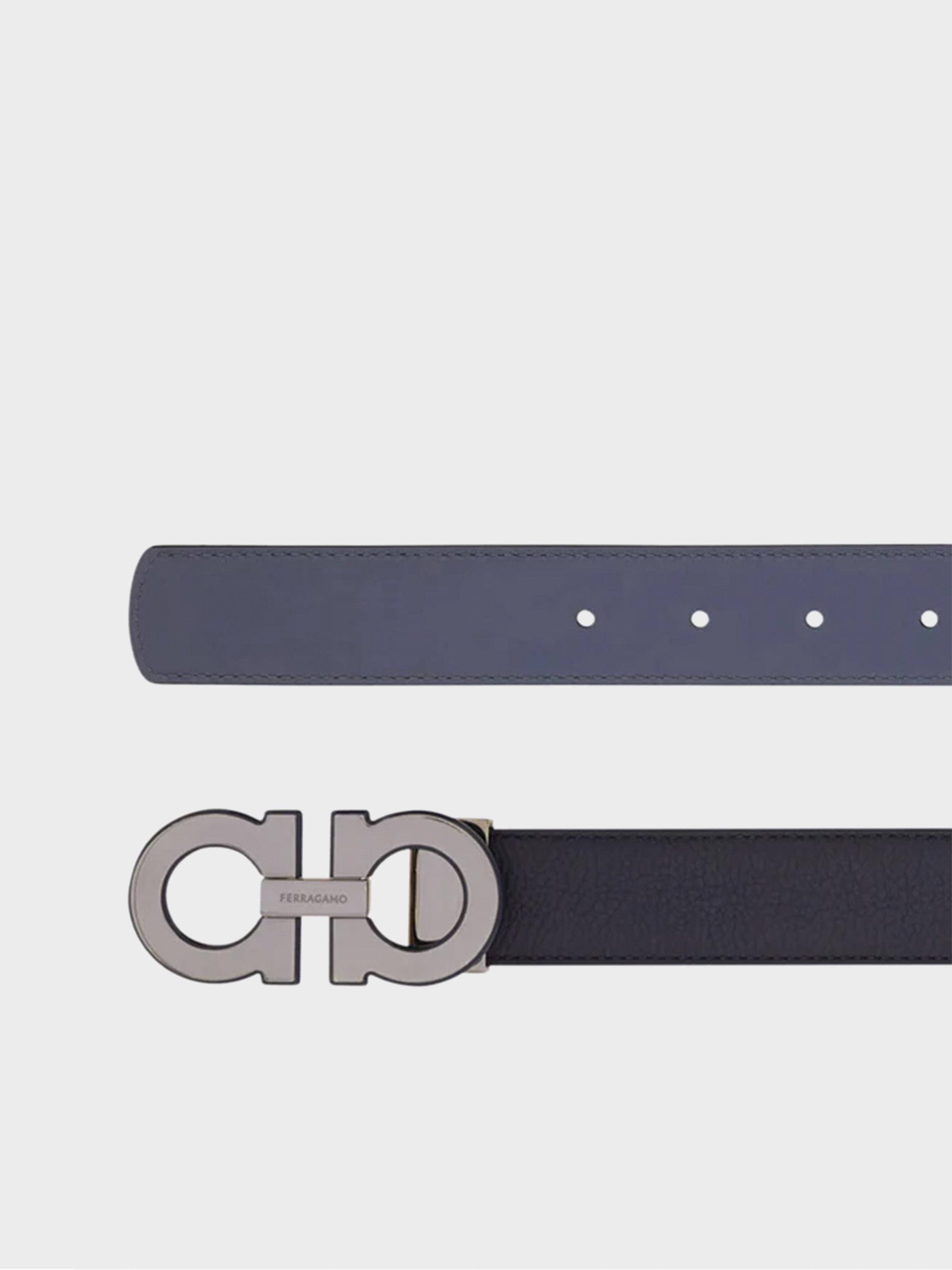 • A contemporary take on the classic Ferragamo belt, featuring contrast stitching for a relaxed feel and a reversible design for ultimate versatility. The ruthenium Gancini buckle is accented with a contrasting palladium border for a refined finish. The adjustable length allows for a more personalized fit and style. We invite you to check our size guide for more information.