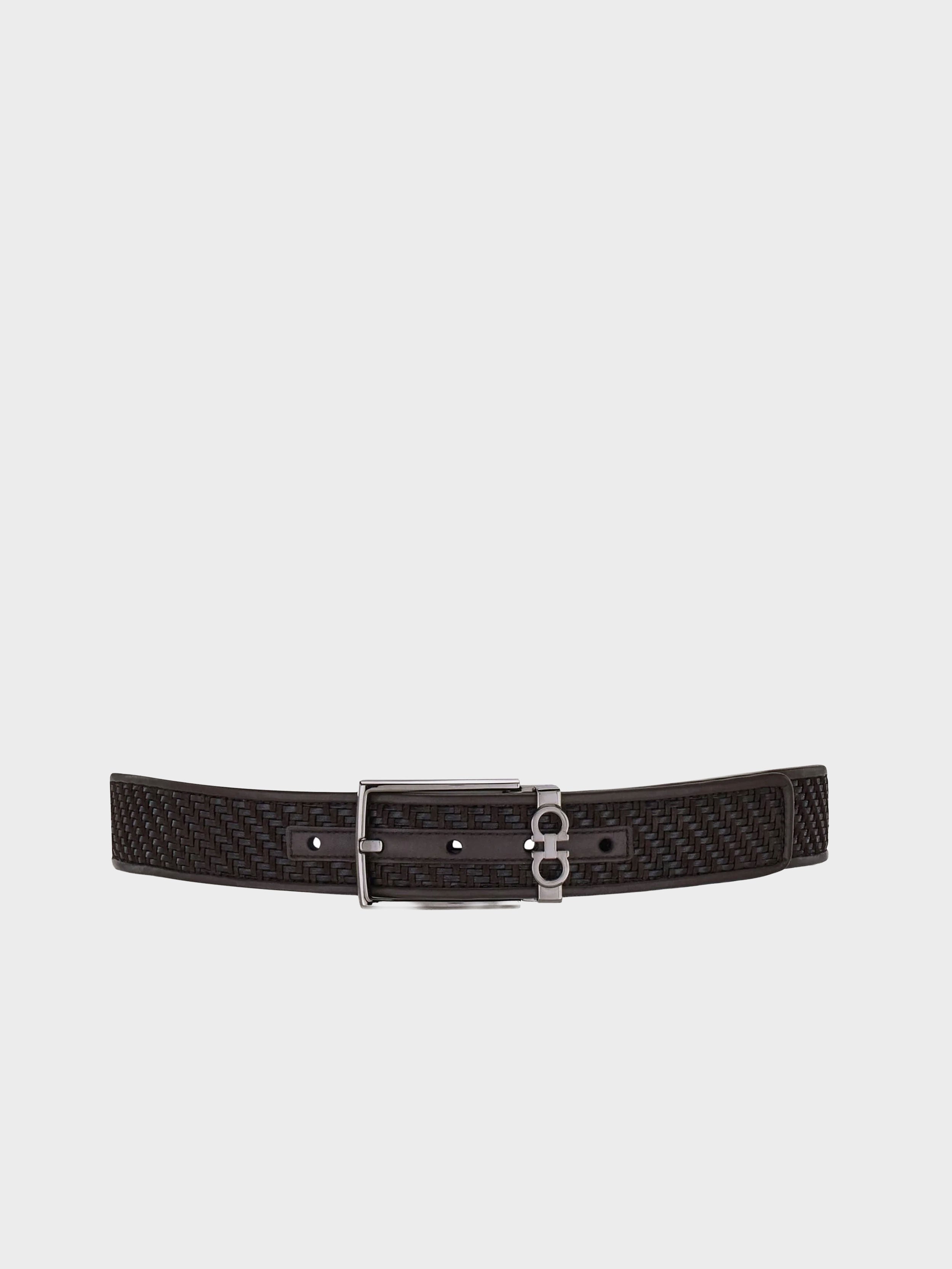 • A refined loom-woven technique gives this belt its distinctive leather basketweave effect. The geometric ruthenium-finish buckle is accented with delicate metallic Gancini details on the loop for a signature touch. The adjustable length allows for a more personalized fit and style. We invite you to check our size guide for more information.