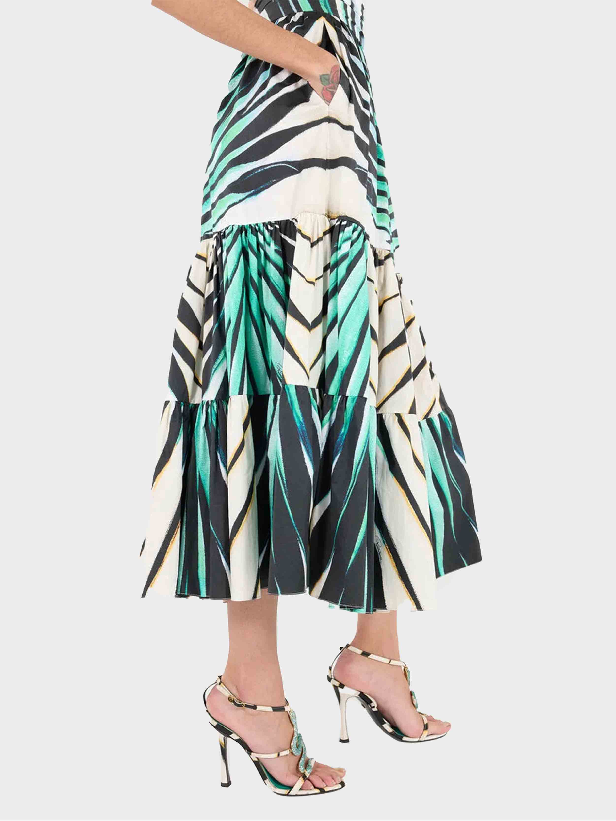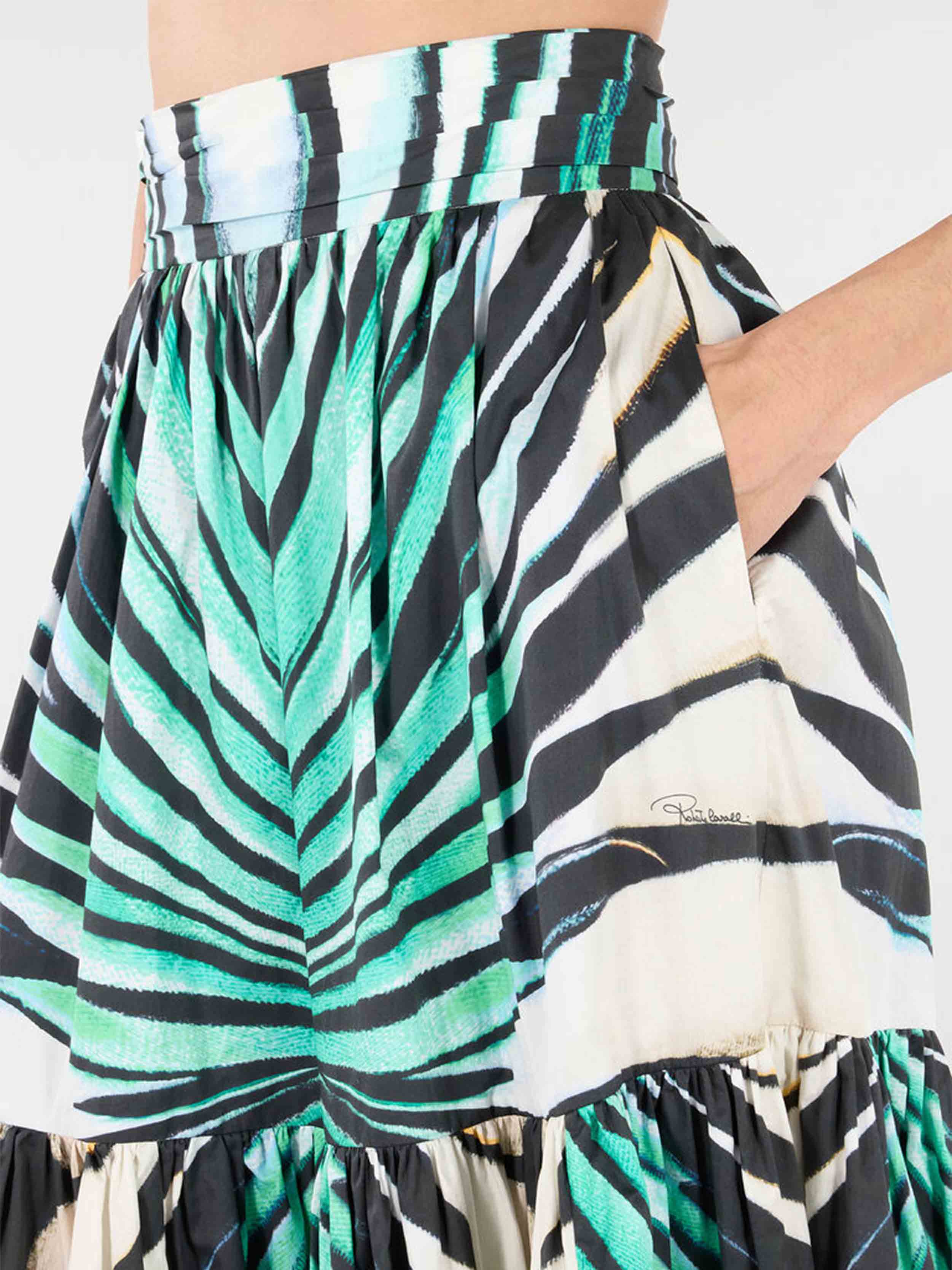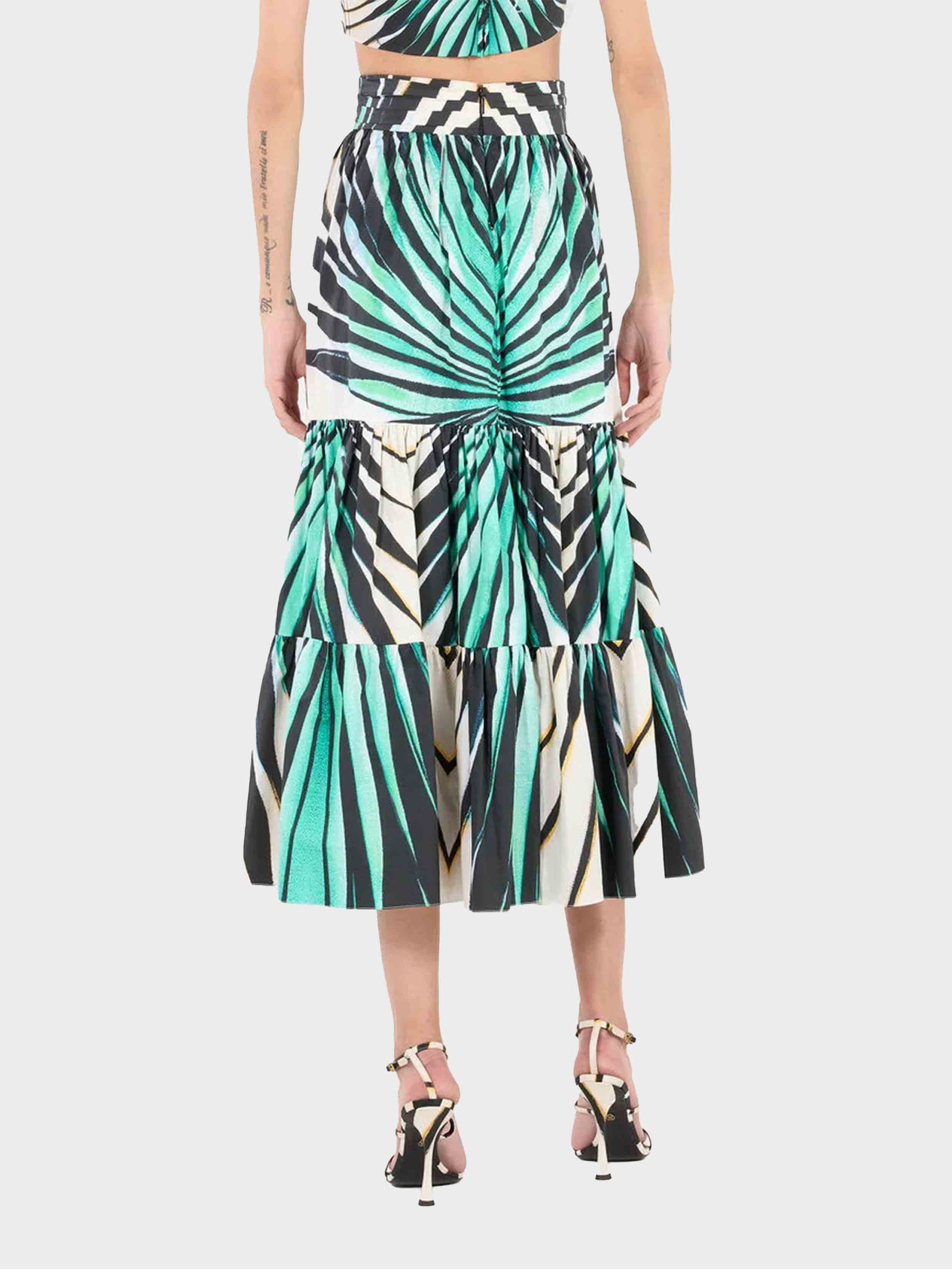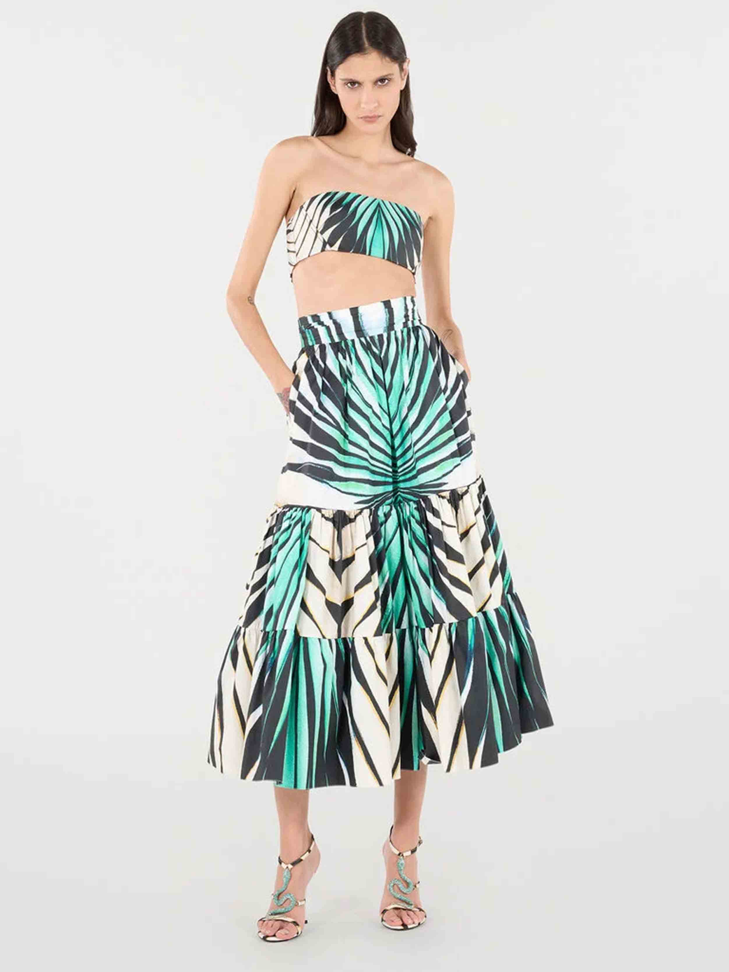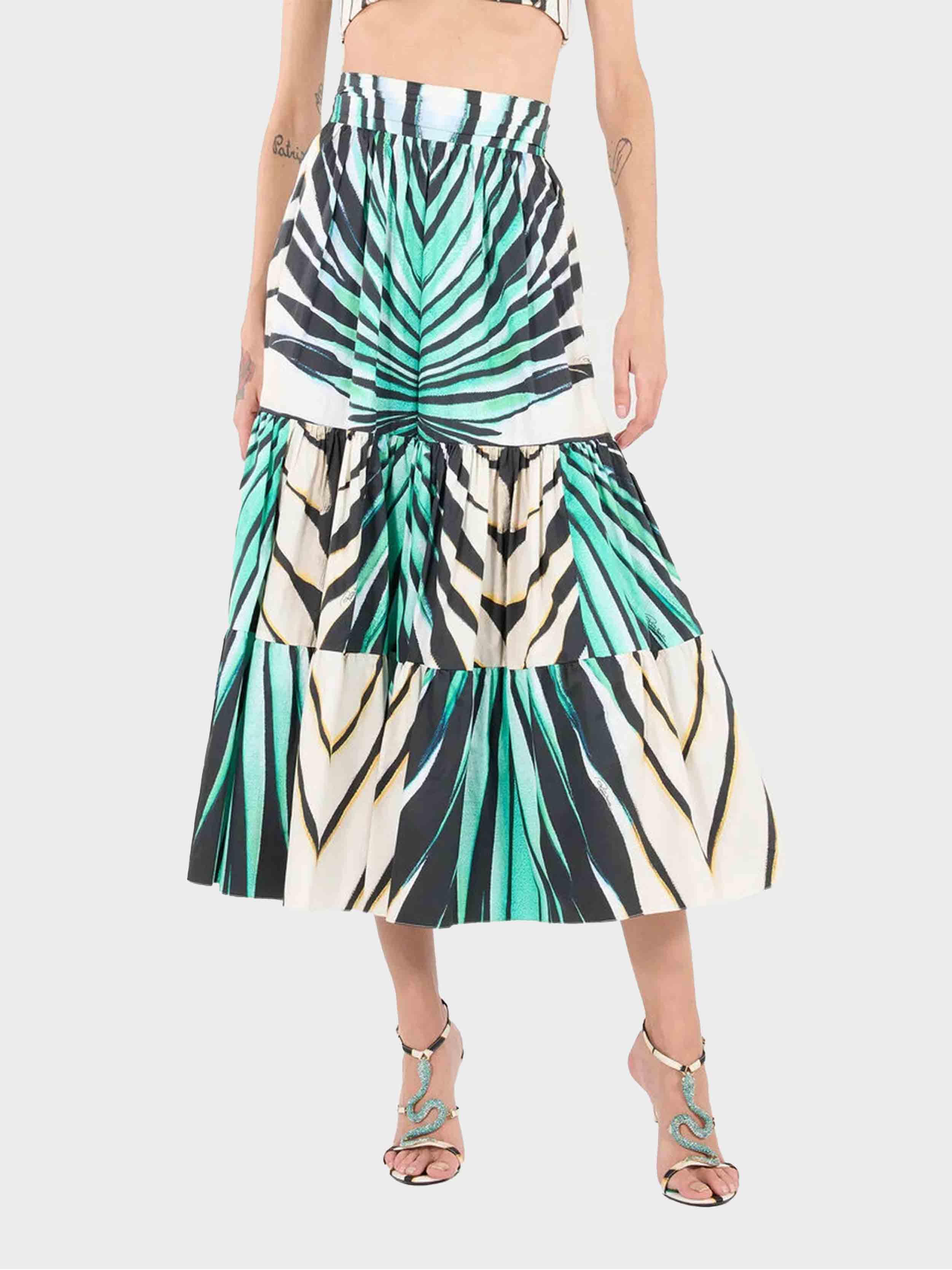 • Immerse yourself in the vibrant energy of summer with the Ray of Sea print skirt. This captivating piece features cascading tiers that create beautiful movement with every step. The striking palm leaf pattern, rendered in vivid green, black, and white, transports you to sun-drenched shores. Crafted for elegance and comfort, this skirt is a statement of sophisticated warm-weather style. The model is 178 cm / 70 inches tall and wears size S / 40 IT.