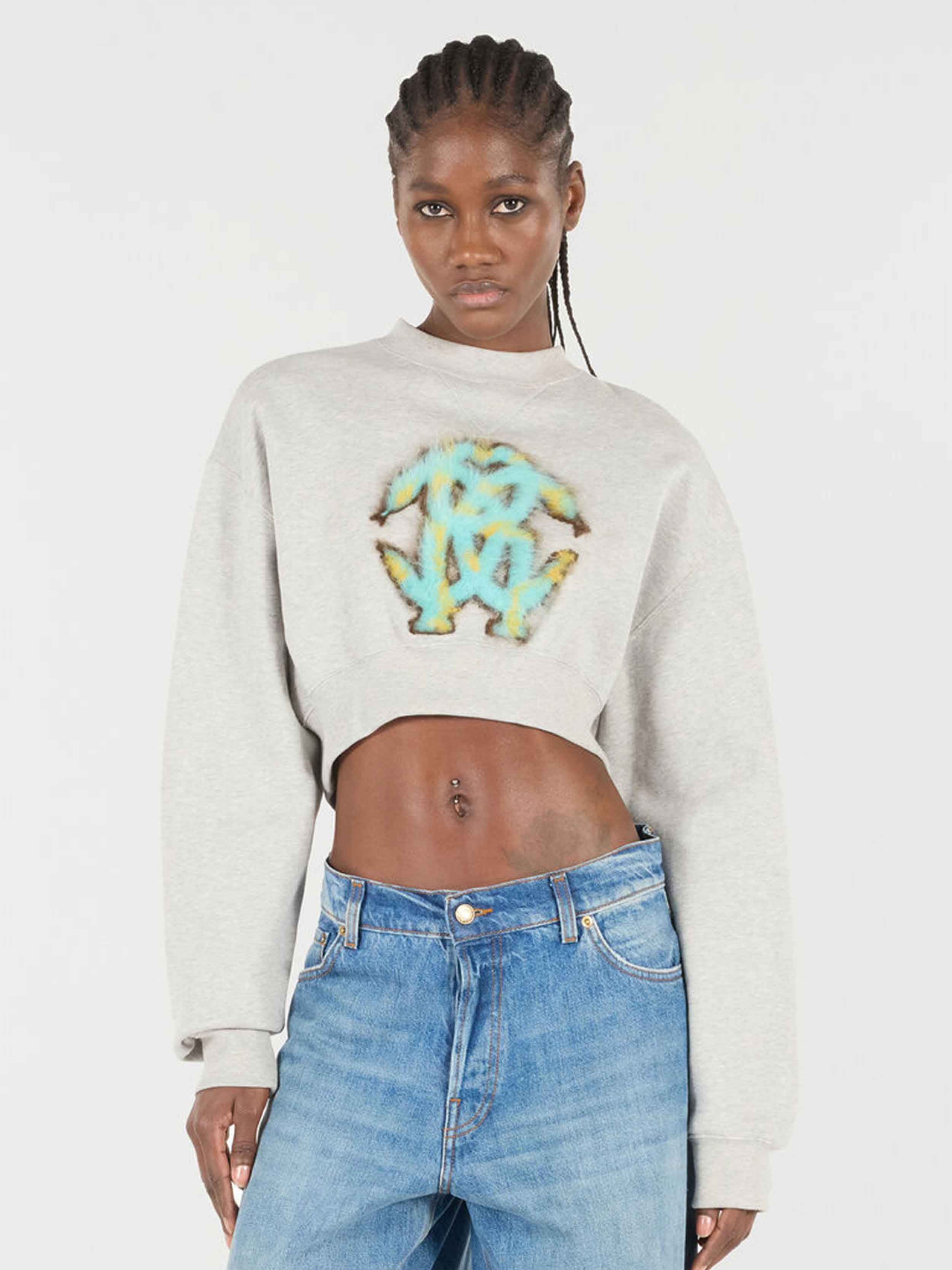 • An expression of casual and contemporary luxury, this cropped pure cotton sweatshirt is characterized by the maxi Mirror Snake Monogram in the form of a multicolored patch with a hairy effect that stands out on the chest, the Maison's unmistakable signature. The garment is complemented by a rib-knit collar, cuffs and hem and a V-shaped insert at the crew neck that gives an additional touch of comfort without sacrificing style.