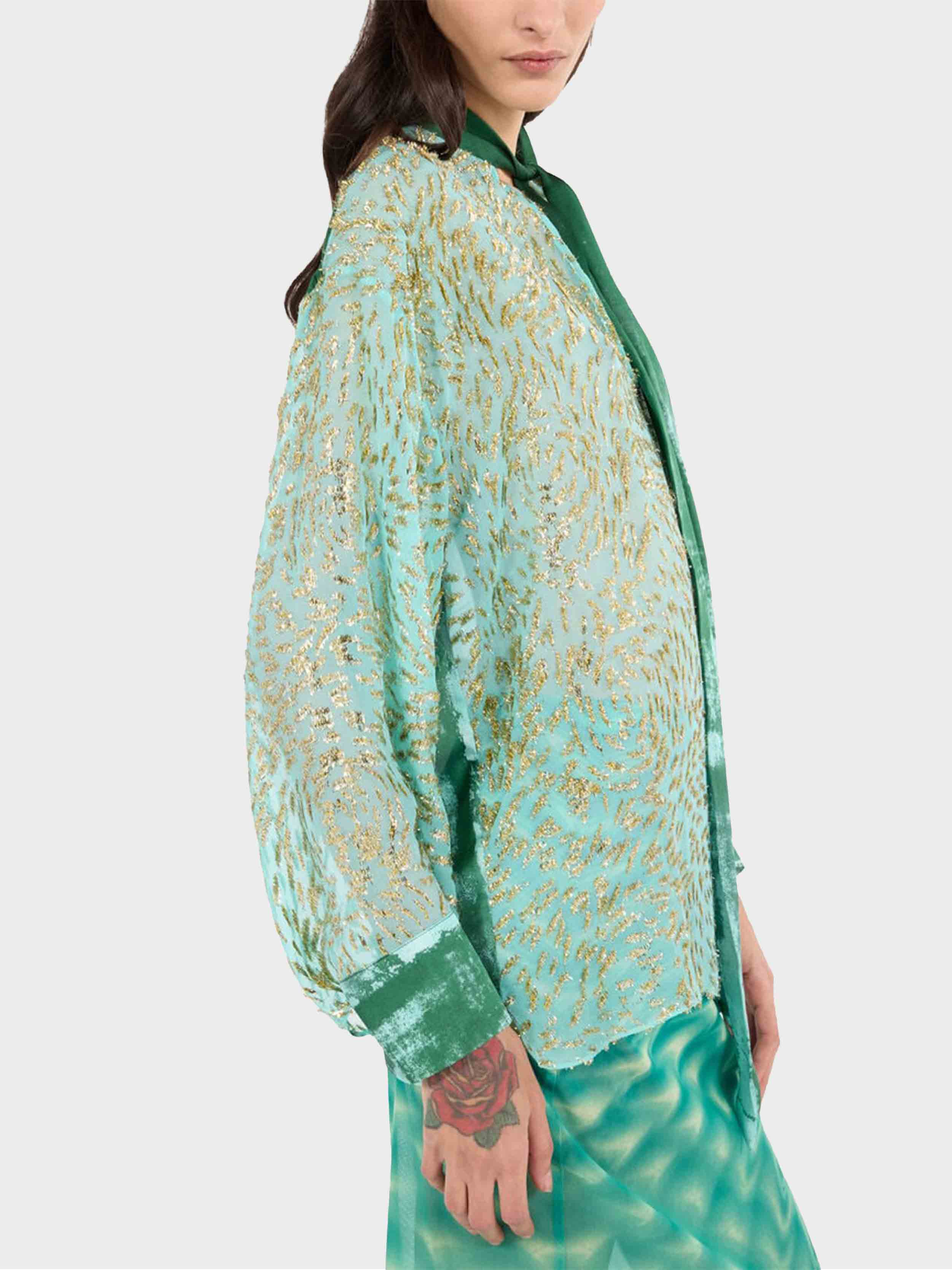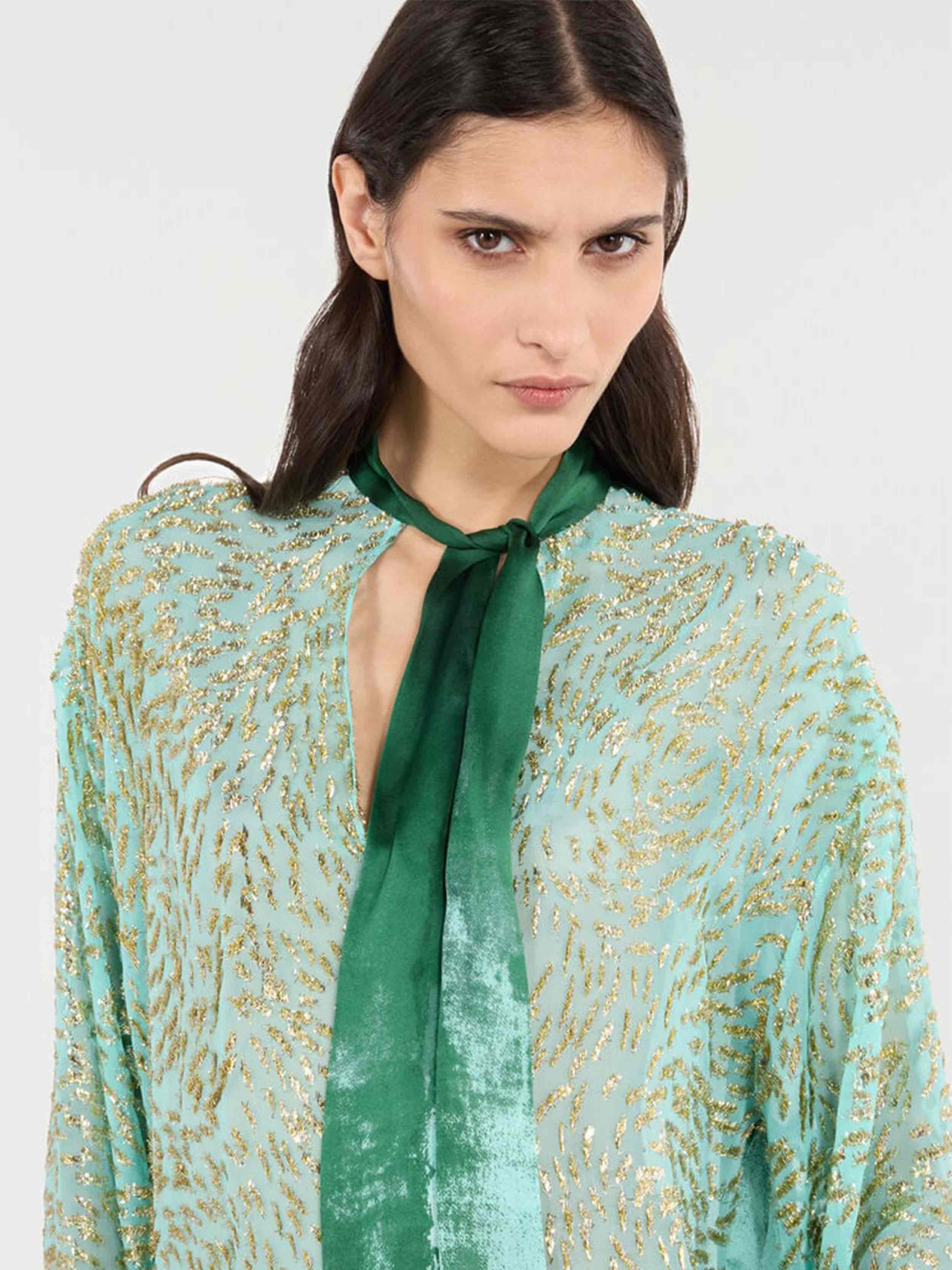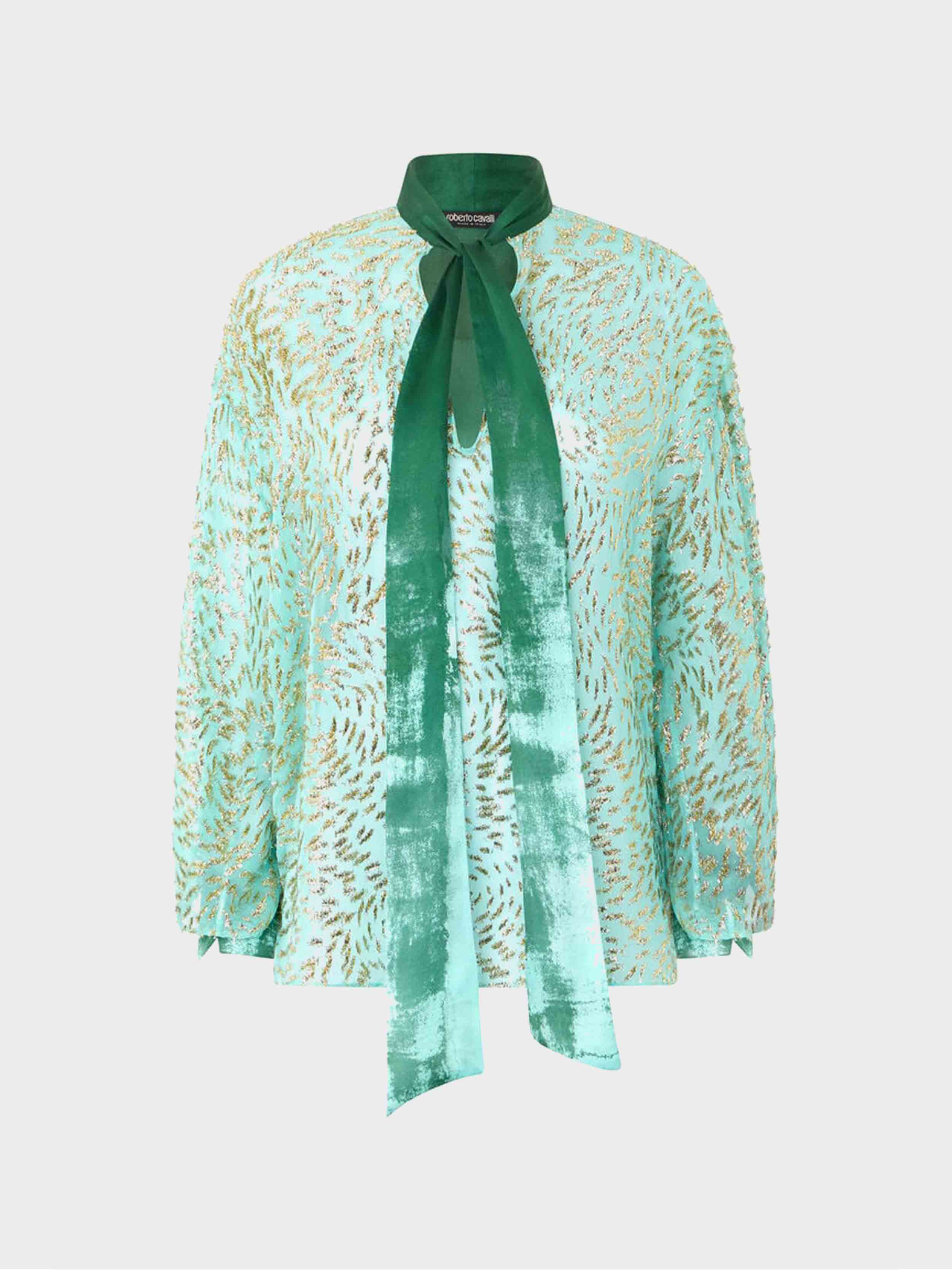 • Light, fluid and delicately sensual, this long-sleeved blouse by Roberto Cavalli will add an exquisite touch to your evening outfits. The model, made of silk blend, is defined by a radiant pattern characterized by golden decorations with small fringes that create the effect of an animal motif, and is enriched by the refined bleached appearance of the back, the cuffs and the soft integrated scarf to tie at the neck.