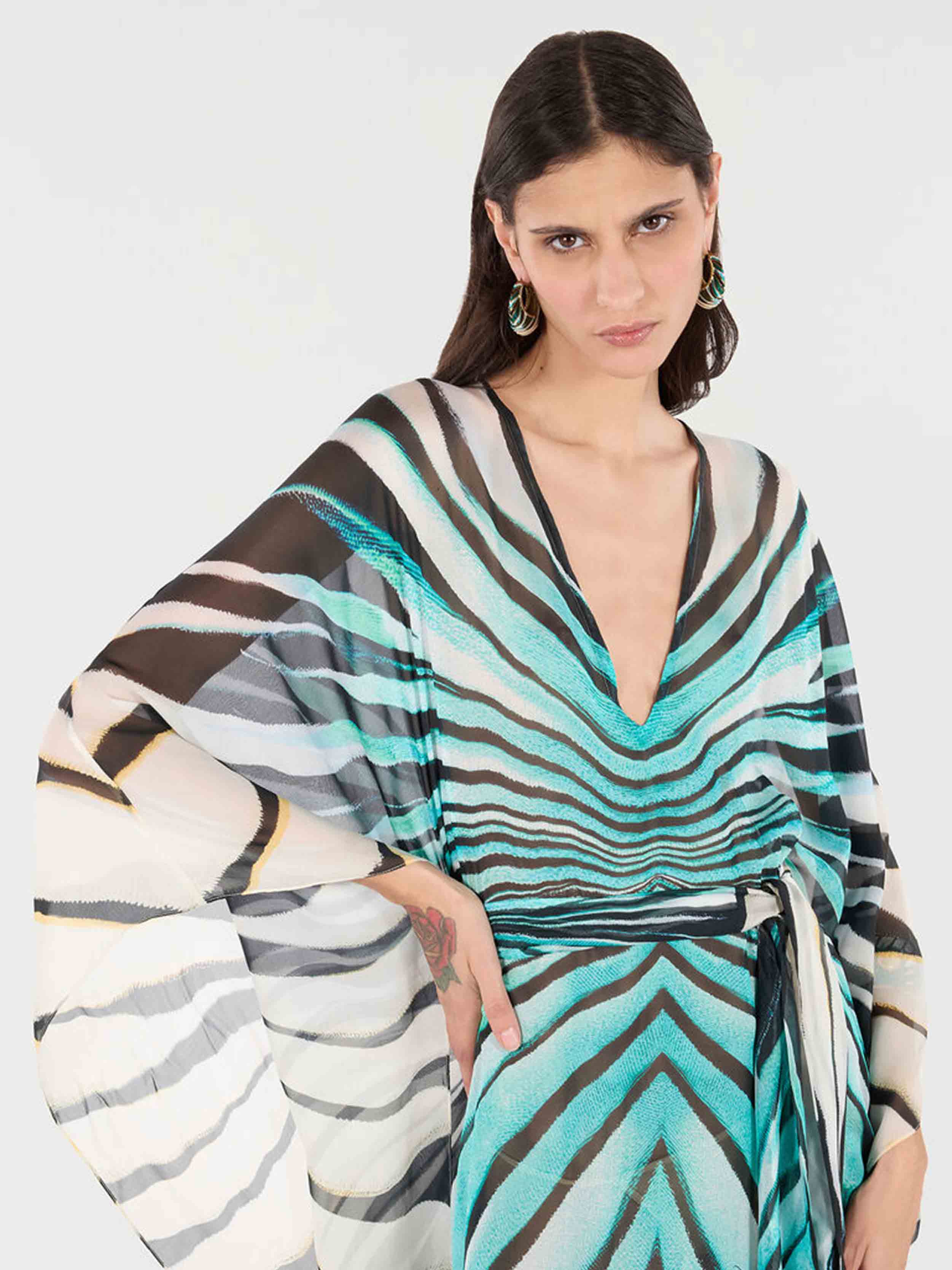 • Embody the essence of coastal elegance with this kaftan, adorned with the vibrant Ray of Sea print. The fluid lines and wide sleeves evoke the sea breeze, while the V-neckline and waist tie accentuate the silhouette with sophisticated ease. A piece that catches the light and the eye, perfect for exclusive poolside moments or beach sunsets.