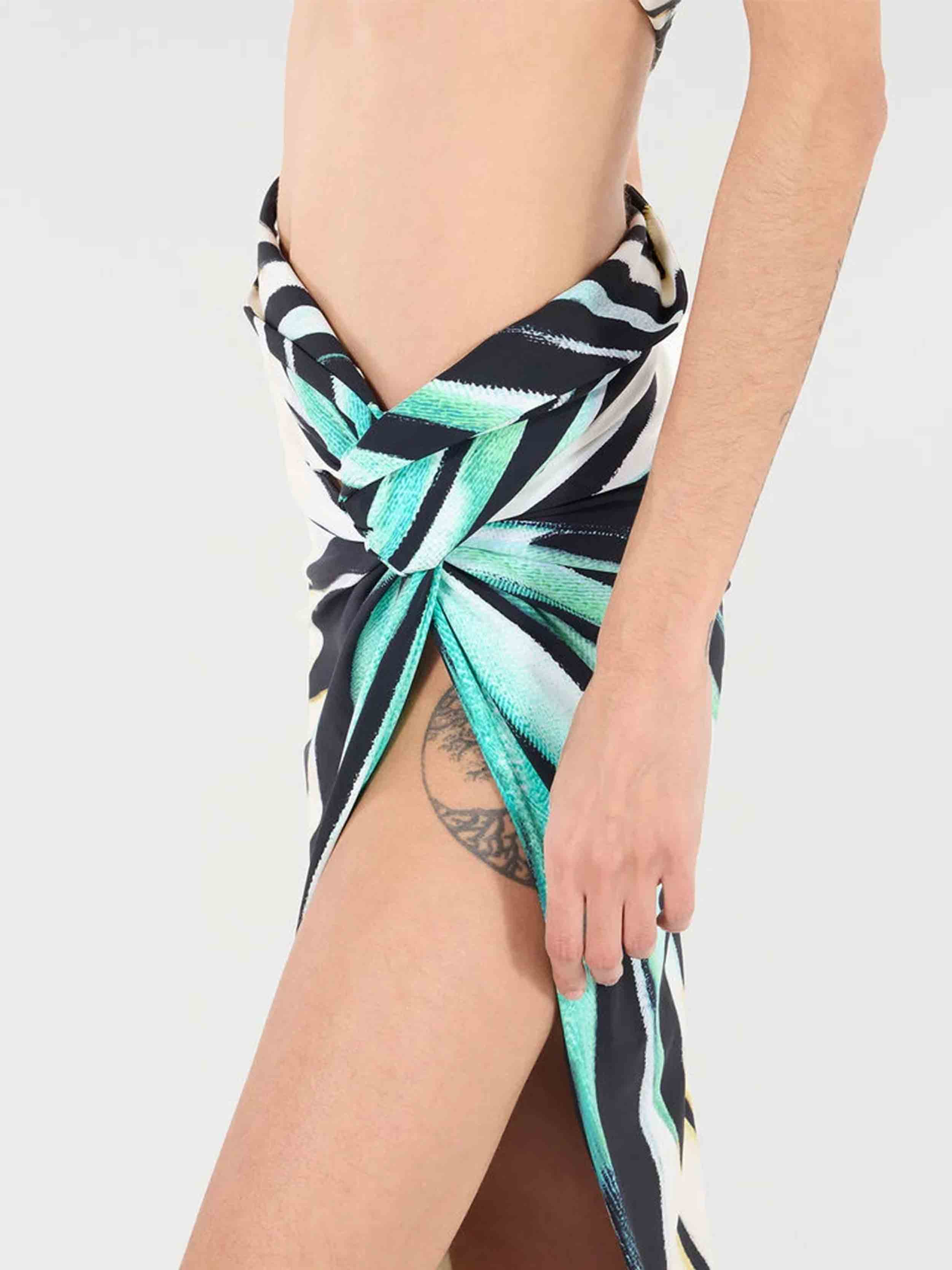 • Capture the vibrant essence of the ocean with this sarong featuring the dynamic Ray of Sea print. The fluid design and asymmetric silhouette create elegant movement, perfect for stylishly completing your beach looks. A side knot adds a chic and versatile touch.