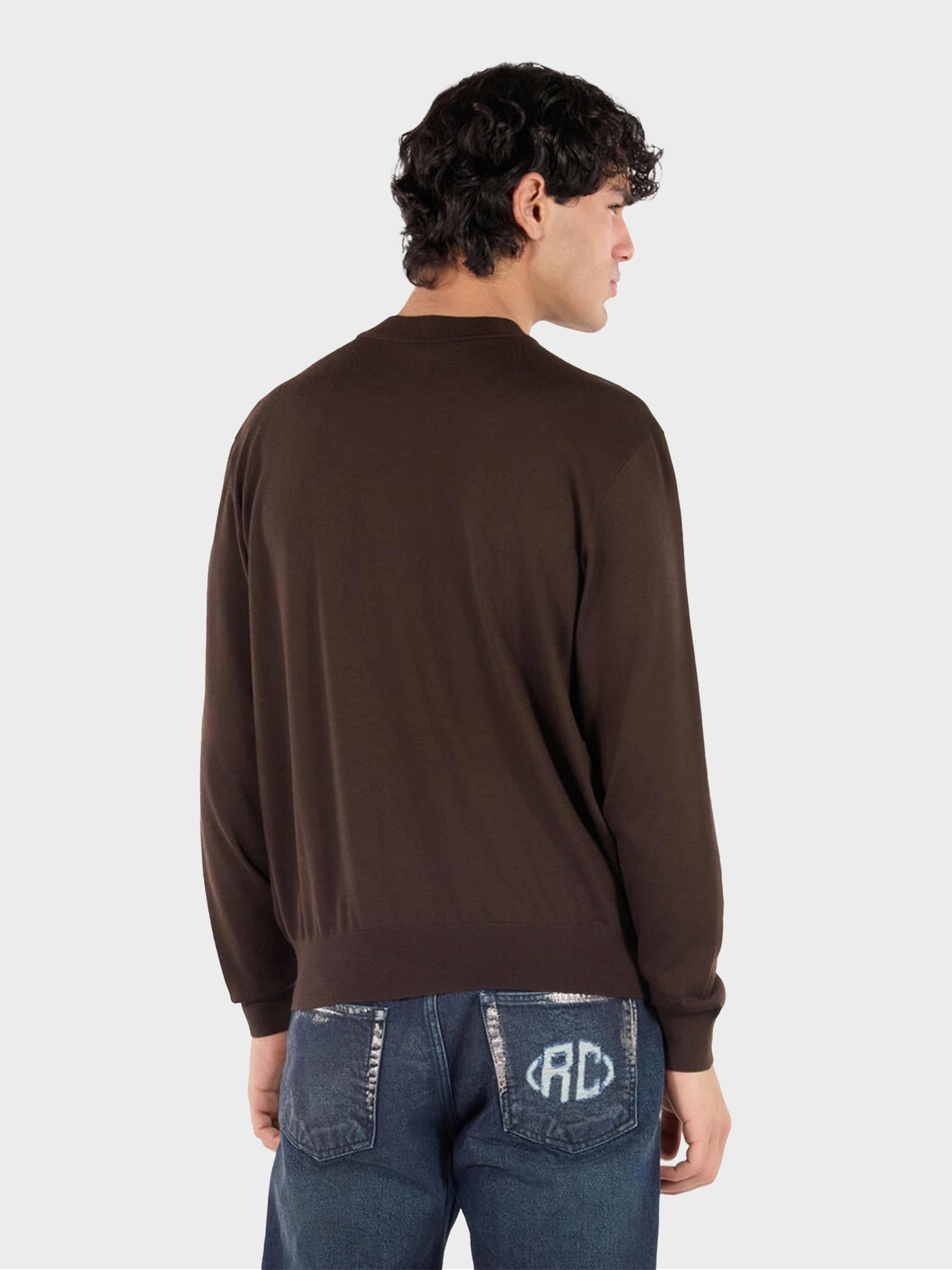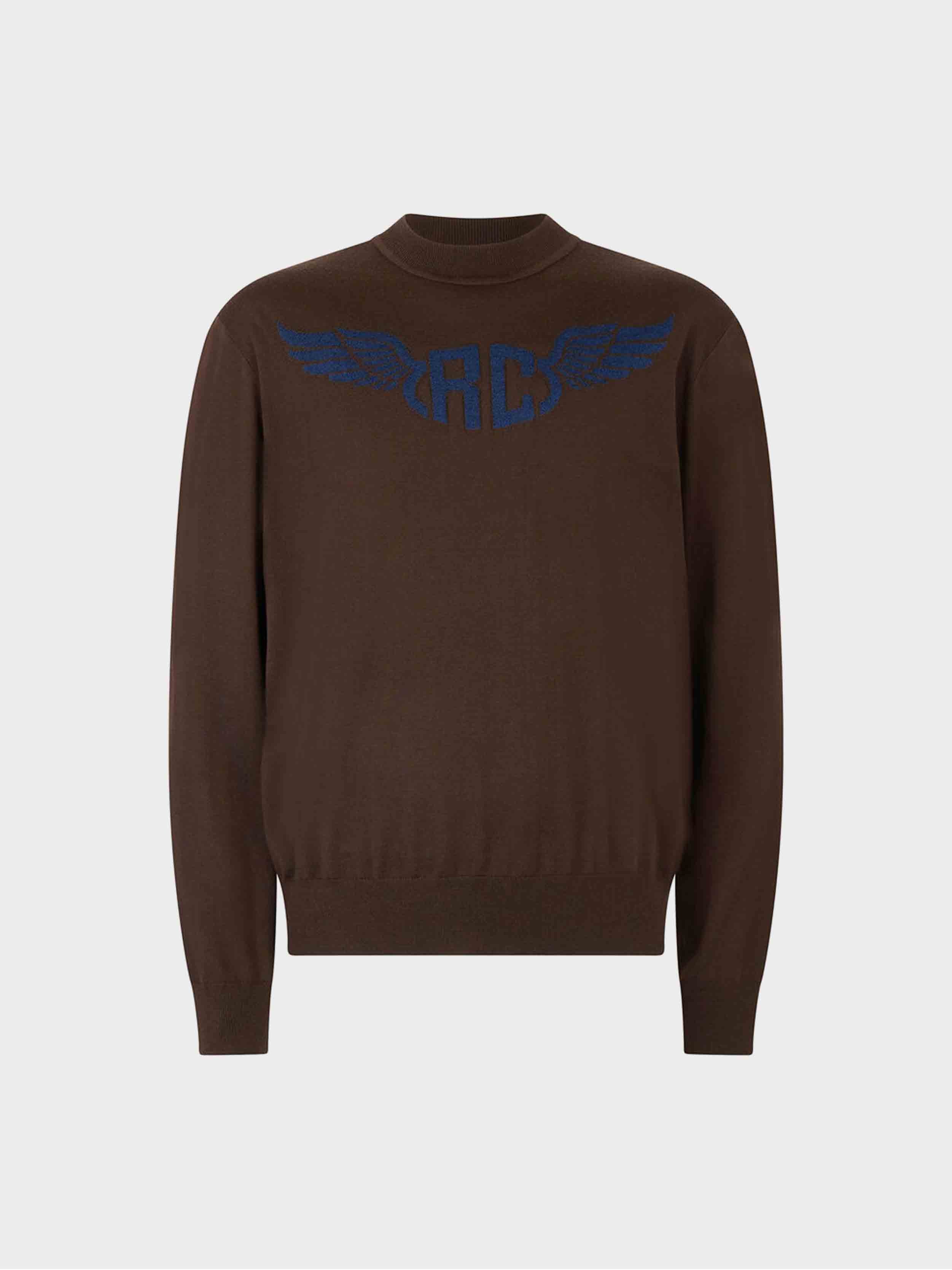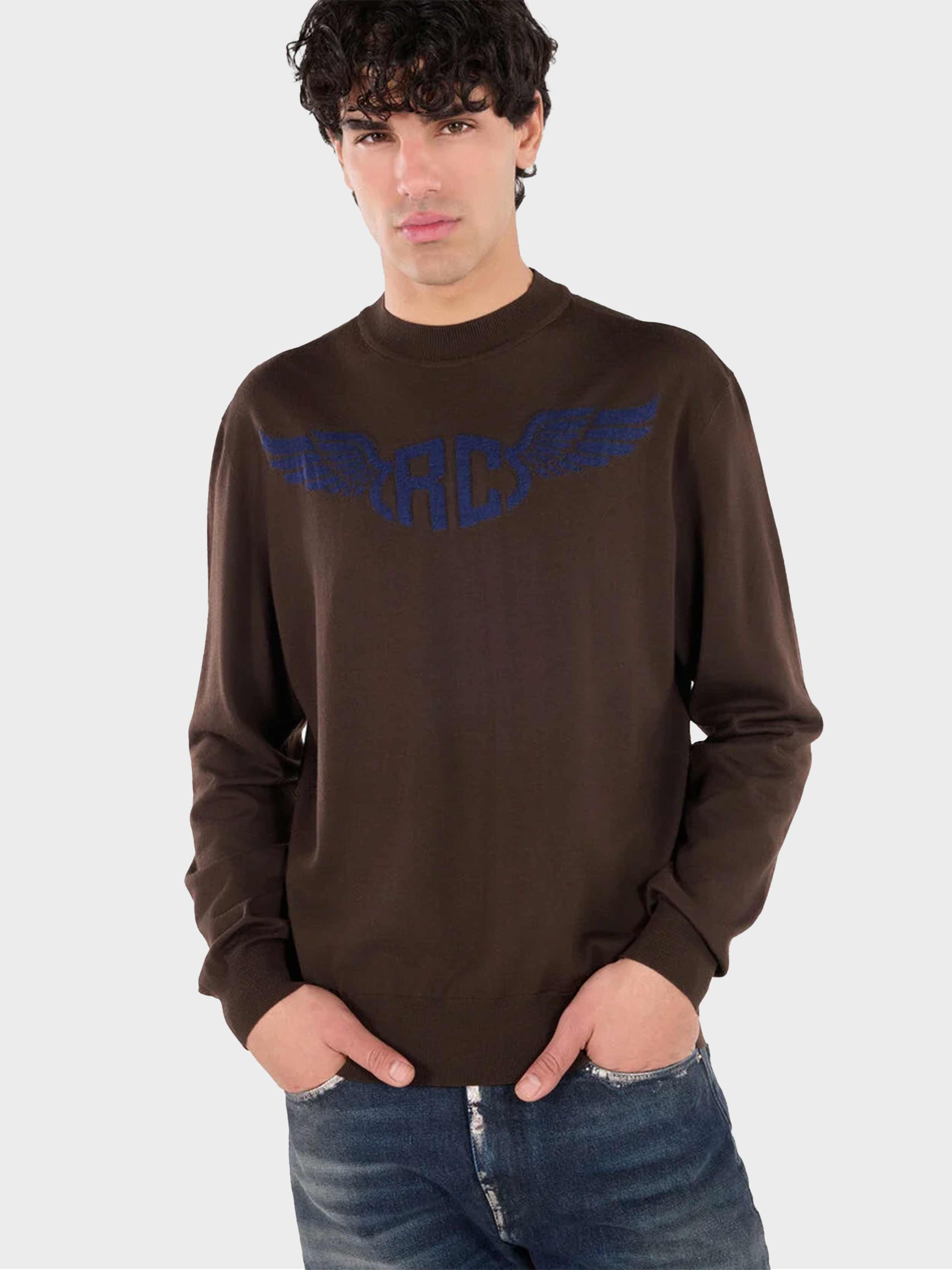 • An emblem of effortless, contemporary luxury, this pure wool sweater with a versatile spirit proudly features Roberto Cavalli’s distinctive signature, a large winged RC monogram that stands out in contrast on the chest.