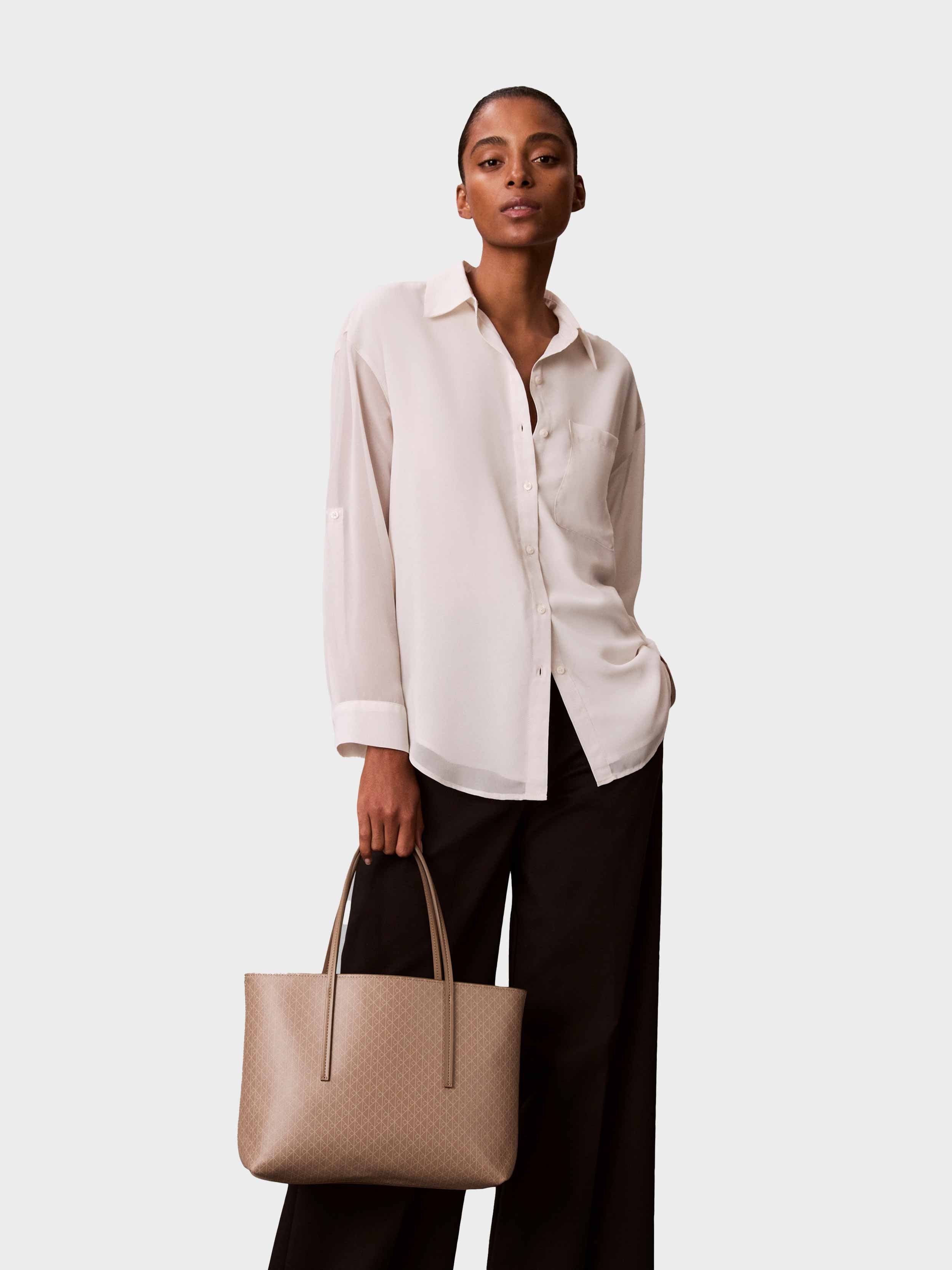 • A small tote bag from the Calvin Klein collection. This open-top design is crafted from faux leather, which is easy to clean and maintain. The product contains recycled fibers.