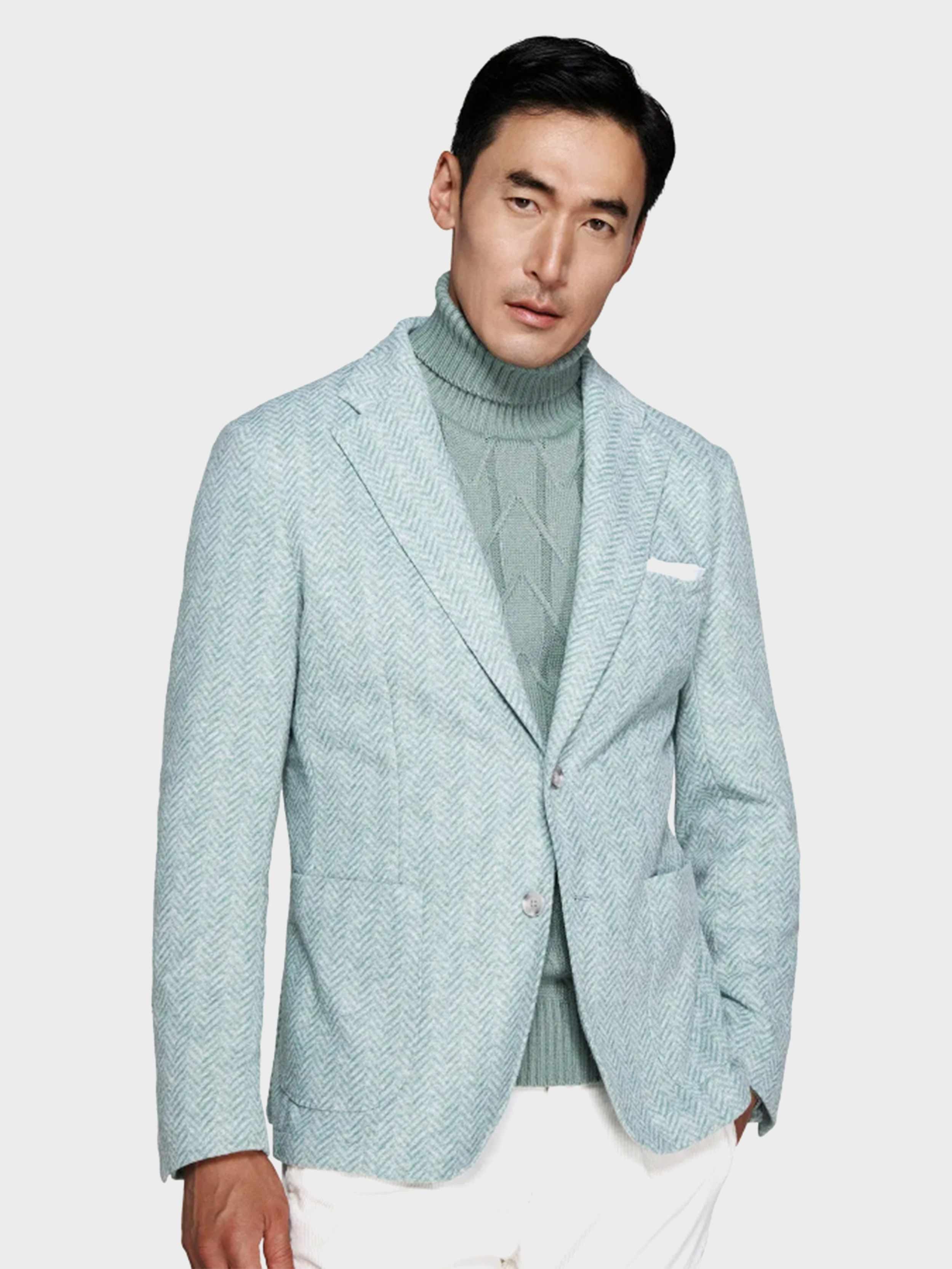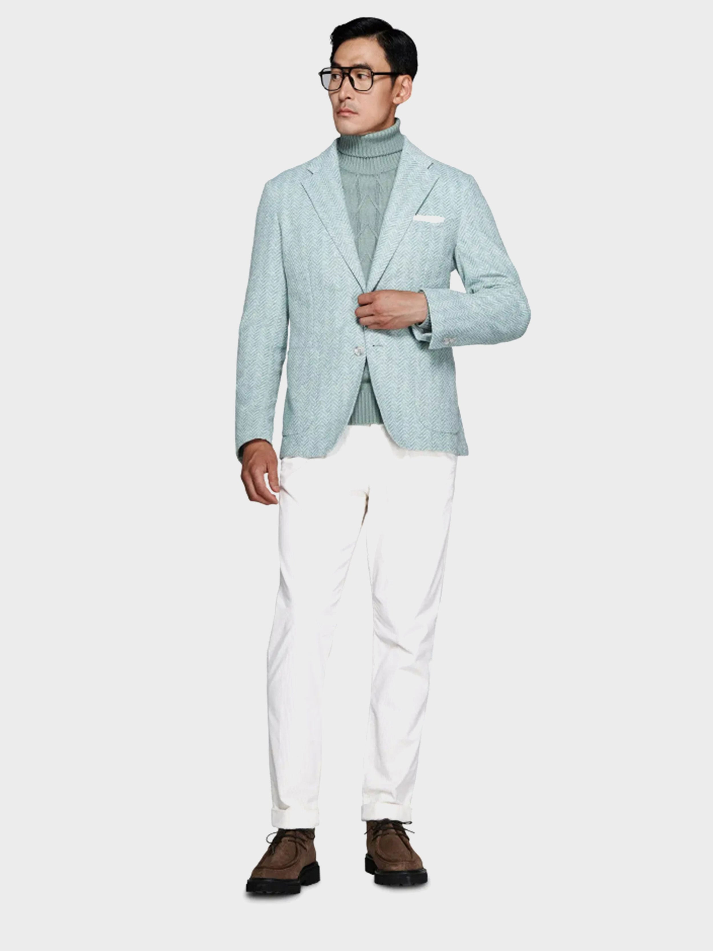 • Herringbone jersey blazer. Slim fit with notch lapels, two buttons and patch pockets.