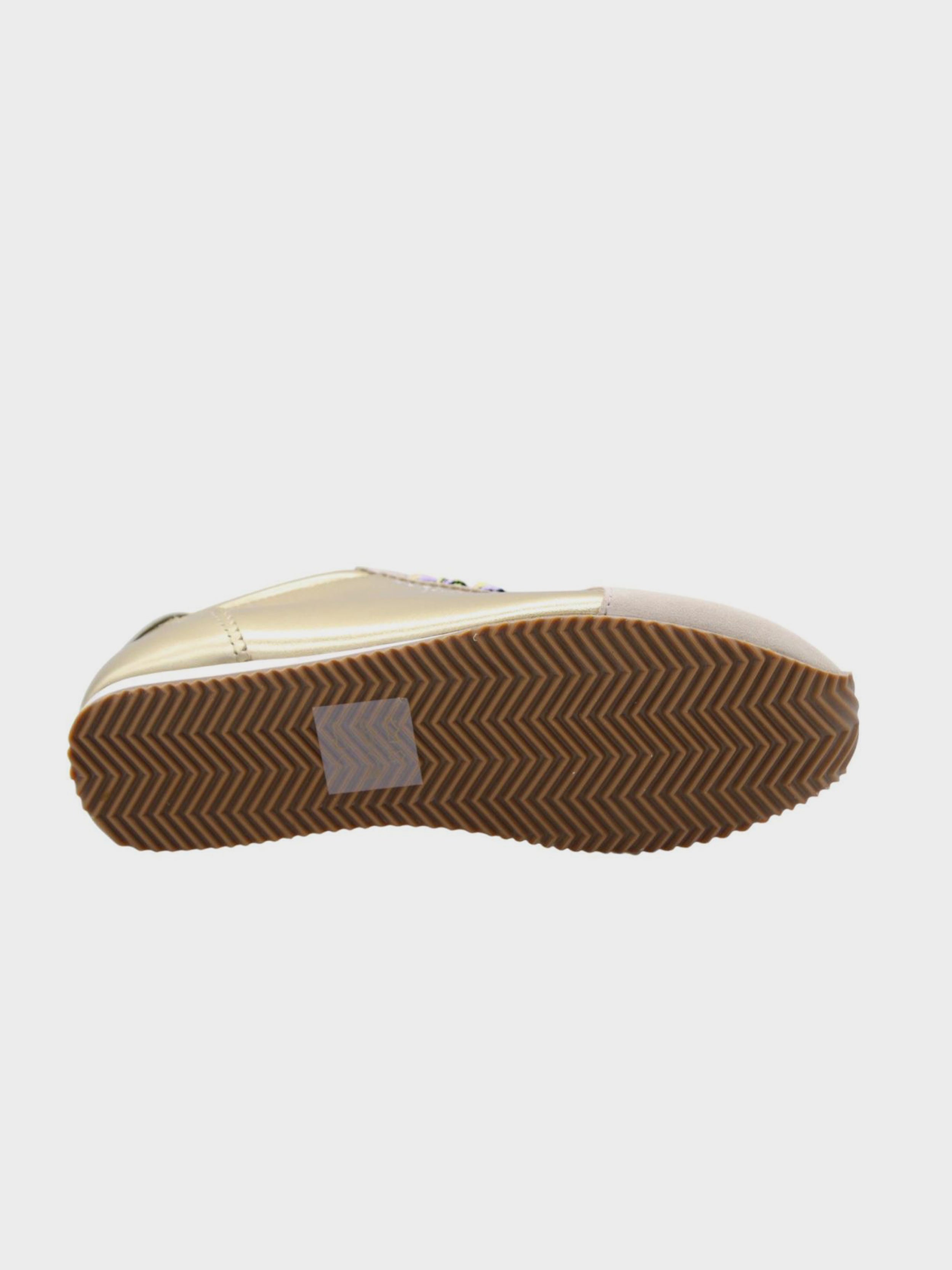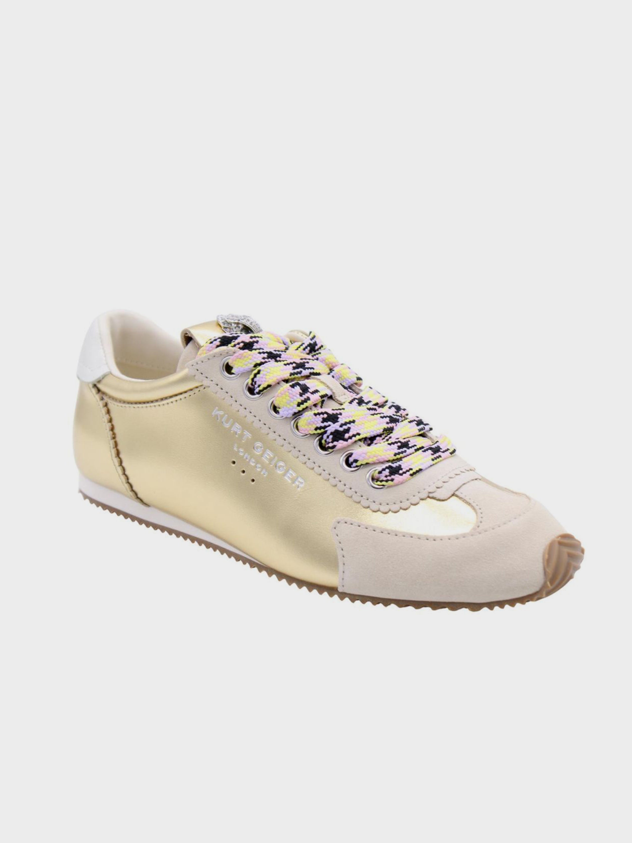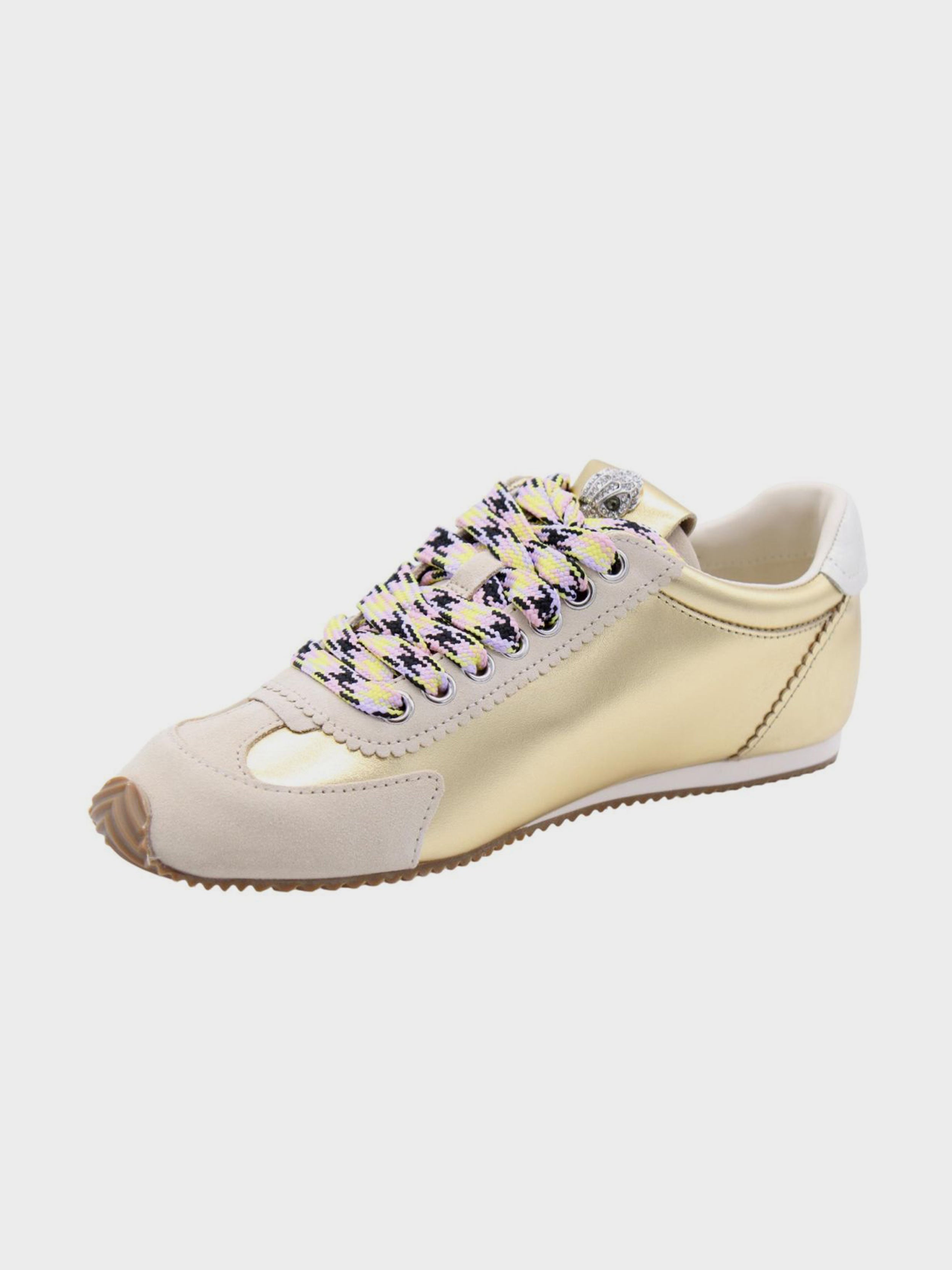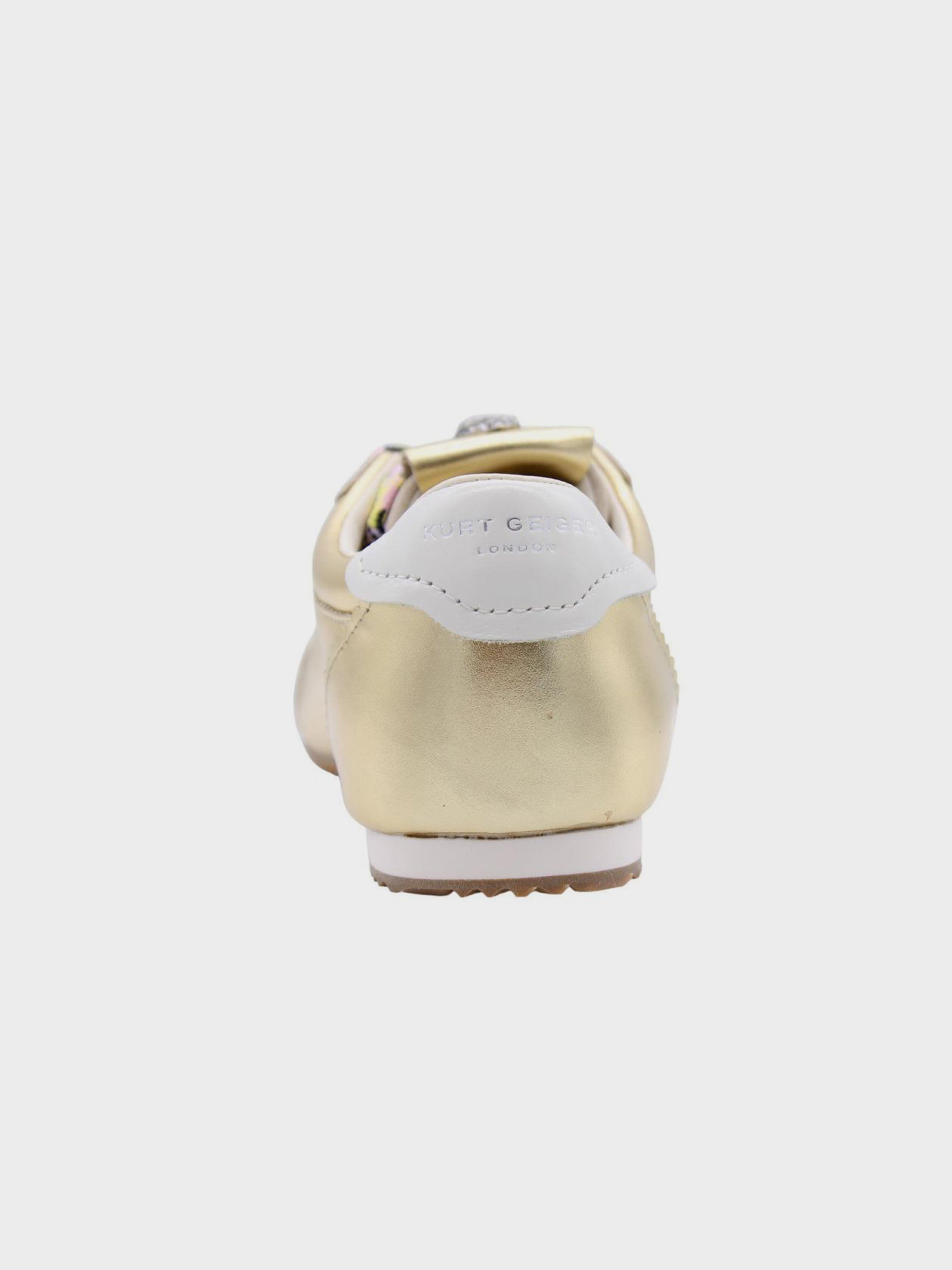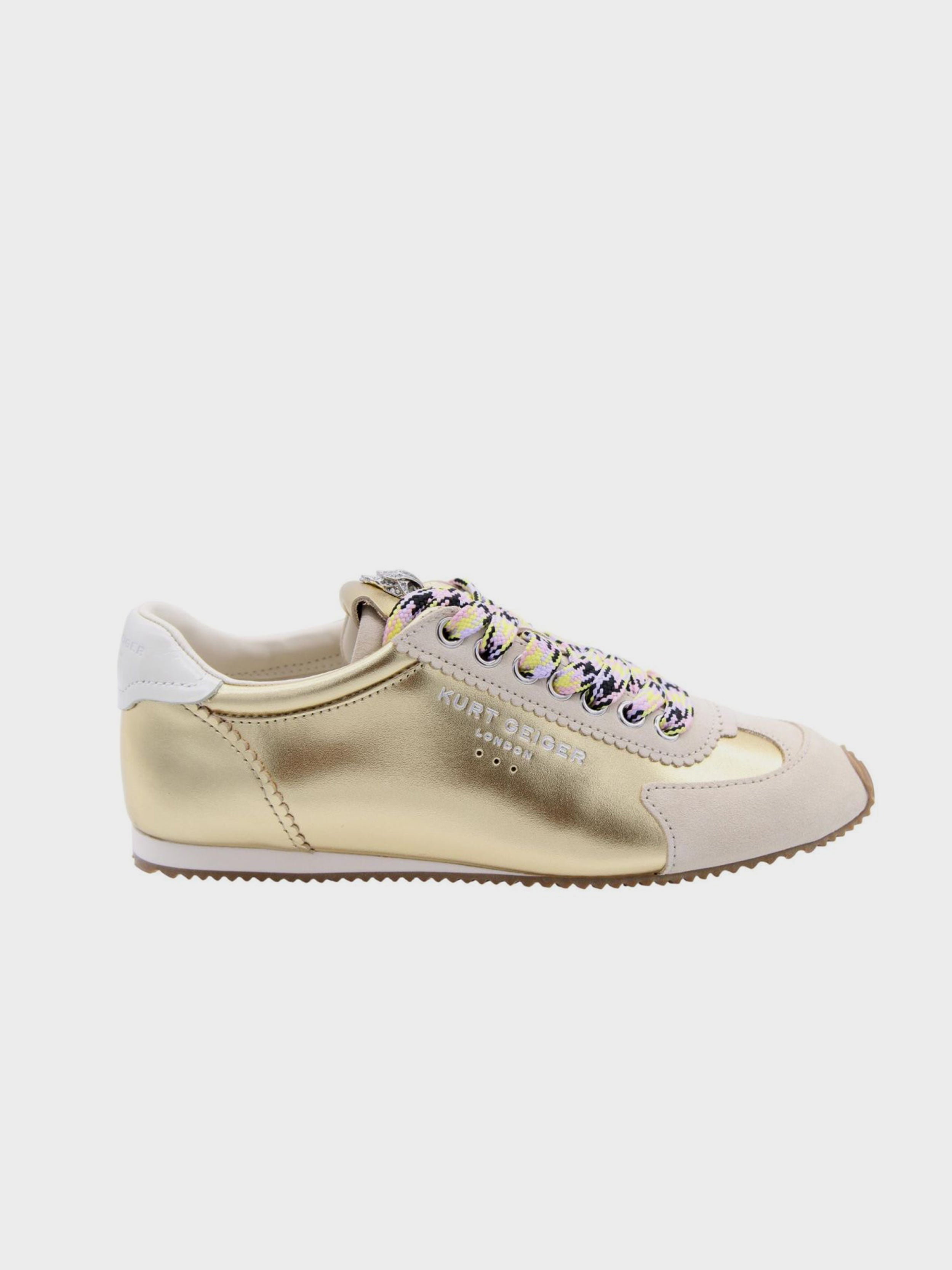 • This Islington Sneaker is crafted from a metallic gold leather. There is bone suede leather panels on the heel and toe. There is a silver eagle head with crystals sat on the tongue.