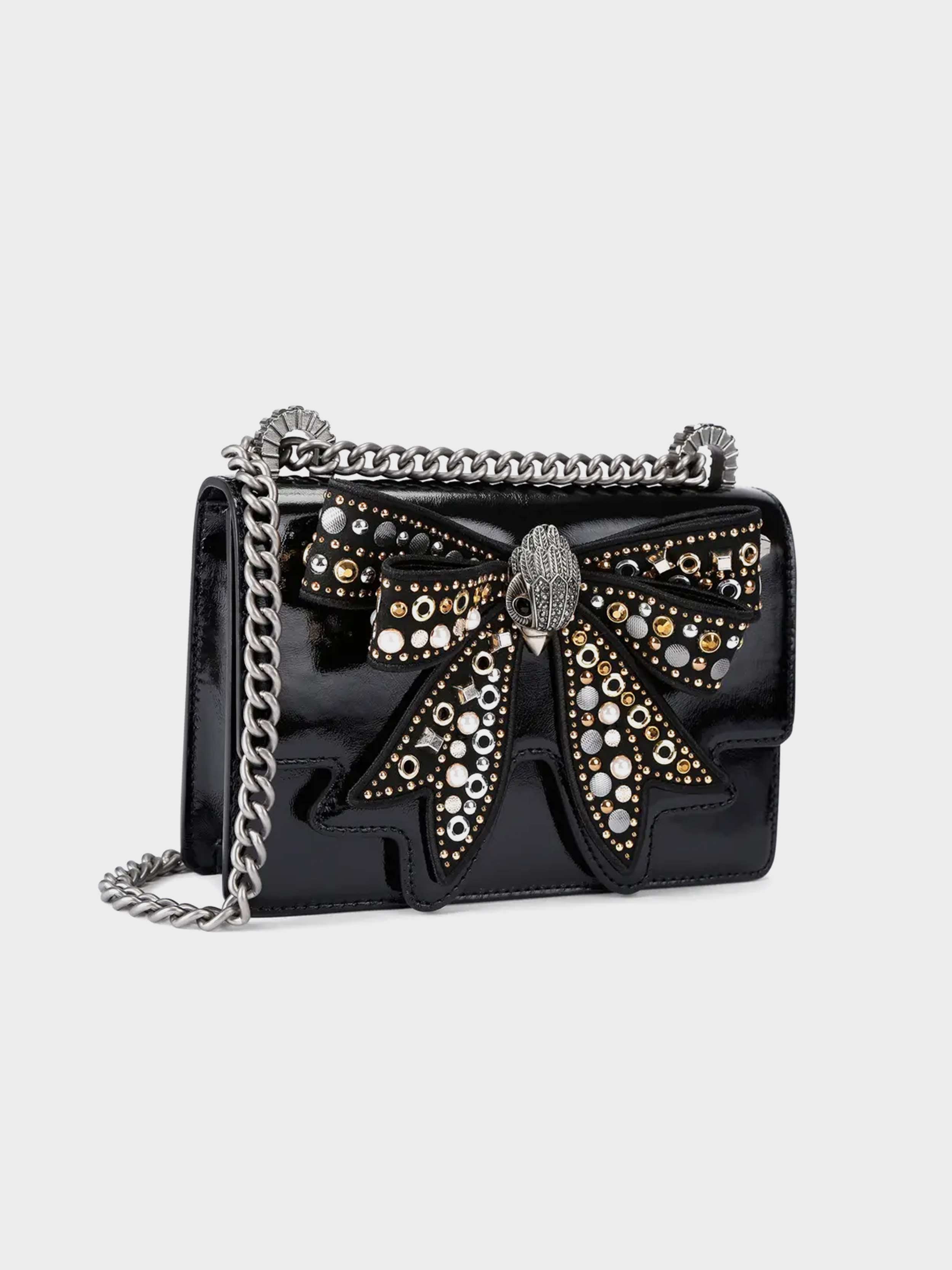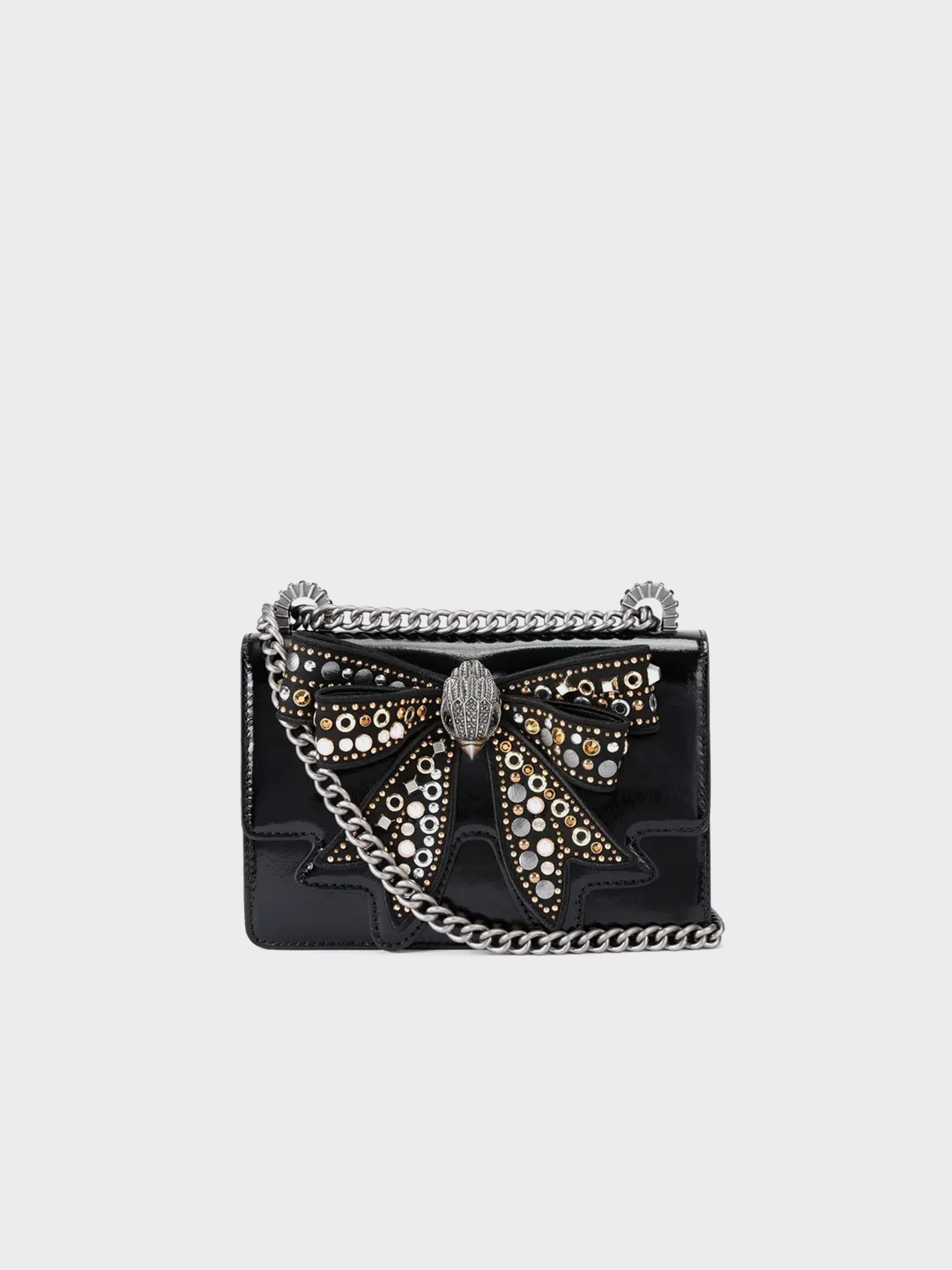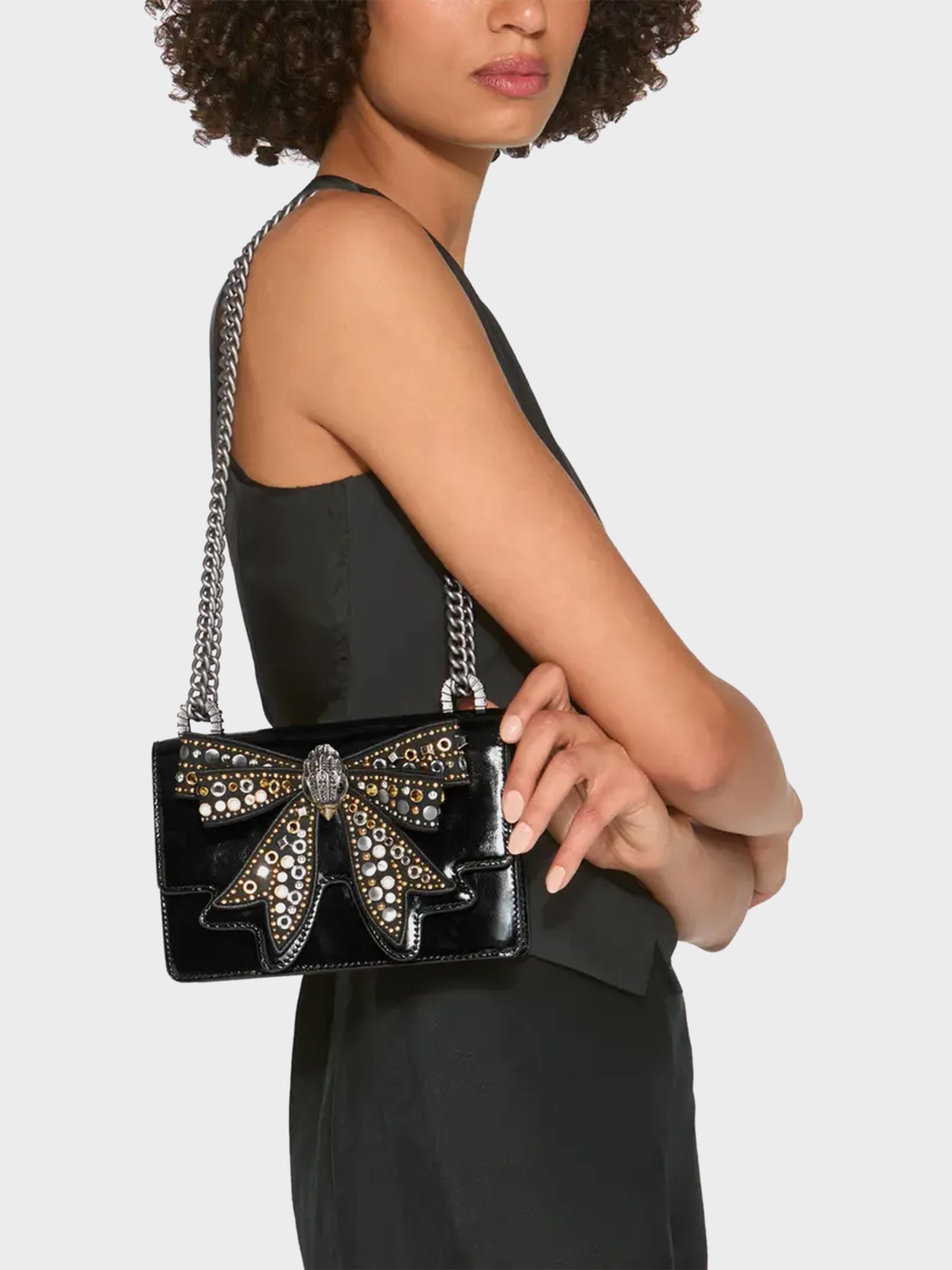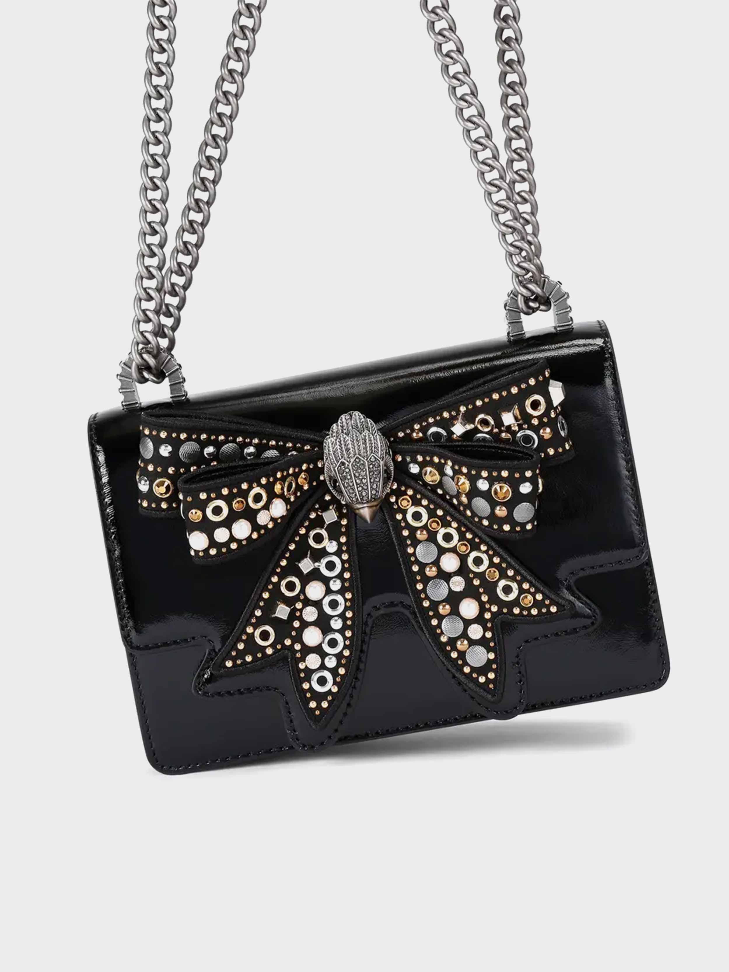 • The Small Shoreditch Cross Body is crafted from a black leather. The front flap is topped with an embellished bow with an antiqued brass head in the centre.