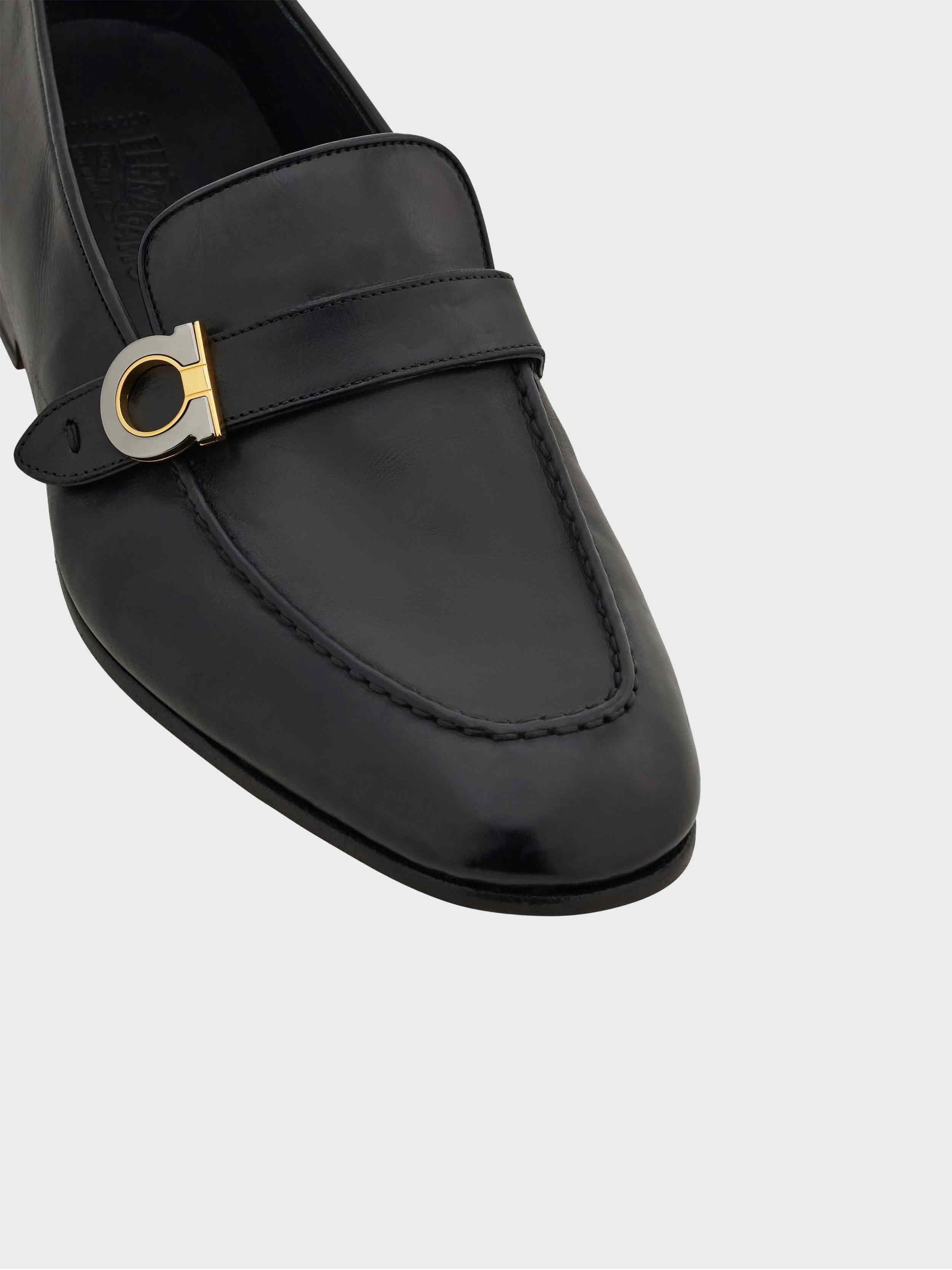 • making it exceptionally flexible. The elongated almond profile is accented with apron-toe seams and the two-tone Gancini buckle on the side. The time-honored Tramezza technique involves over 160 meticulous steps and six hours of work to achieve an impeccable fit that molds to the wearer's foot.