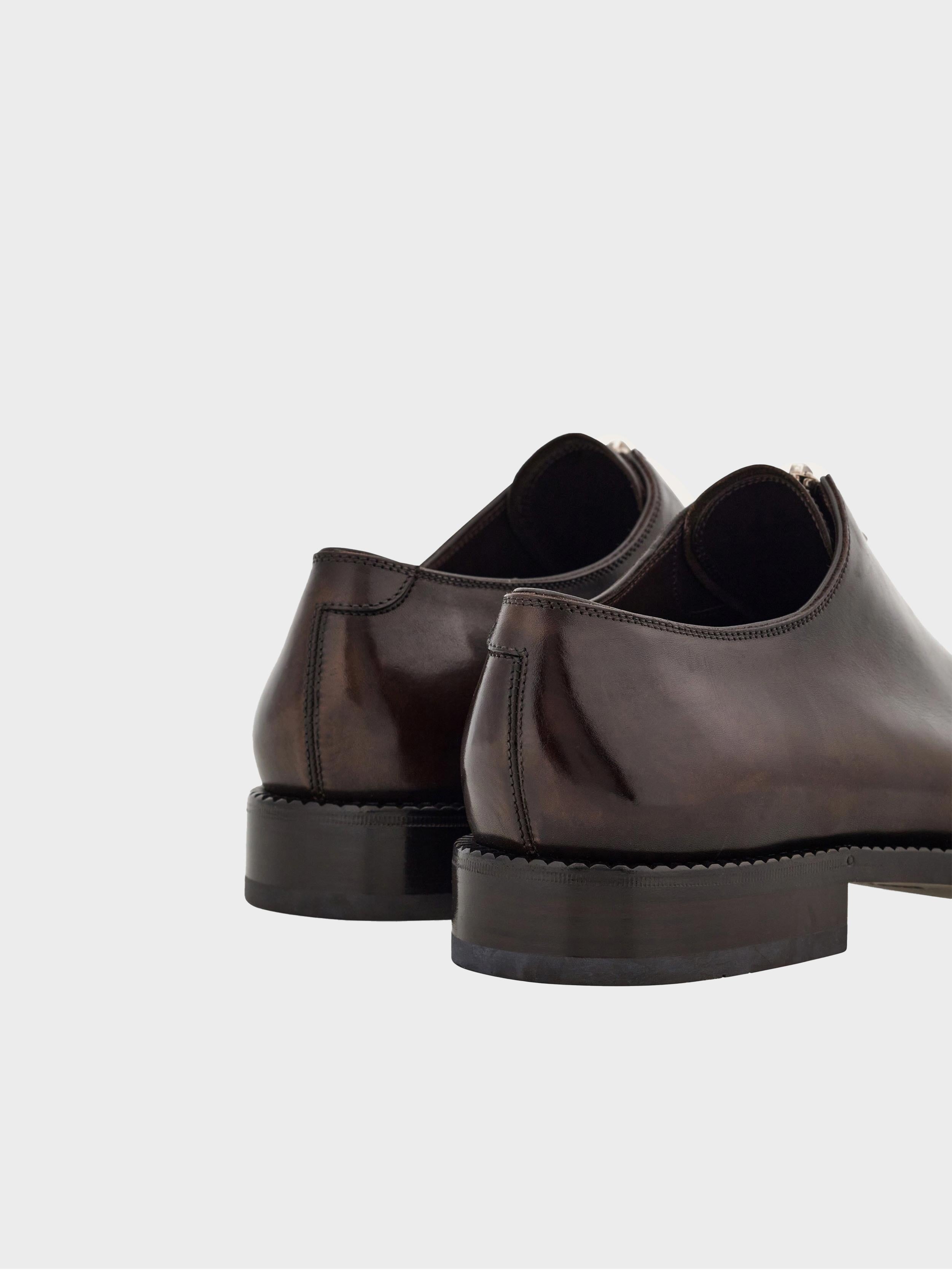 • A gentlemen’s classic with an urban twist. The central metal zip echoes the contemporary feel of this new derby shoe cut from the finest calfskin leather. With an almond shaped tip, and double stitching,