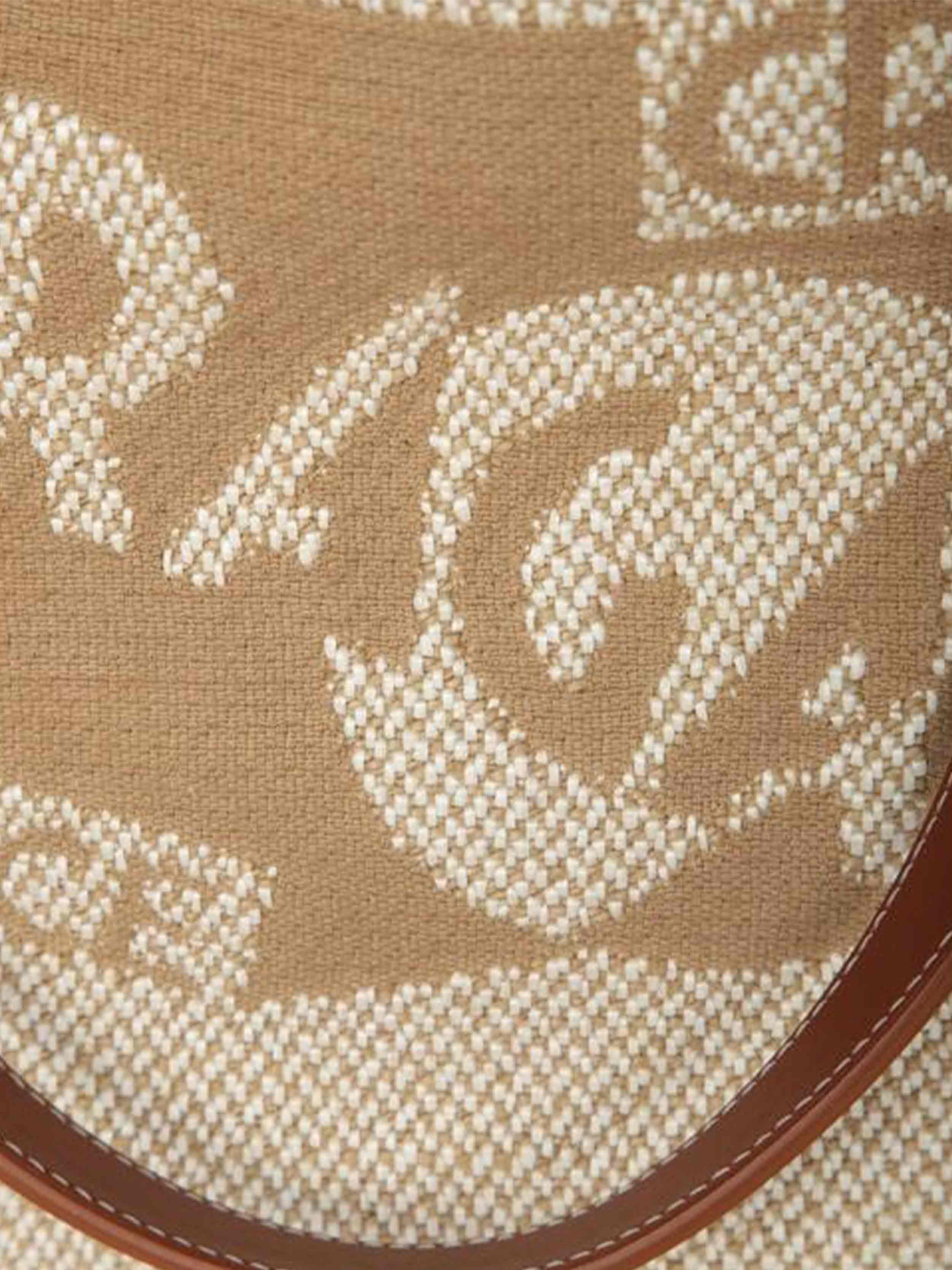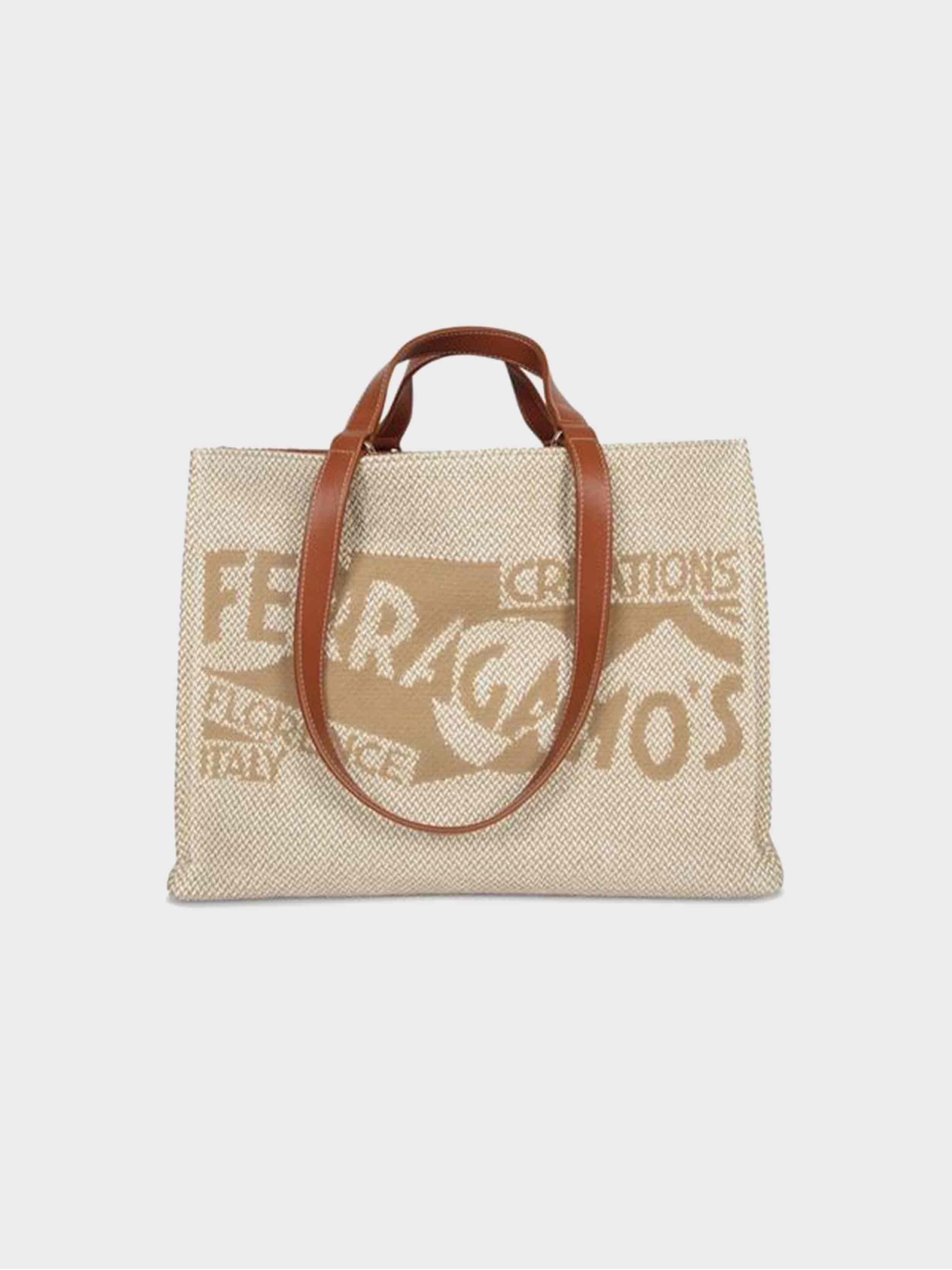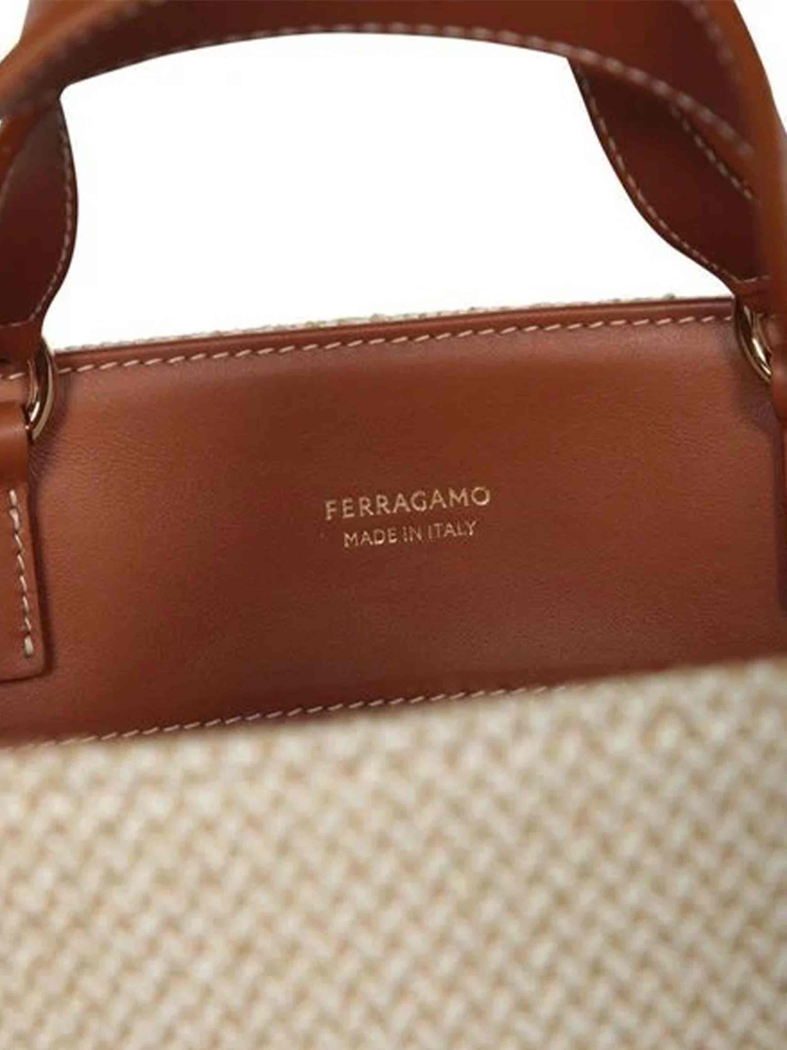 • Jacquard fabric tote bag with leather details. Top handles and printed Ferragamo logo..