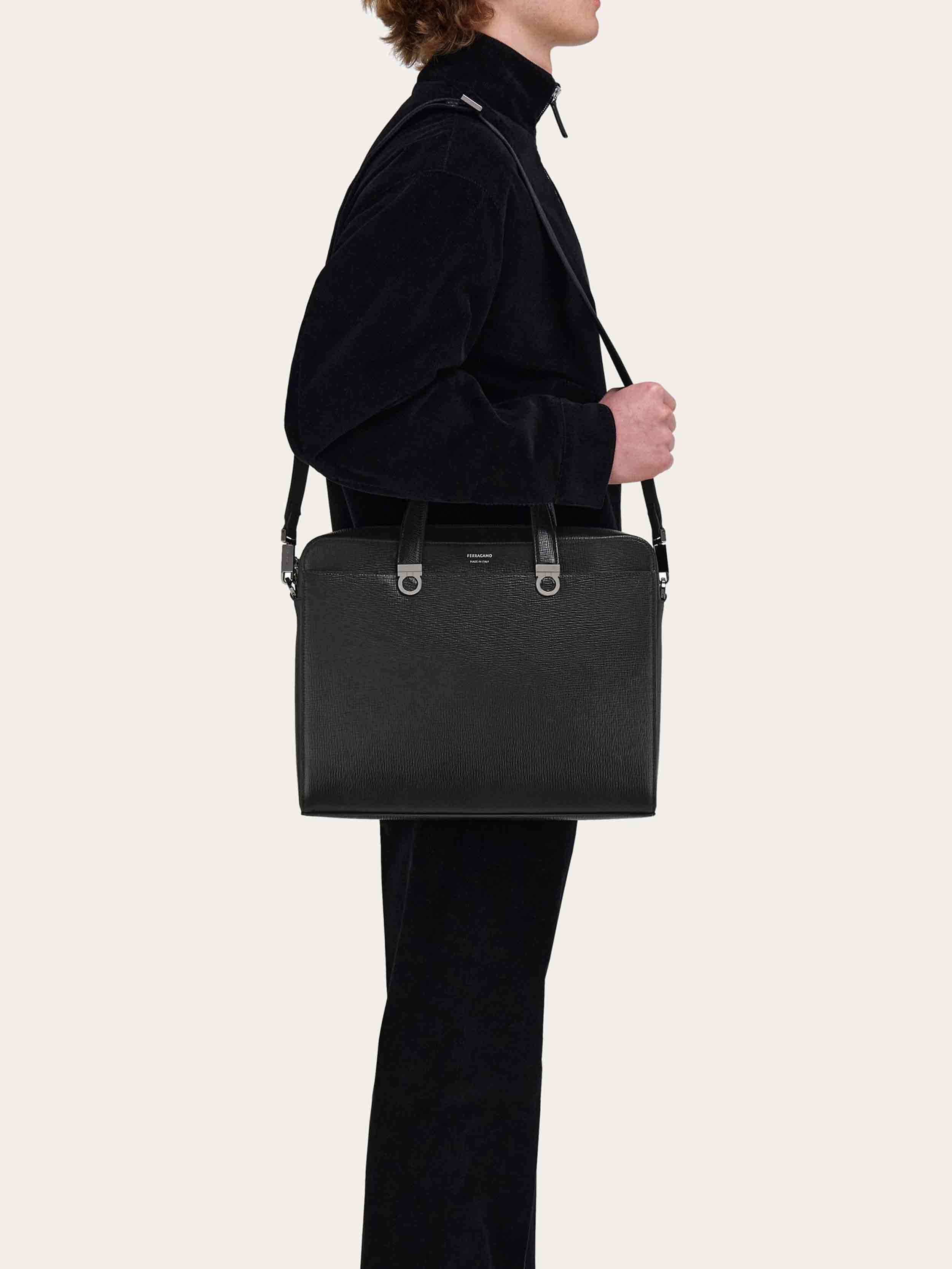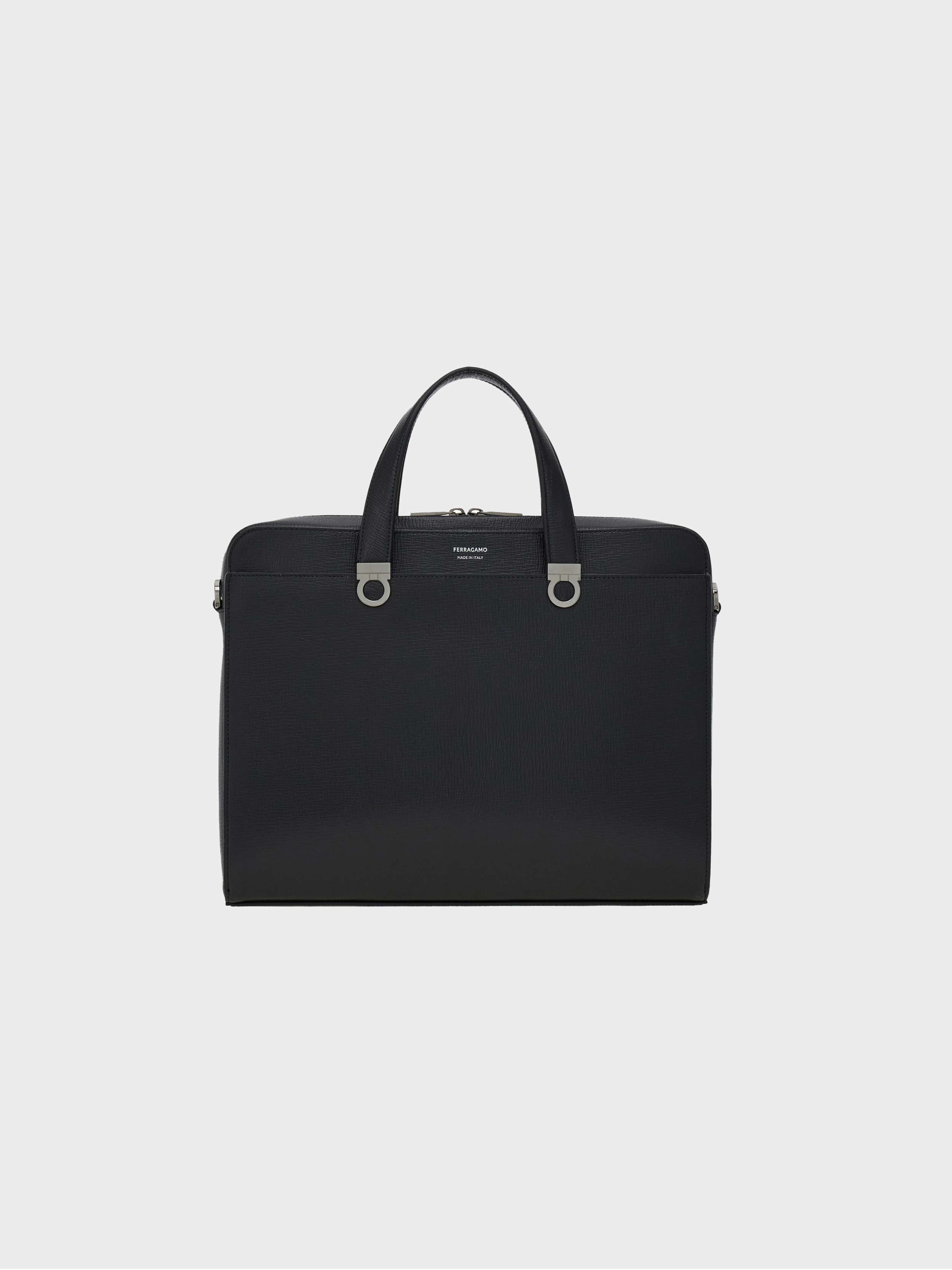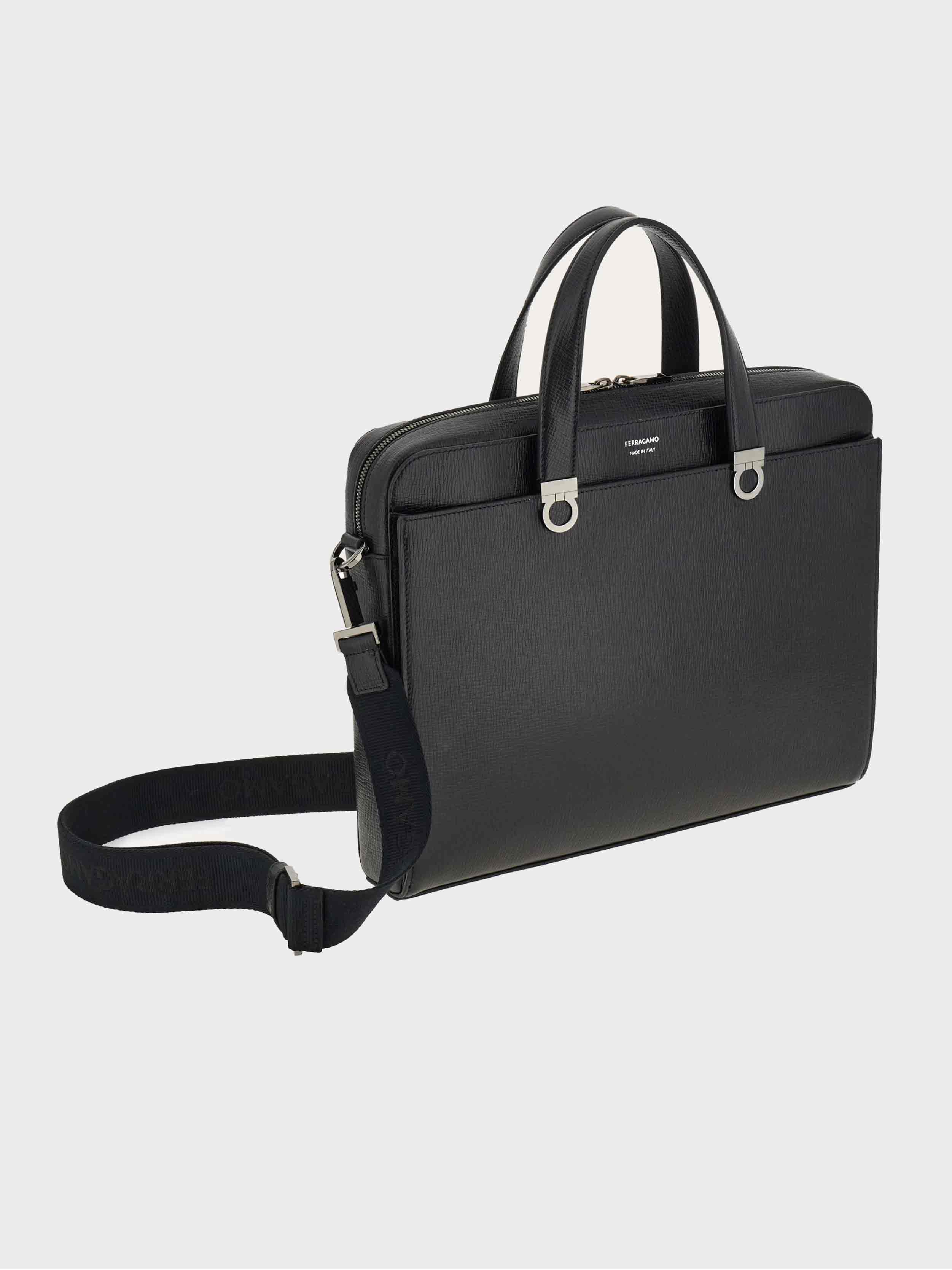 • the hammered leather of this new Ferragamo briefcase is punctuated by ruthenium toned Gancio buckles. Leather top handles and a removable jacquard strap echo its practical style.