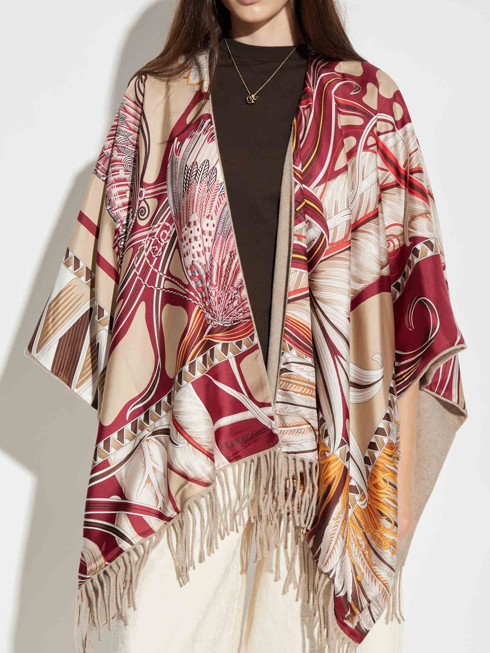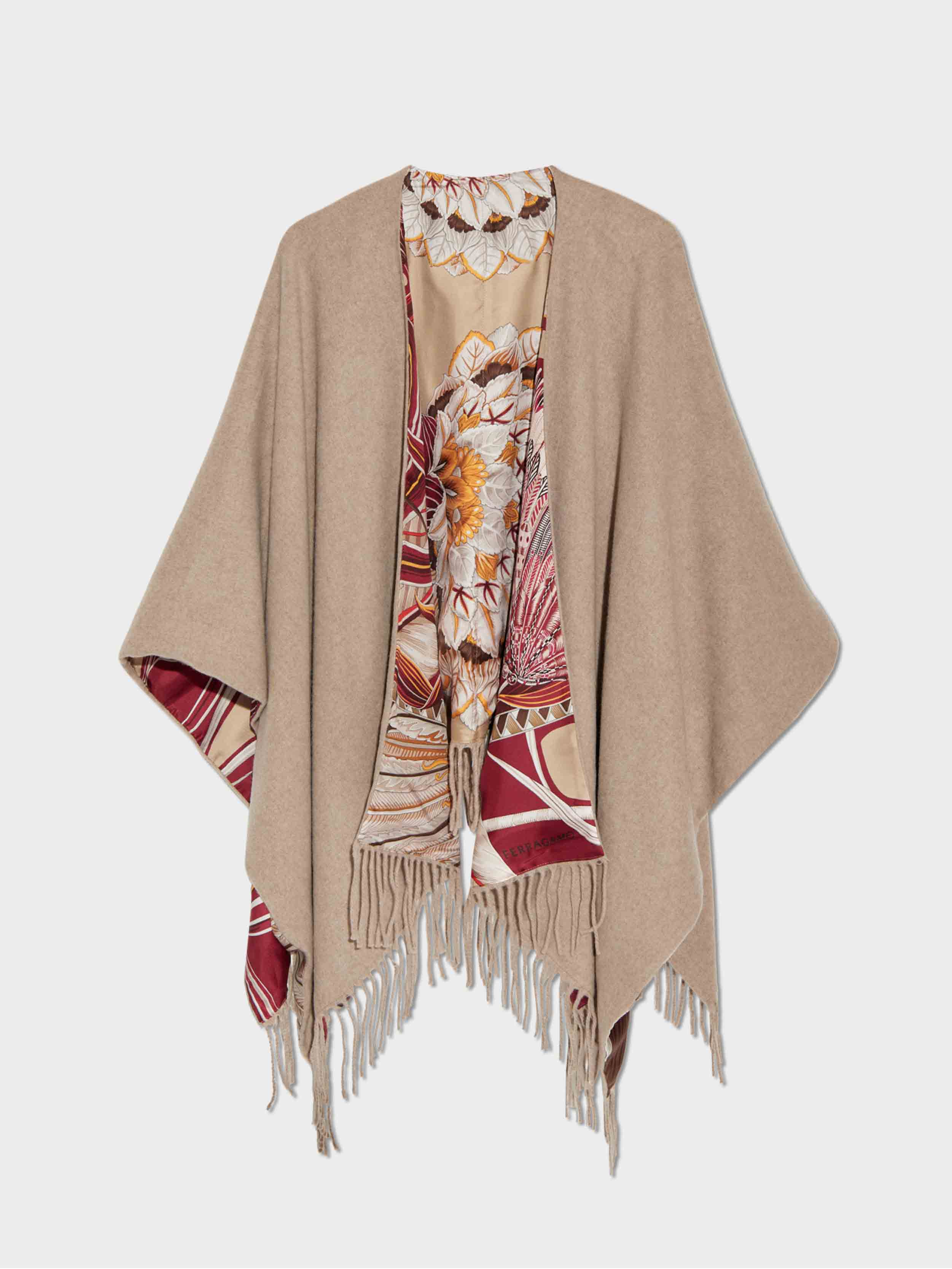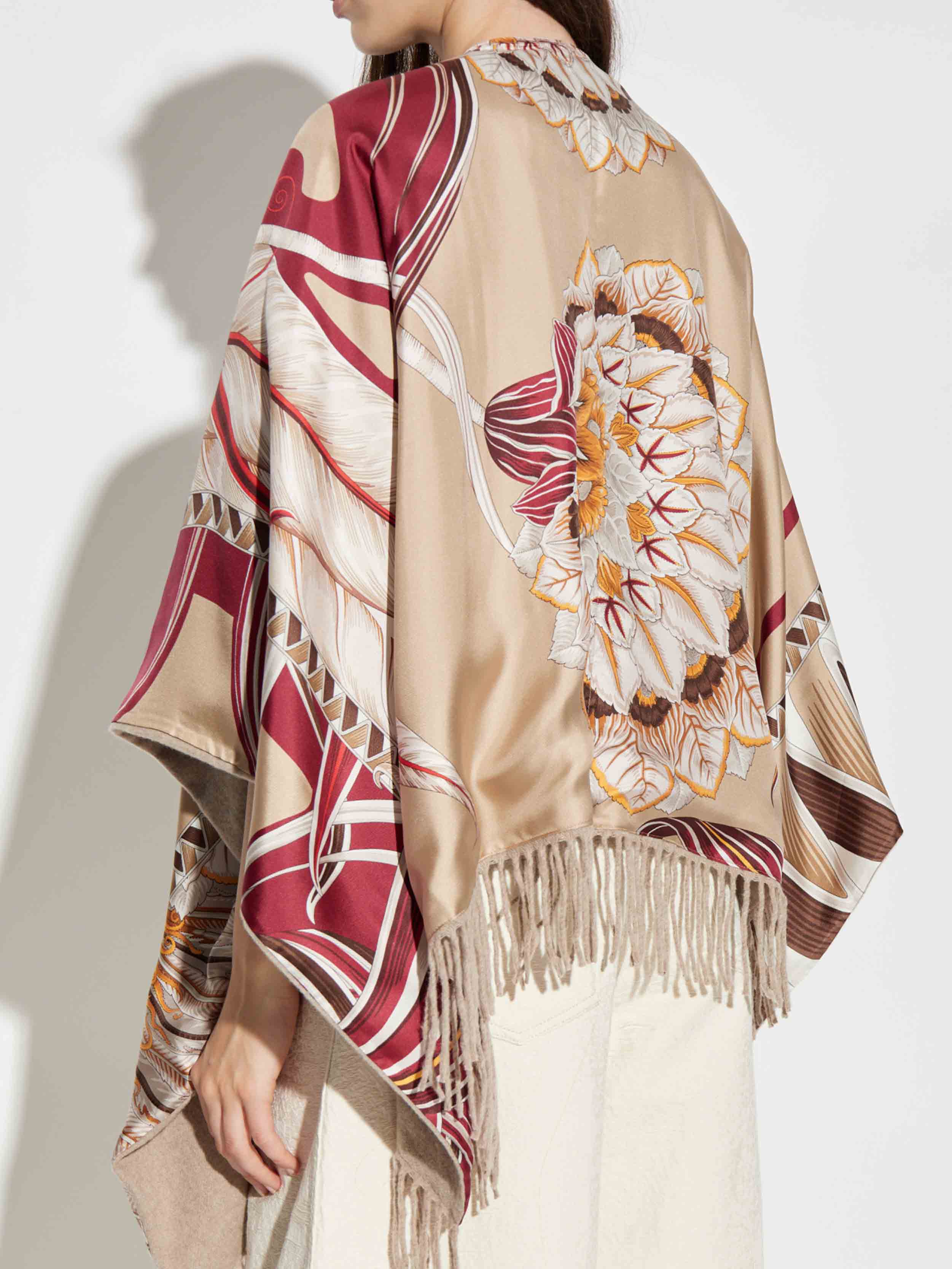 • , this reversible cape features a warm, soft cashmere exterior and a printed silk twill lining showcasing the Giada pattern. Finished with a shawl collar and hand-twisted fringe along the hem for an elegant flourish.
