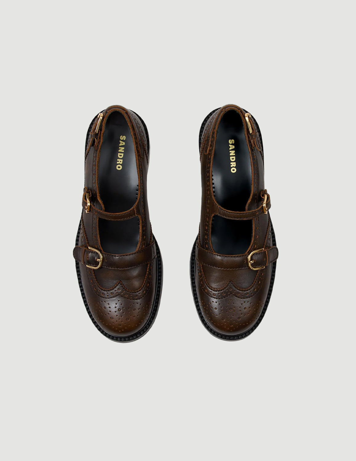 • Perforated leather derbies with adjustable straps featuring contrasting tips, and an adjustable strap.