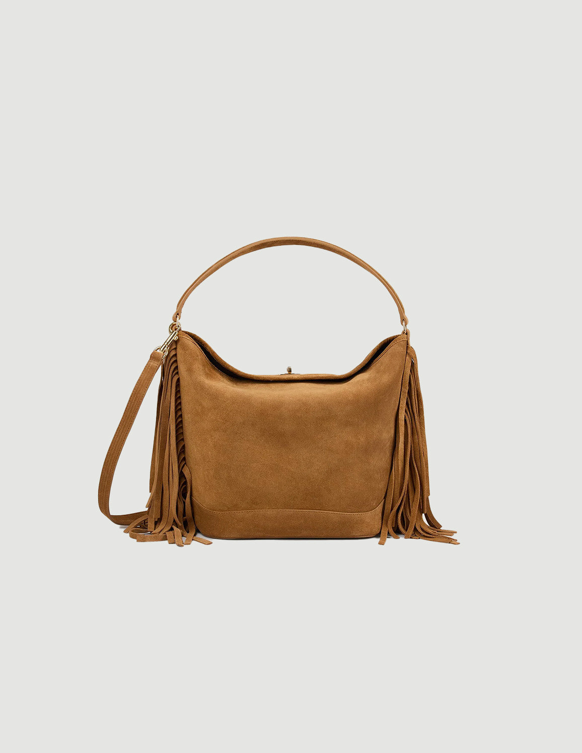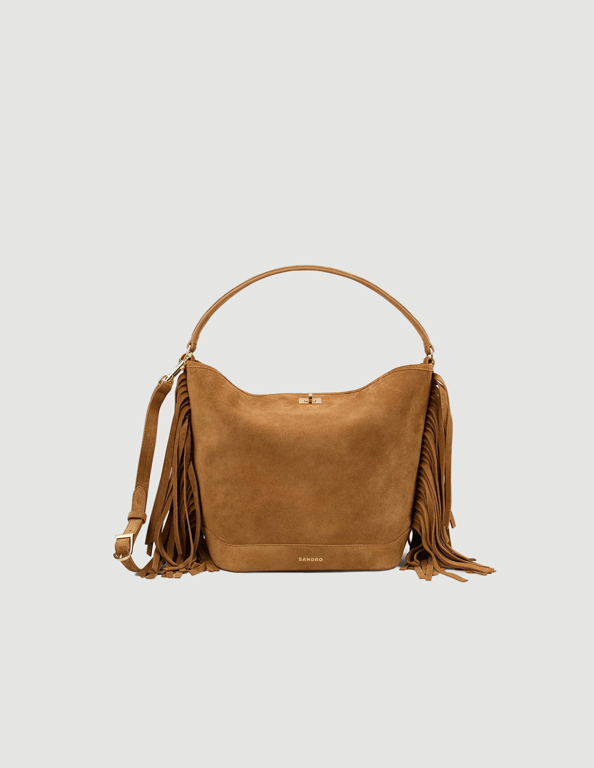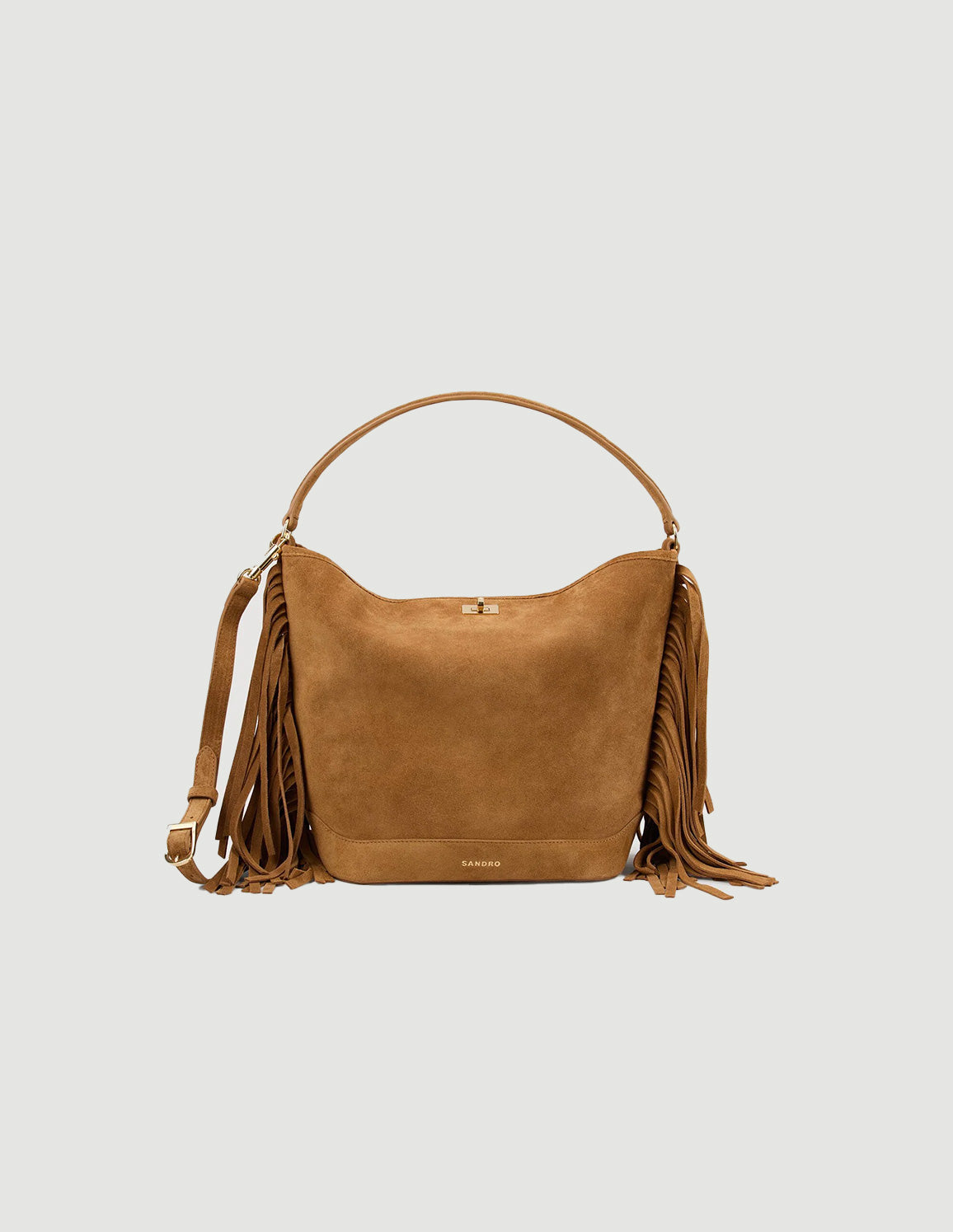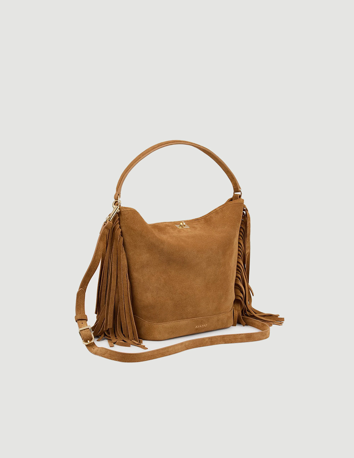 • TANGOSO bucket bag in suede and leather with fringes, offering multiple carrying options.