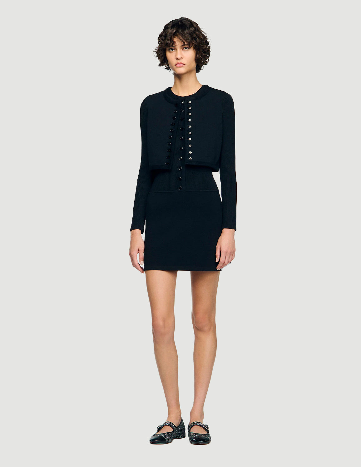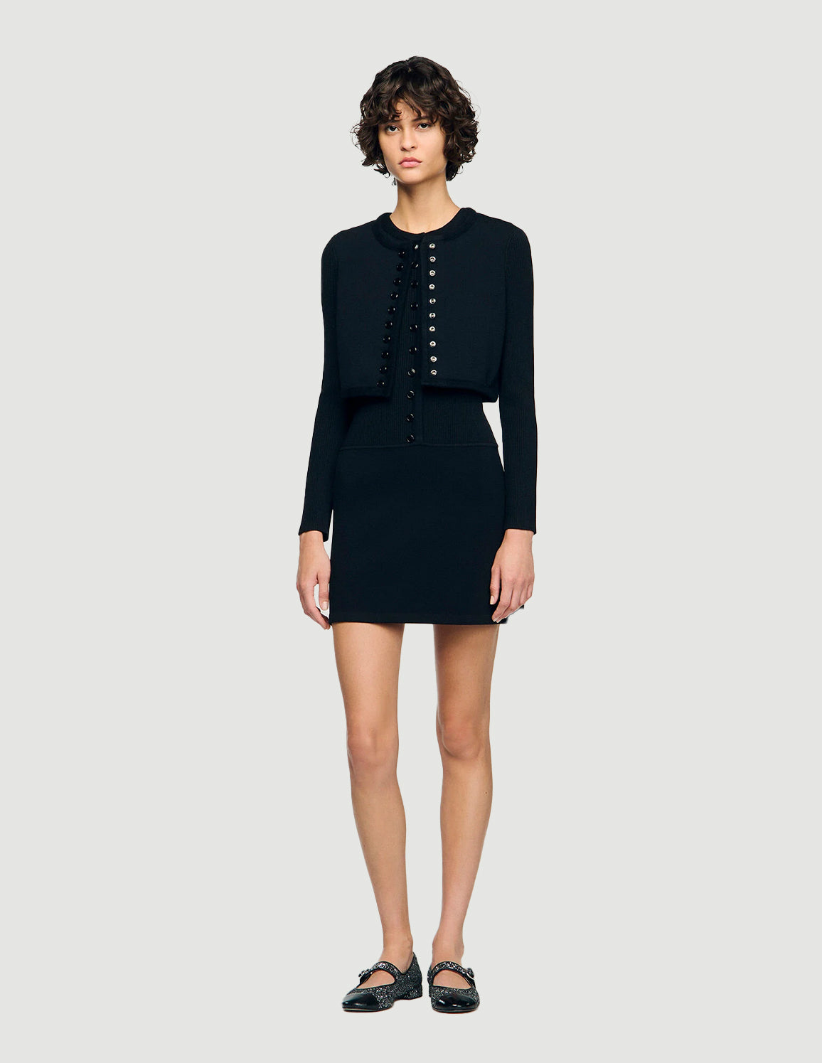• Cropped rib knit cardigan with round neck and long sleeves, with button fastening.