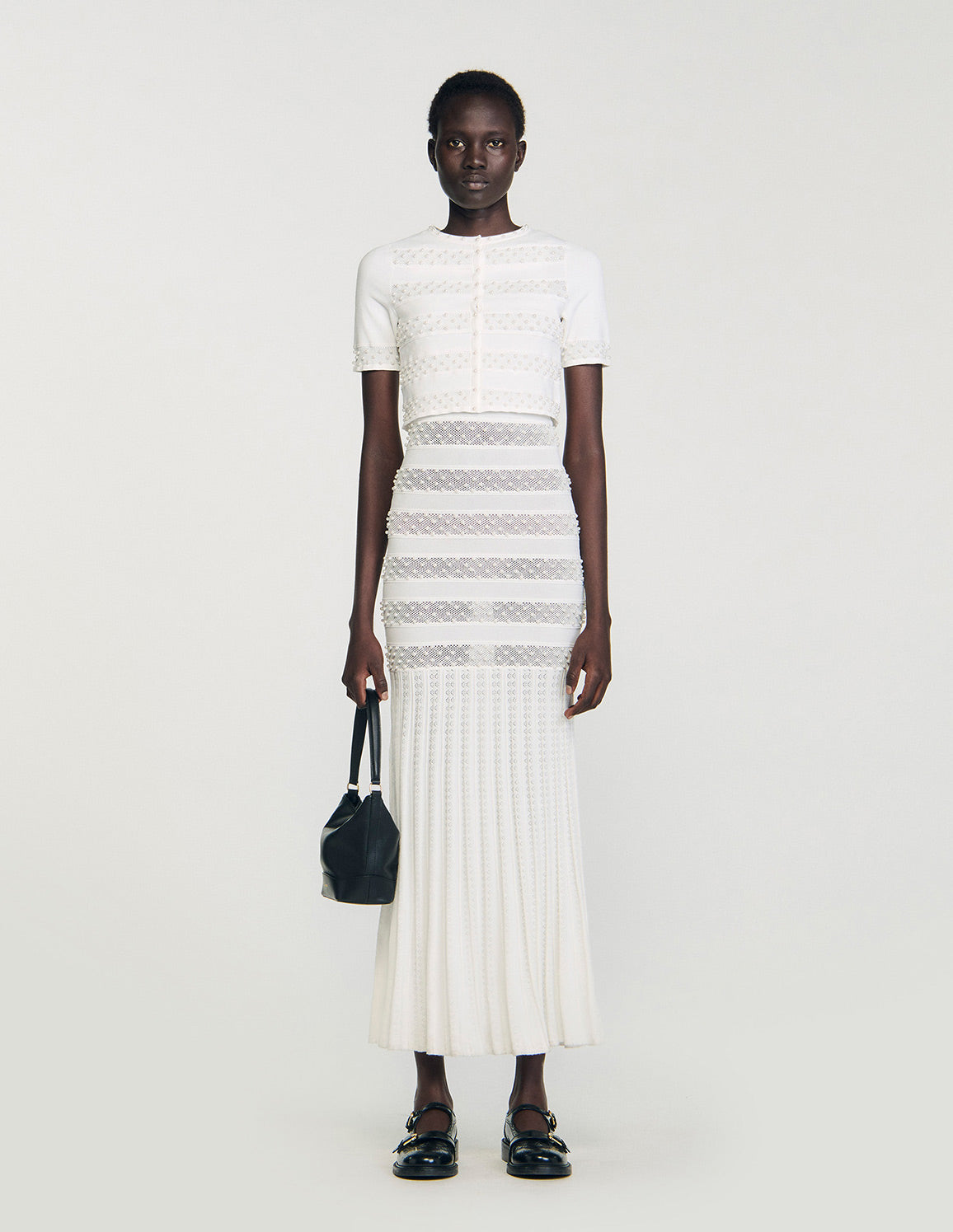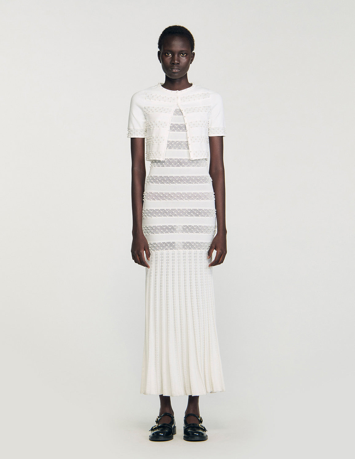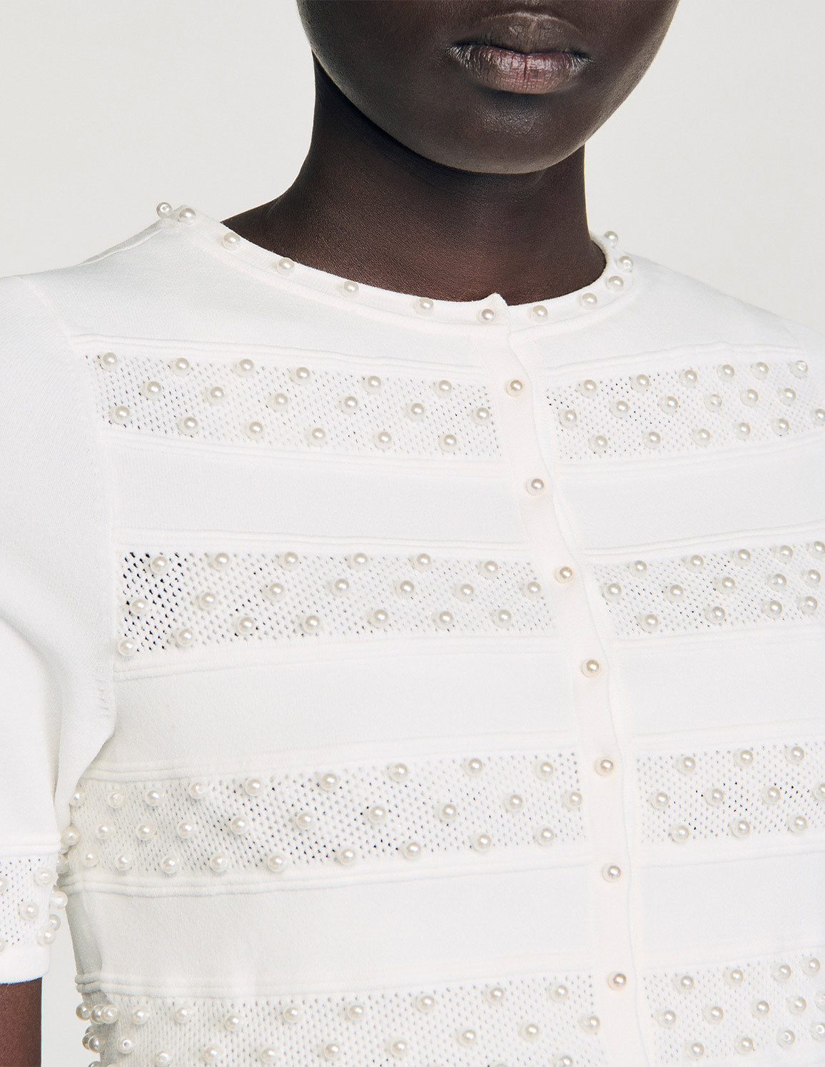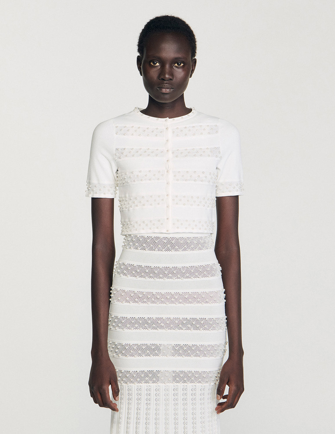 • Cropped cardigan with round neck, short sleeves, button fastening, and embellished with beaded stripes.