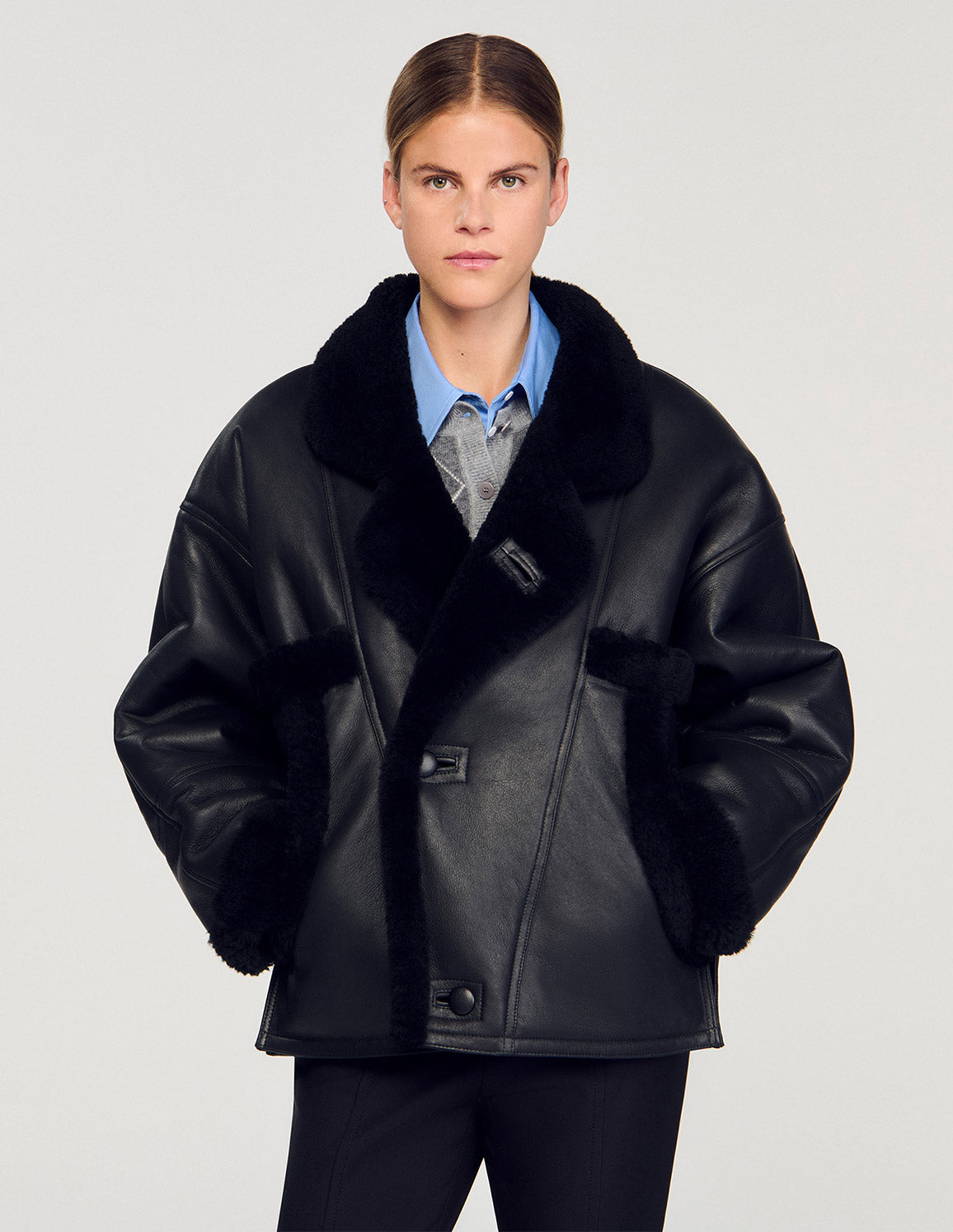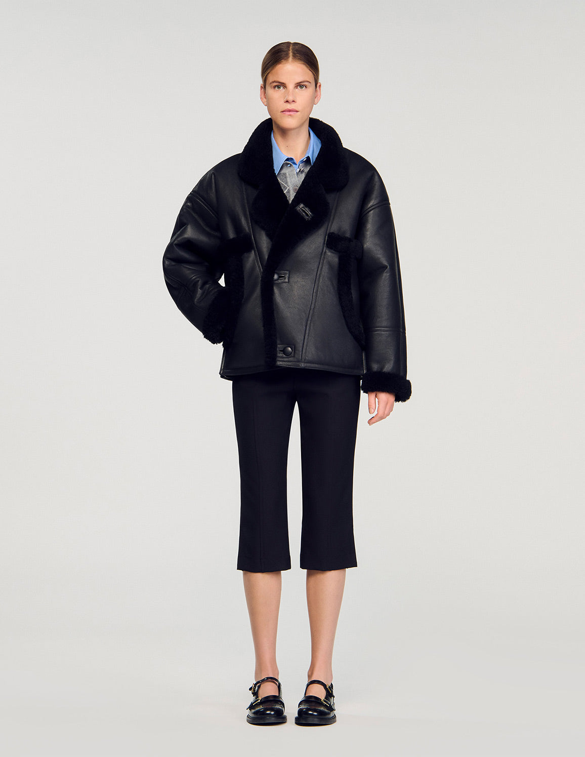 • Short shearling coat with lapel collar and button fastening.