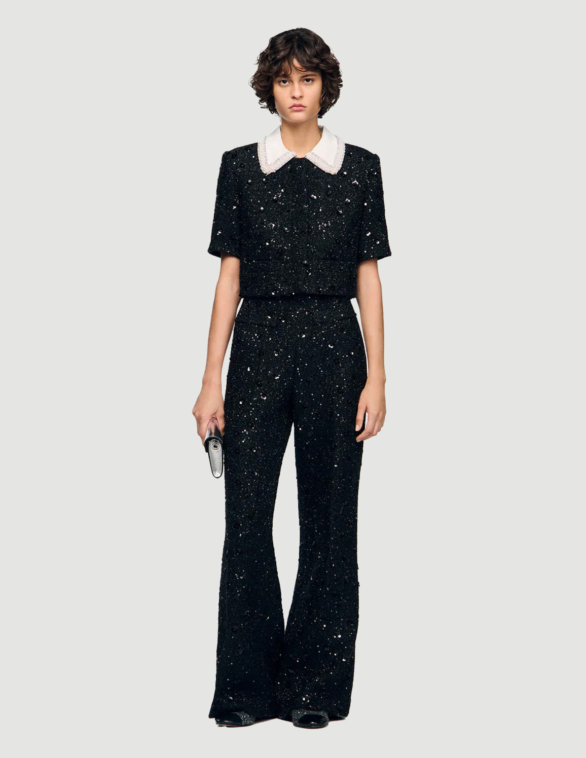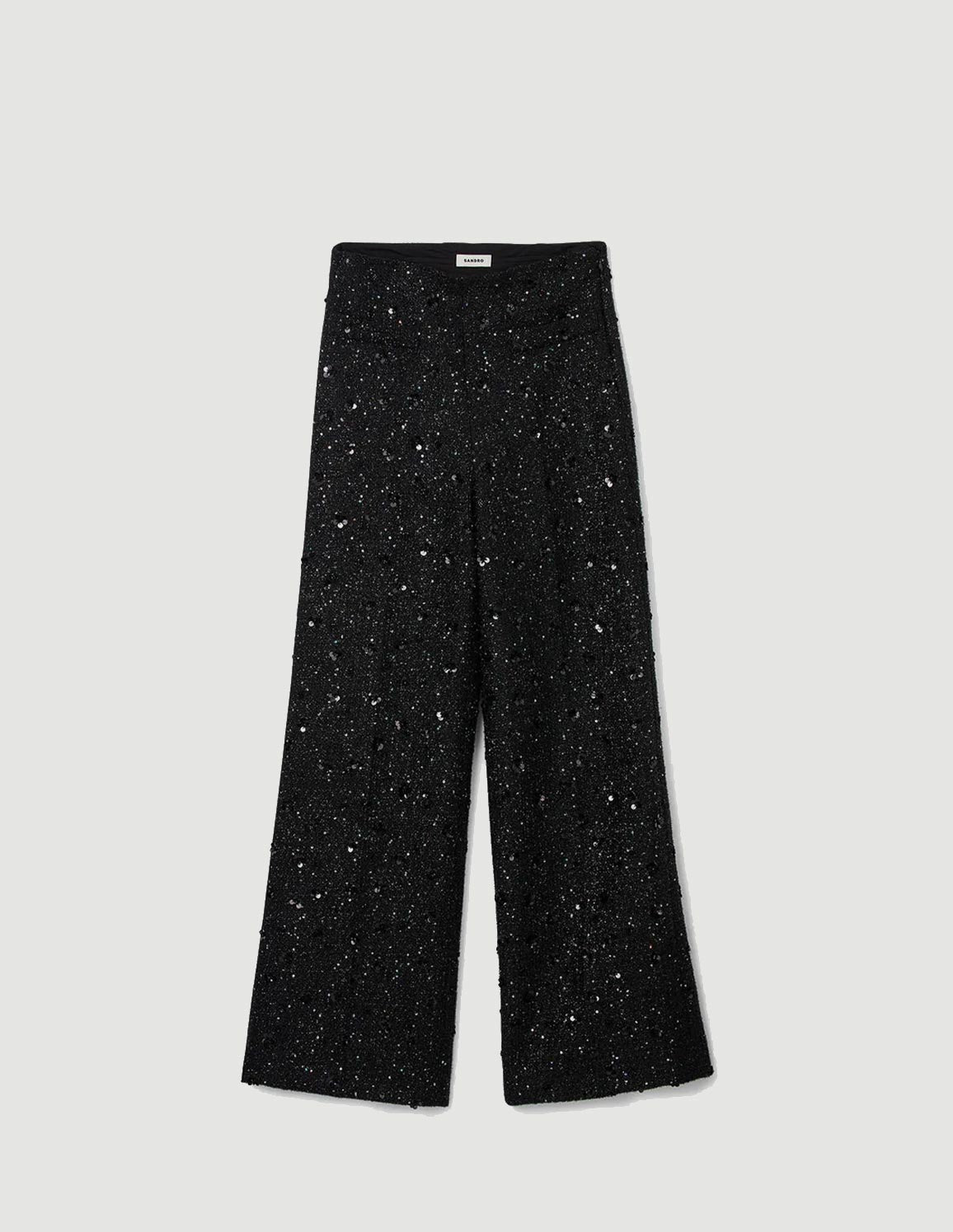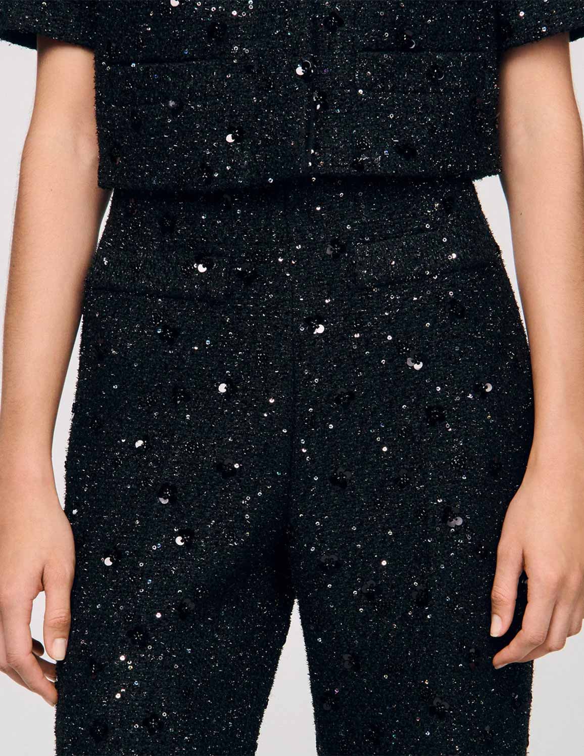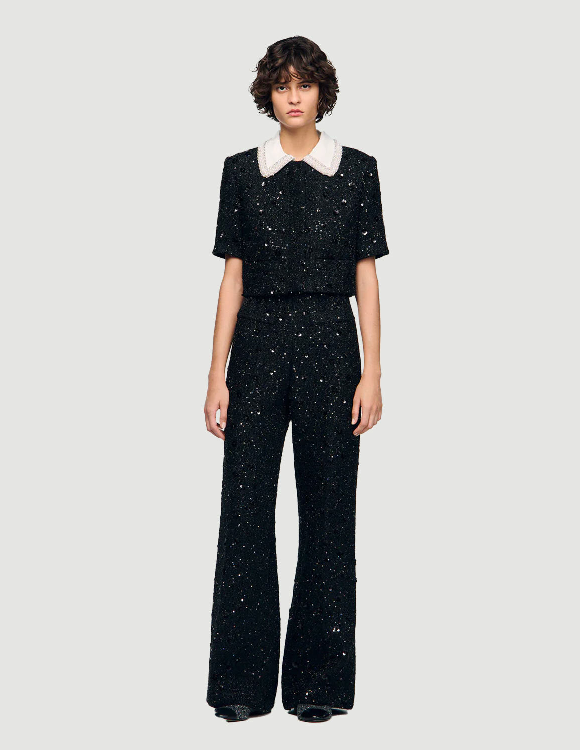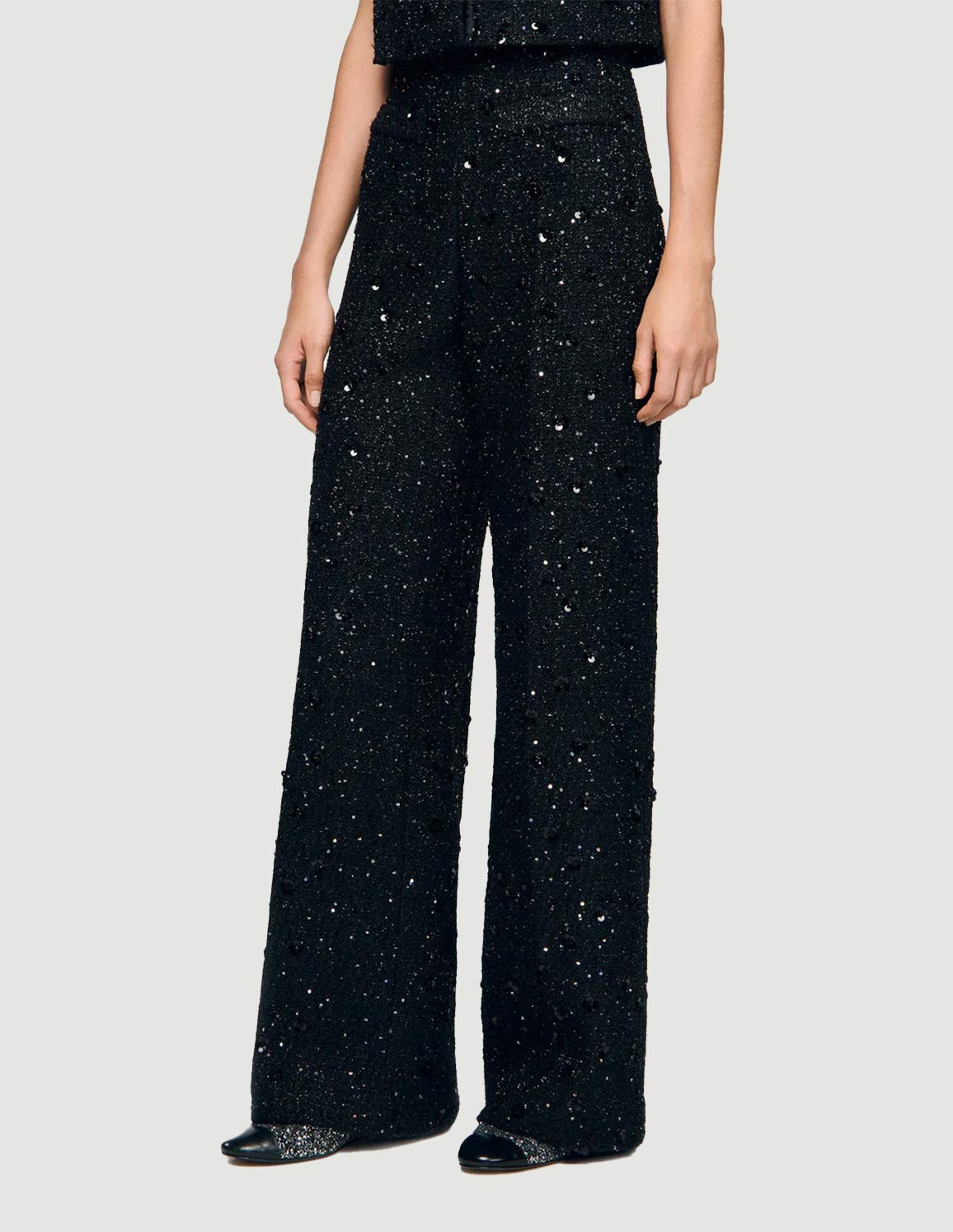• Straight-leg, wide-leg tweed trousers embellished with pearls and sequins.