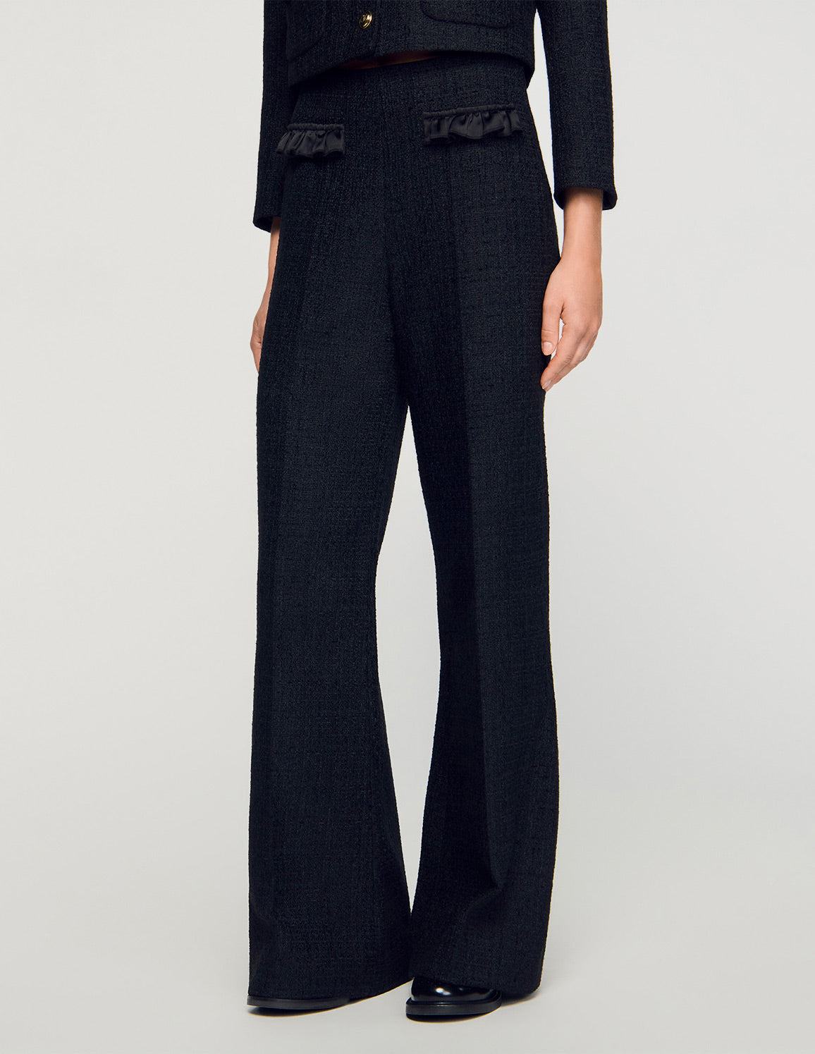 • High-waisted tweed suit trousers with ironed creases and satin ruffle pockets.