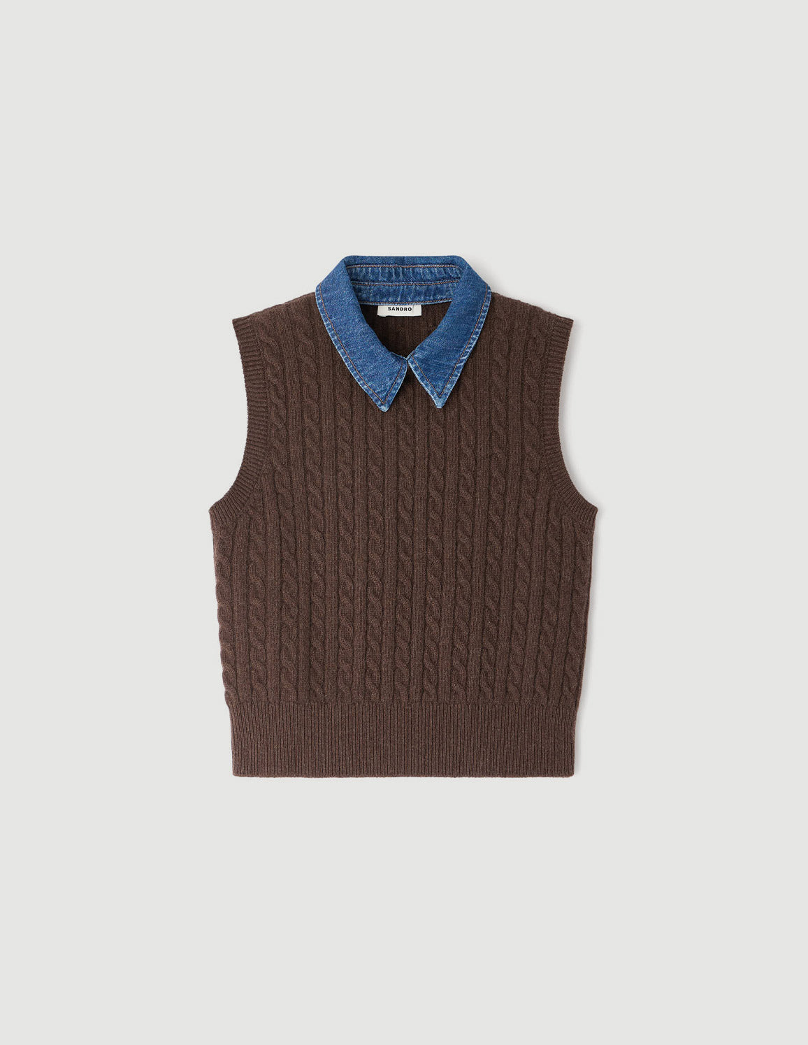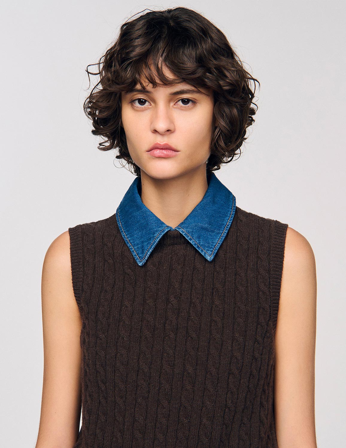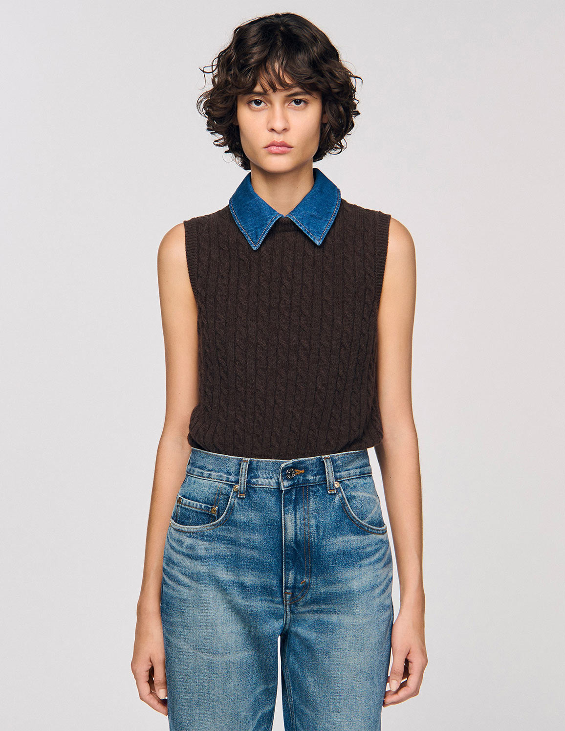 • Sleeveless cropped cable knit jumper with a denim collar and contrasting embroidery on the chest.