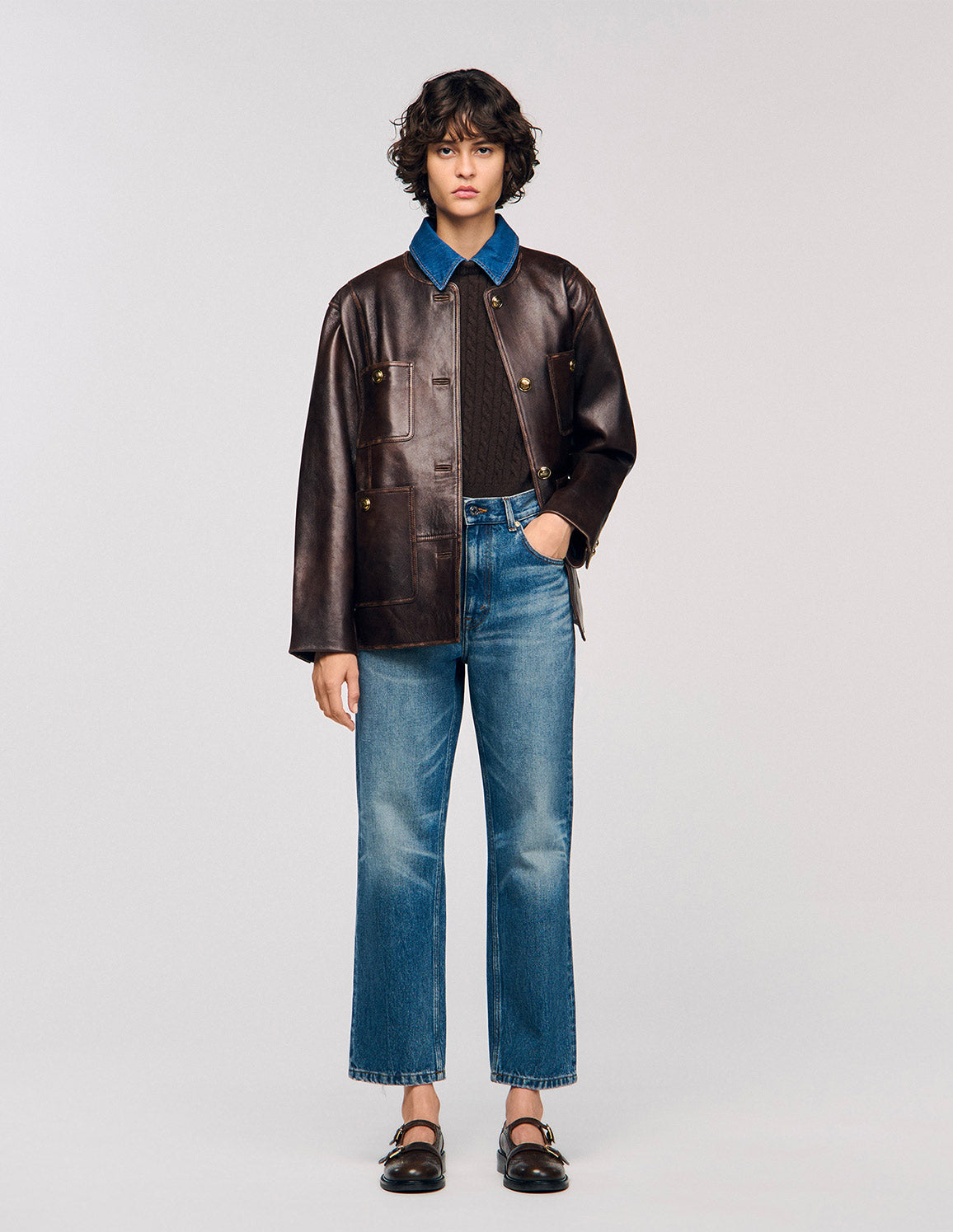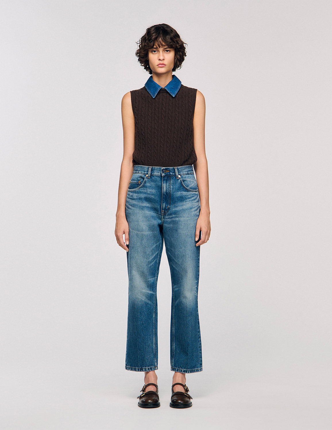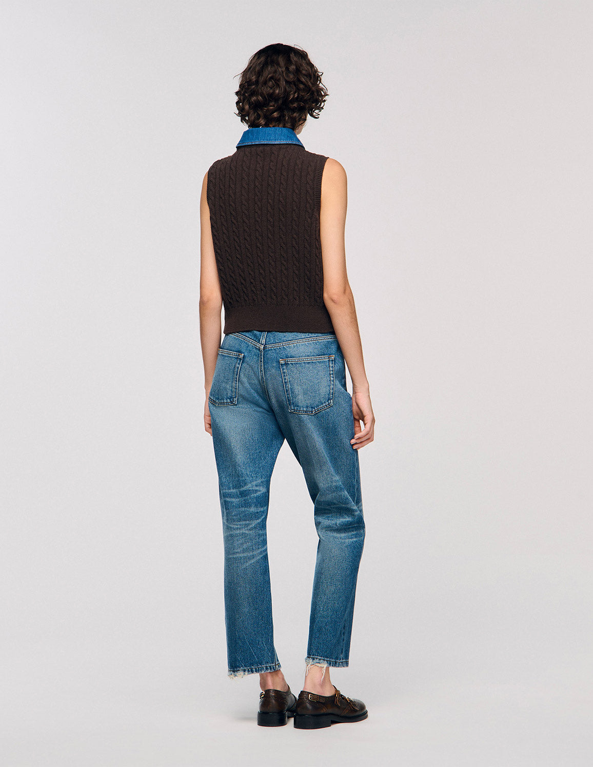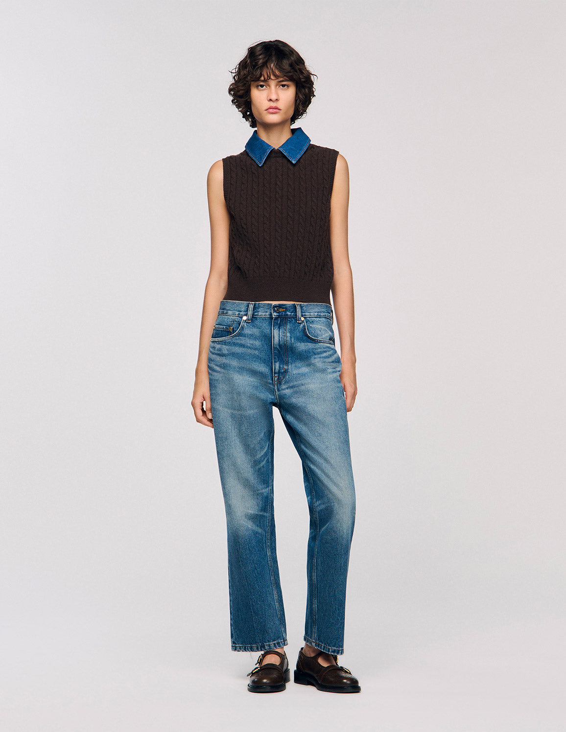 • Sleeveless cropped cable knit jumper with a denim collar and contrasting embroidery on the chest.