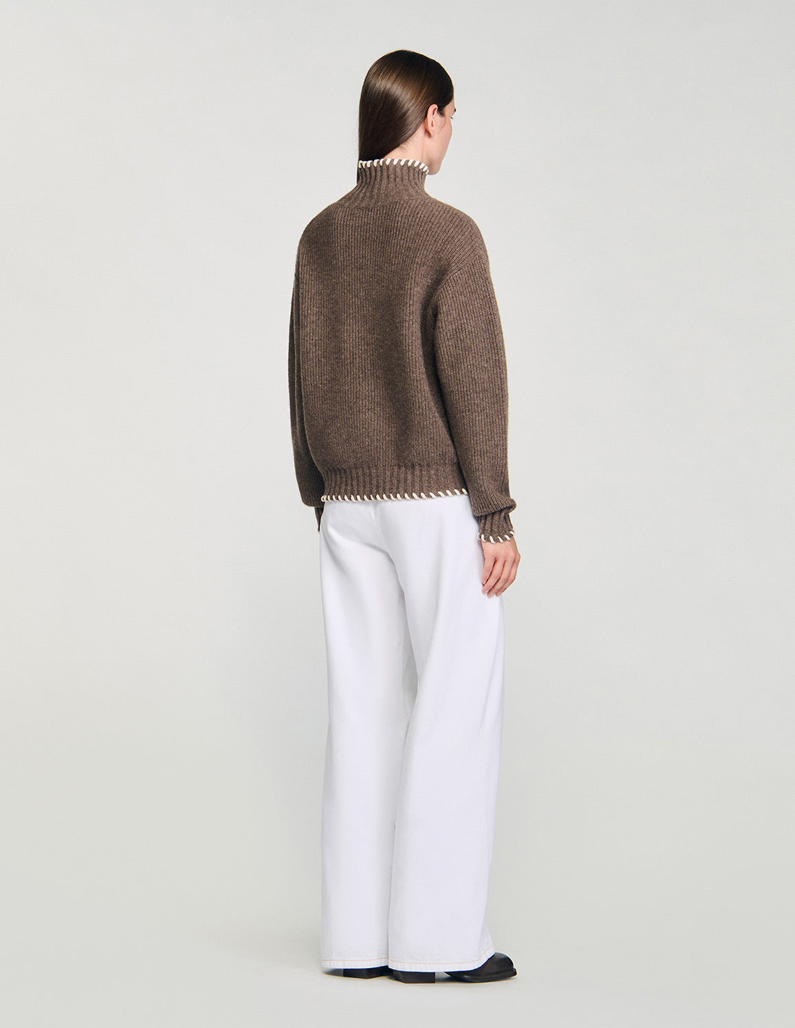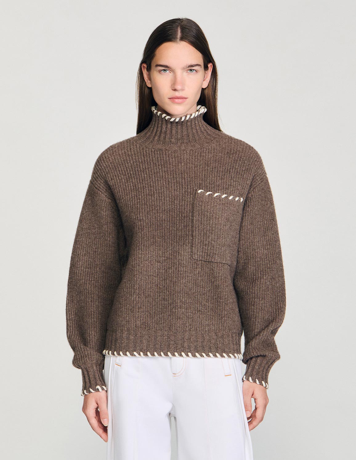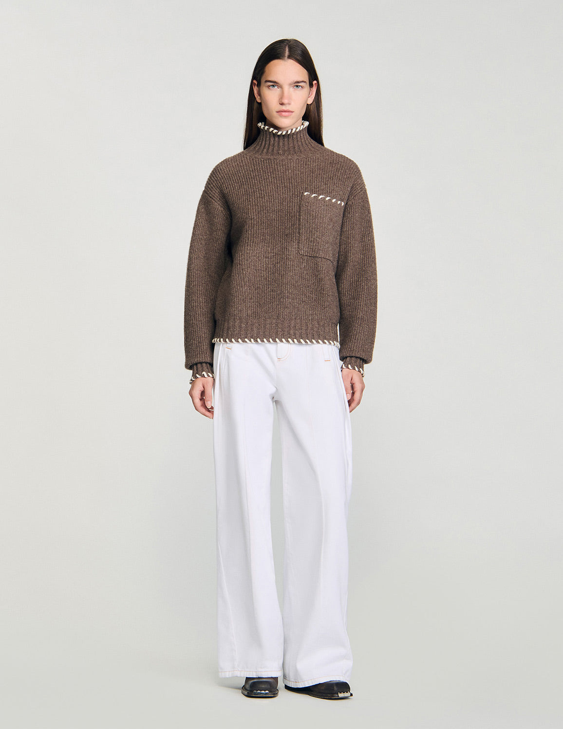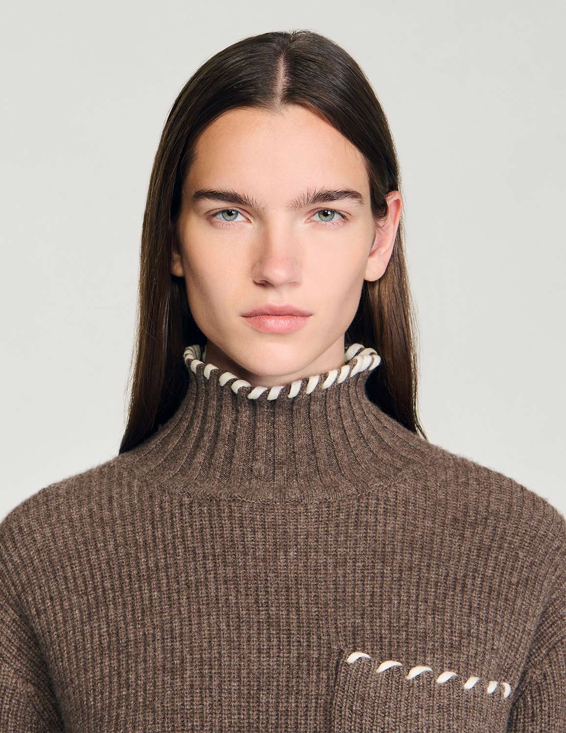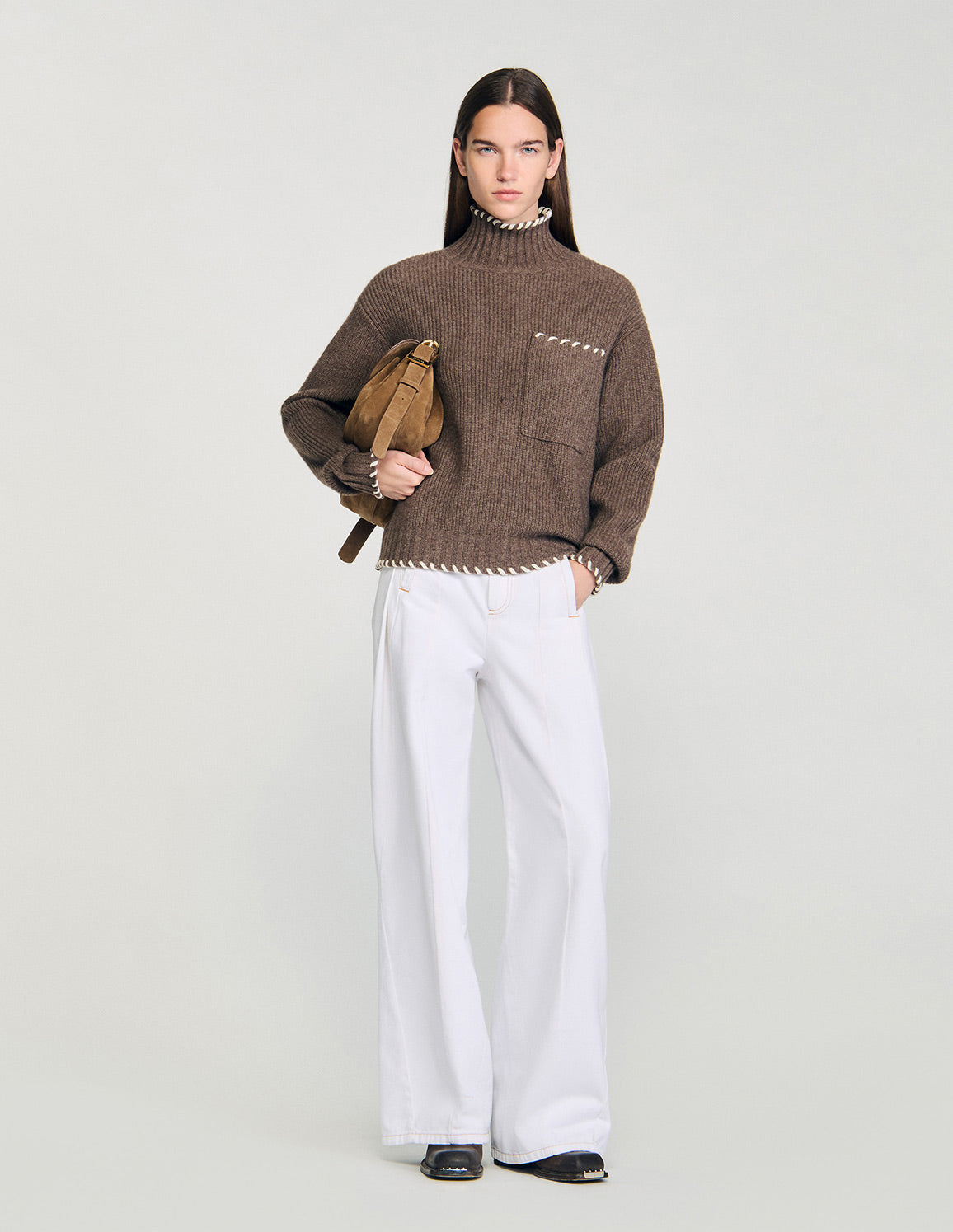 • Oversized turtleneck jumper with long sleeves in fine rib knit, featuring contrasting trims and a patch pocket on the chest.