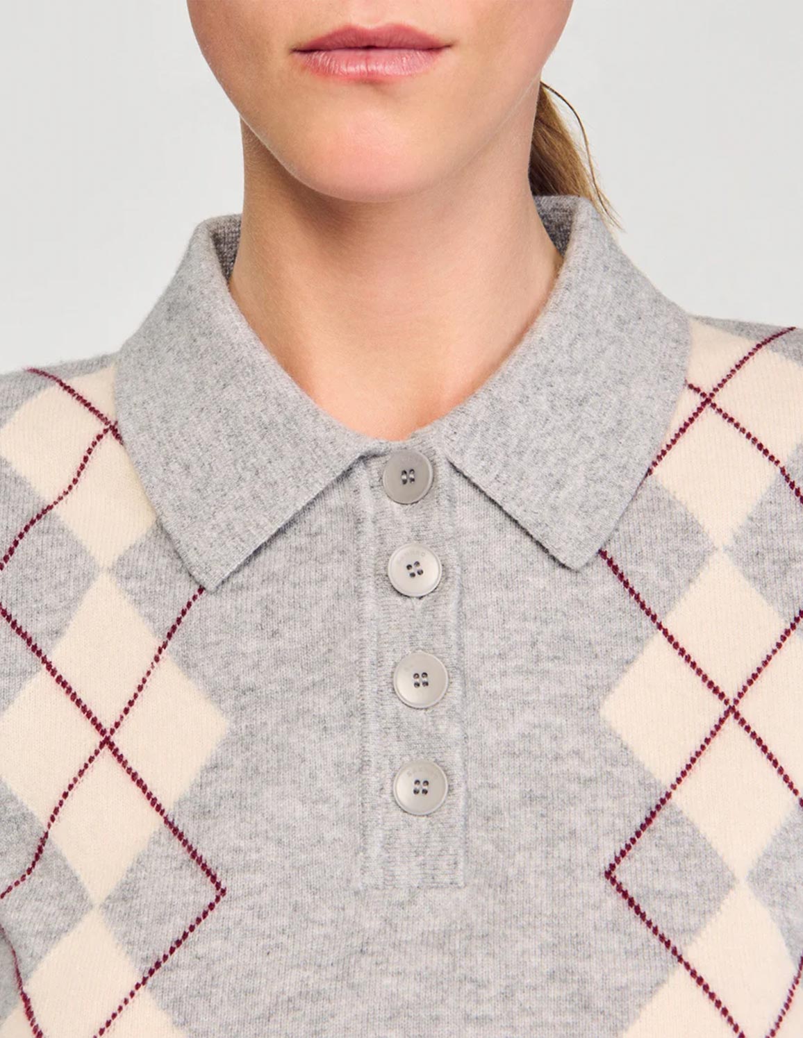 • Fine knit jumper with buttoned polo collar and long sleeves, featuring a diamond pattern.