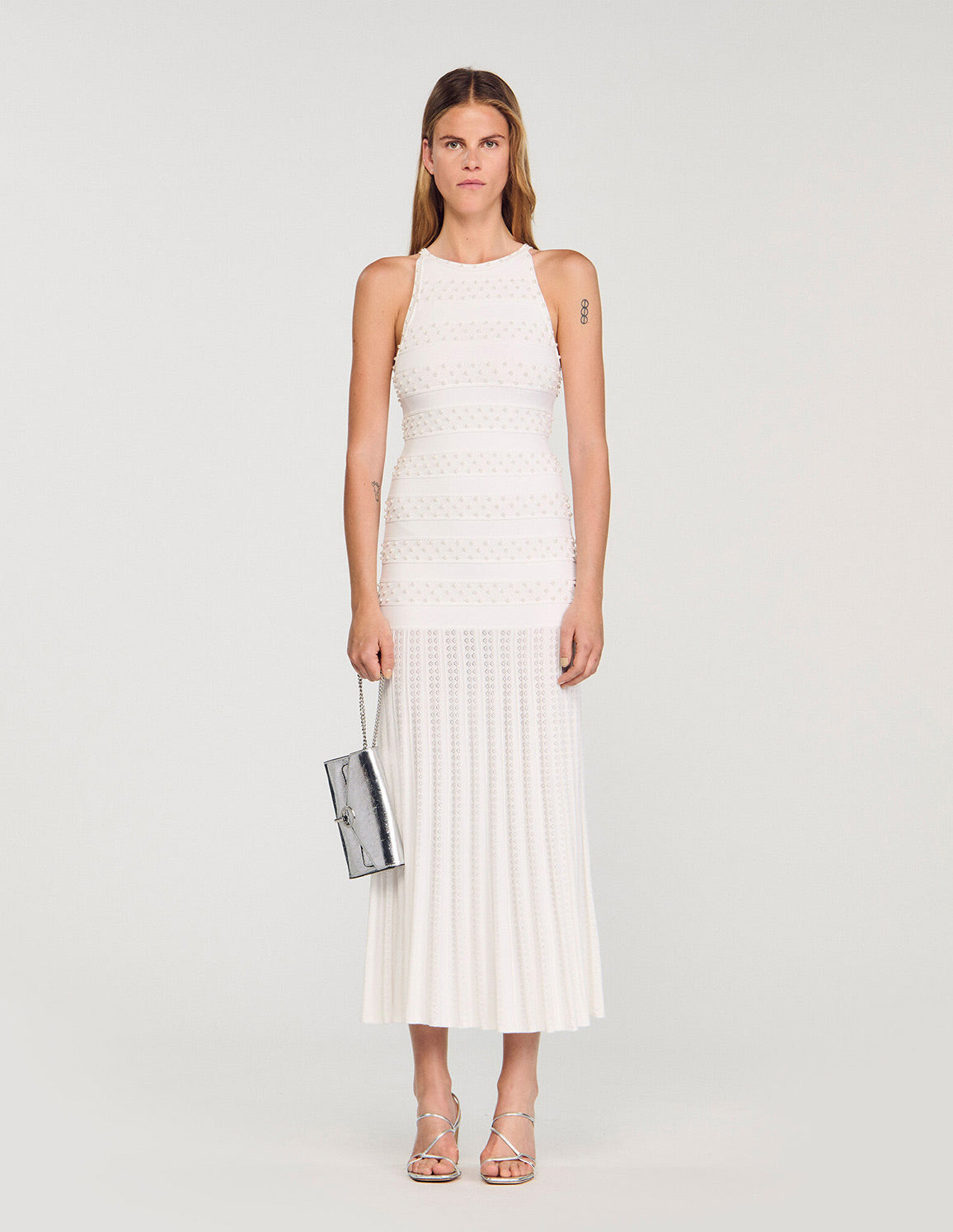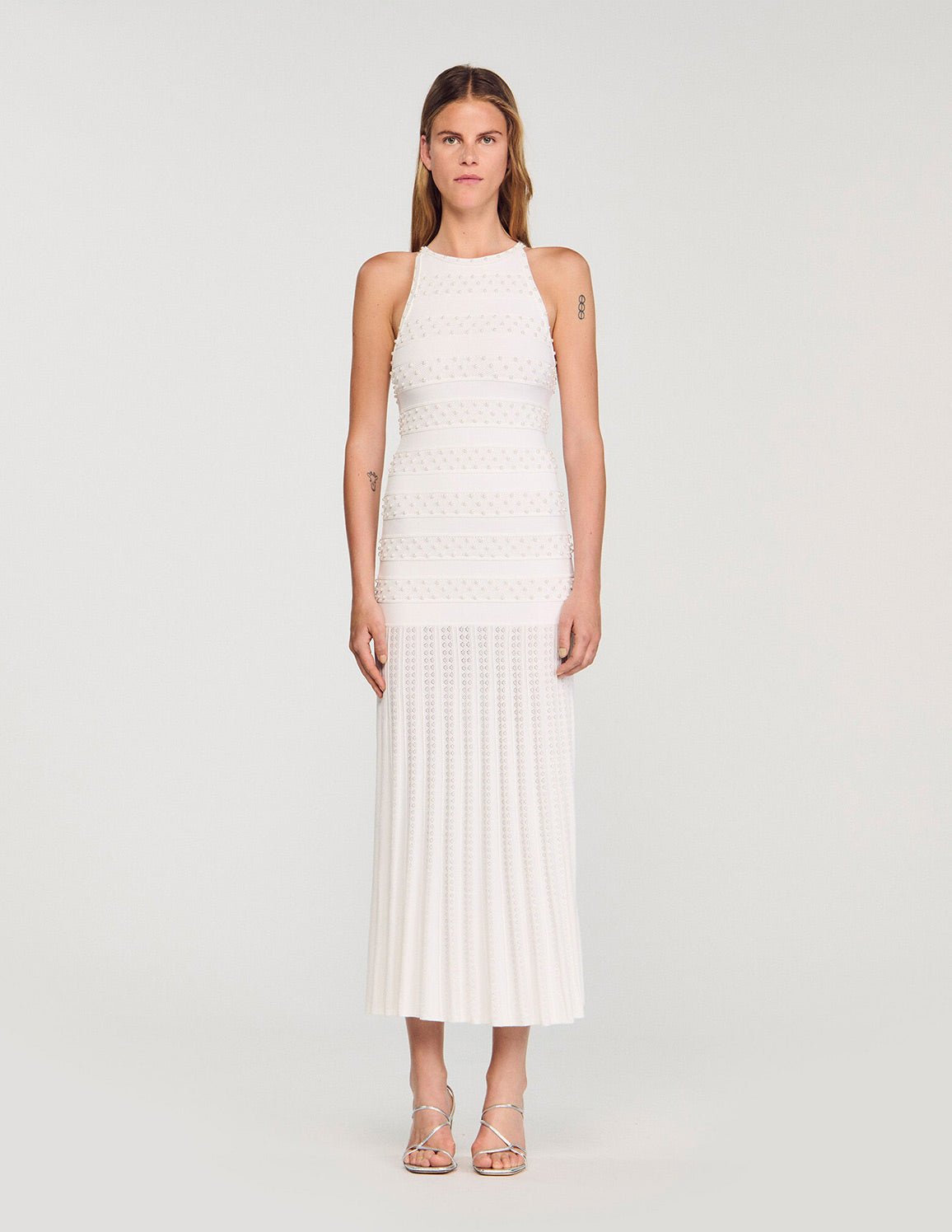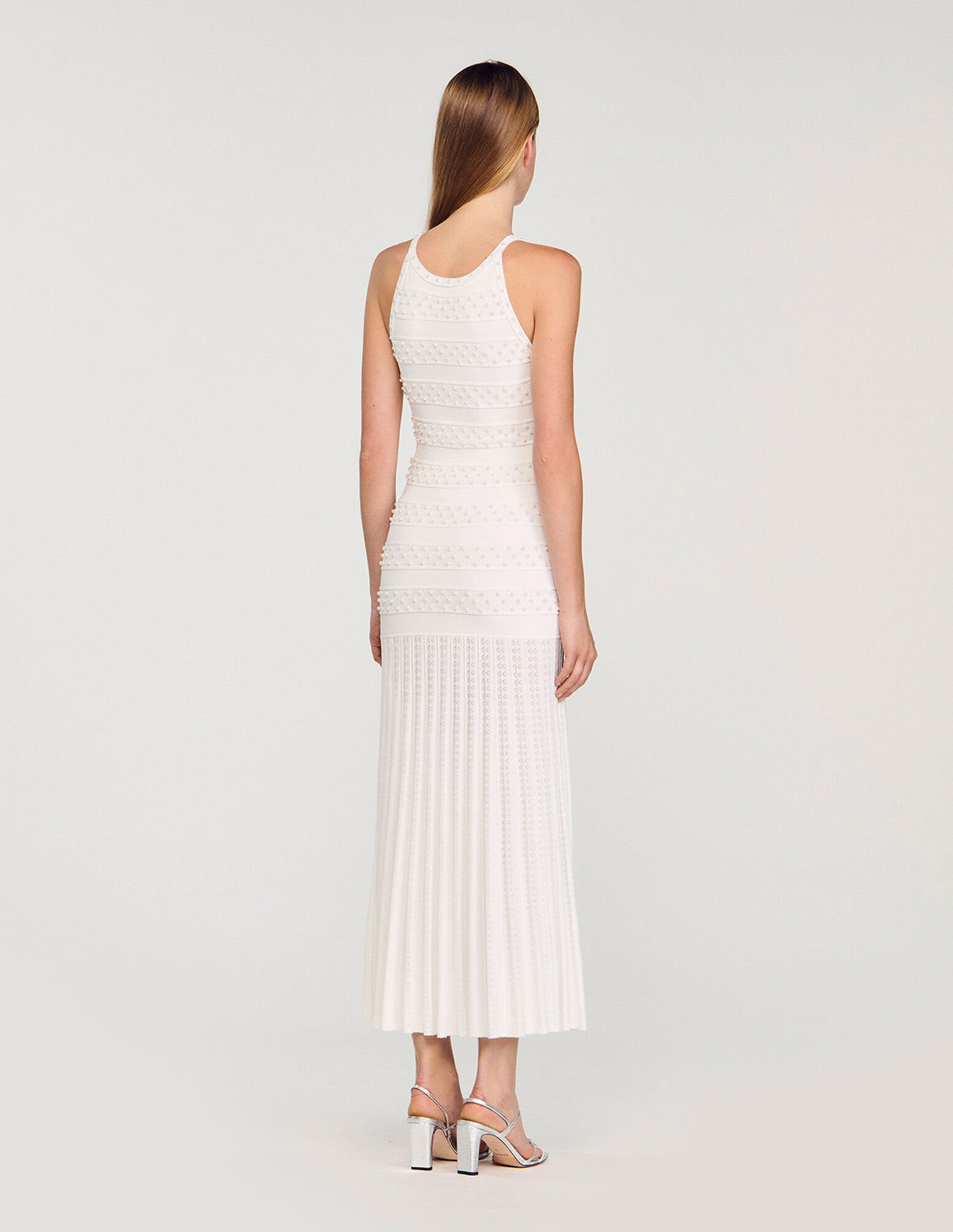 • Sleeveless long striped and beaded knit dress with a round neck and pearl button fastening.