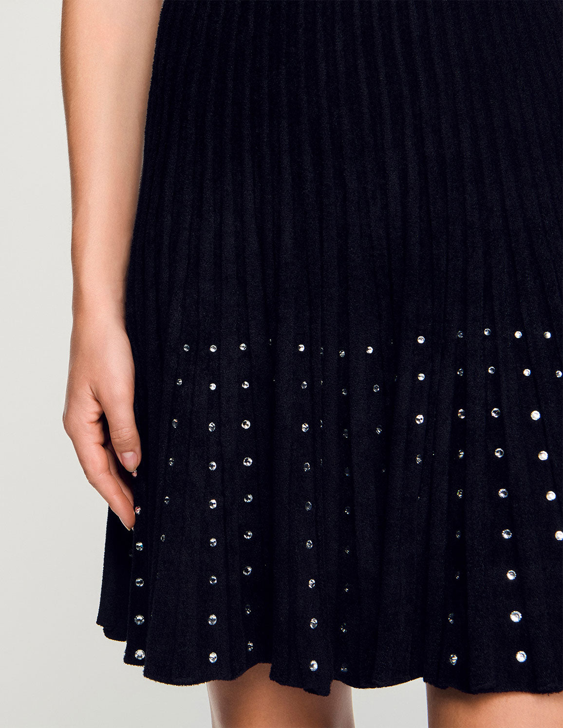 • Velvet knit dress featuring a flared skater skirt adorned with rhinestone lines.