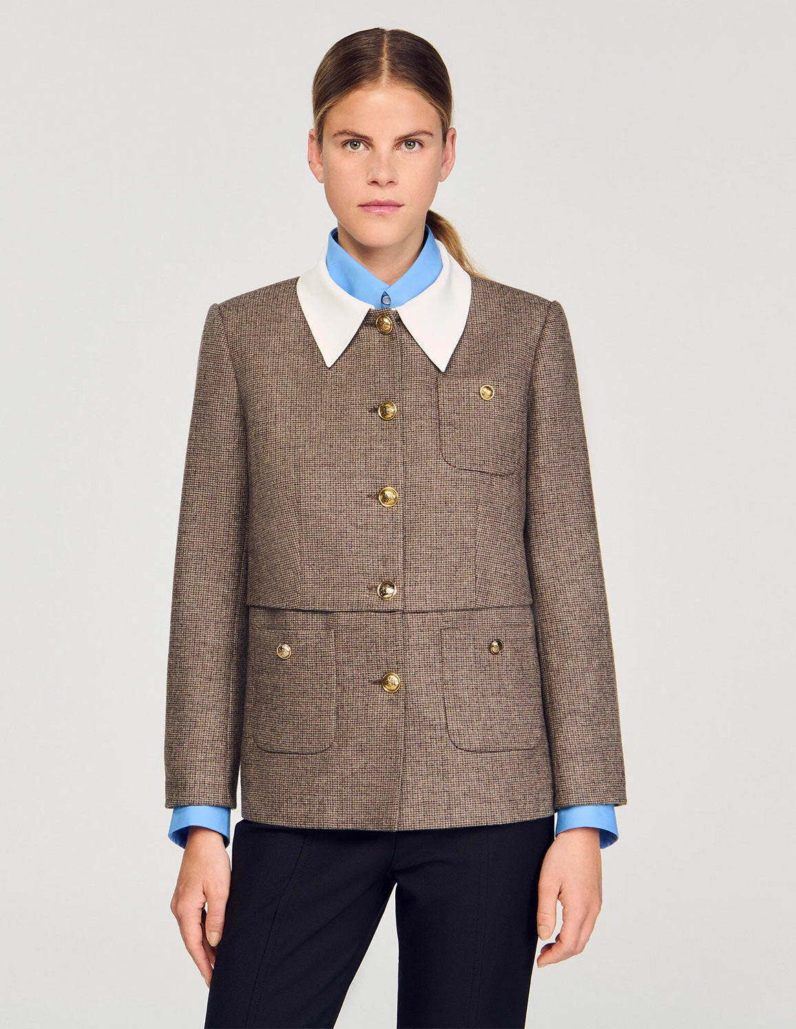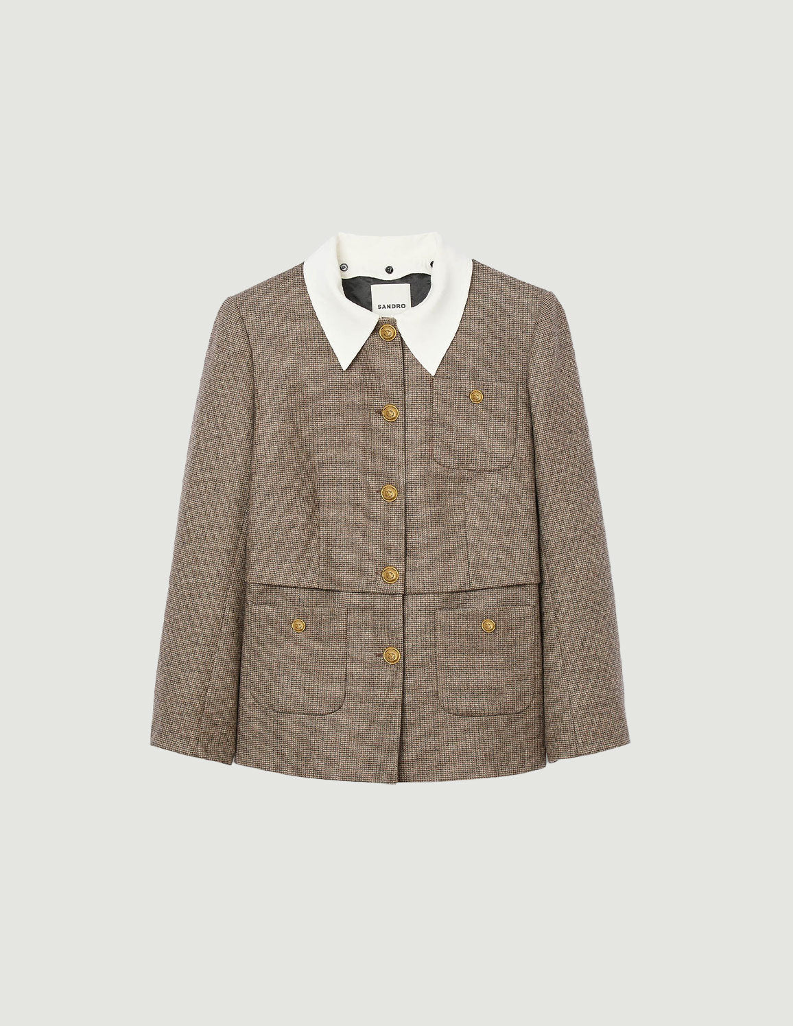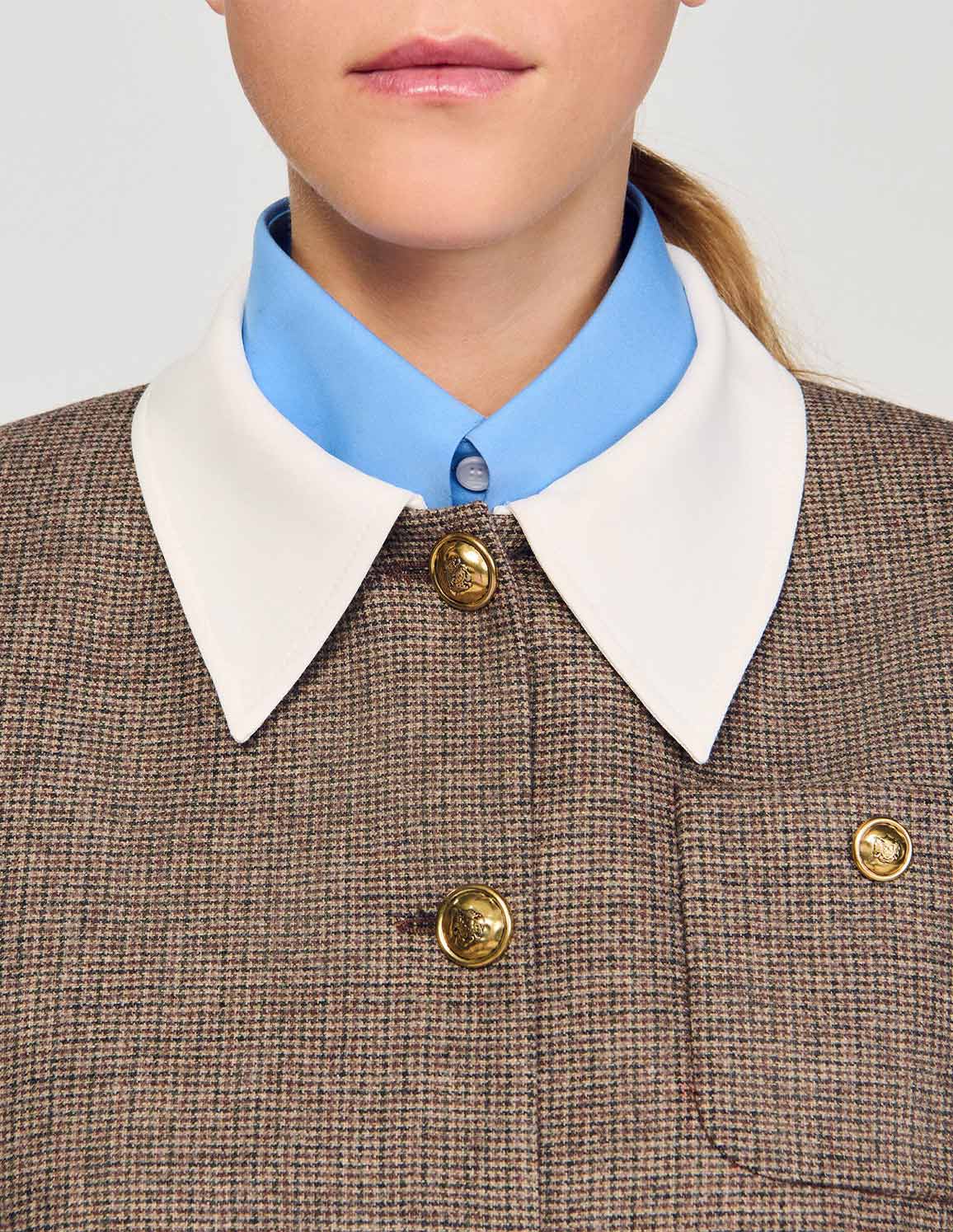 • Houndstooth patterned suit jacket with long sleeves, removable contrasting shirt collar, buttoned patch pockets on chest and sides, and button fastening.