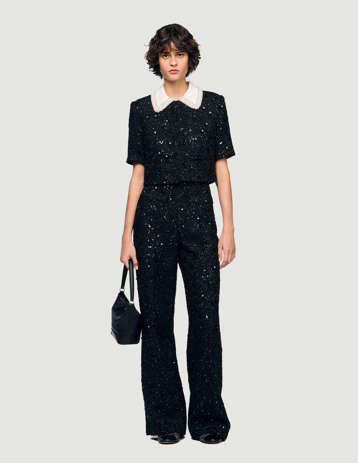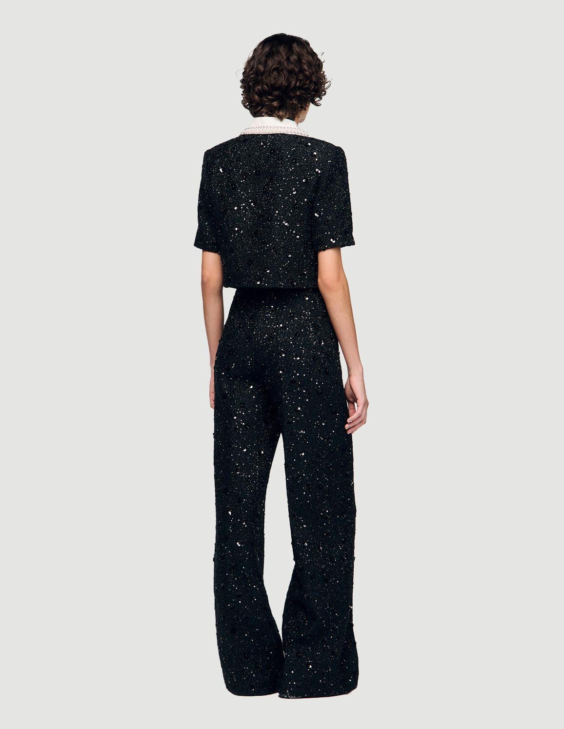 • SANDRO - Women's Rhinestone Tweed Cropped Jacket