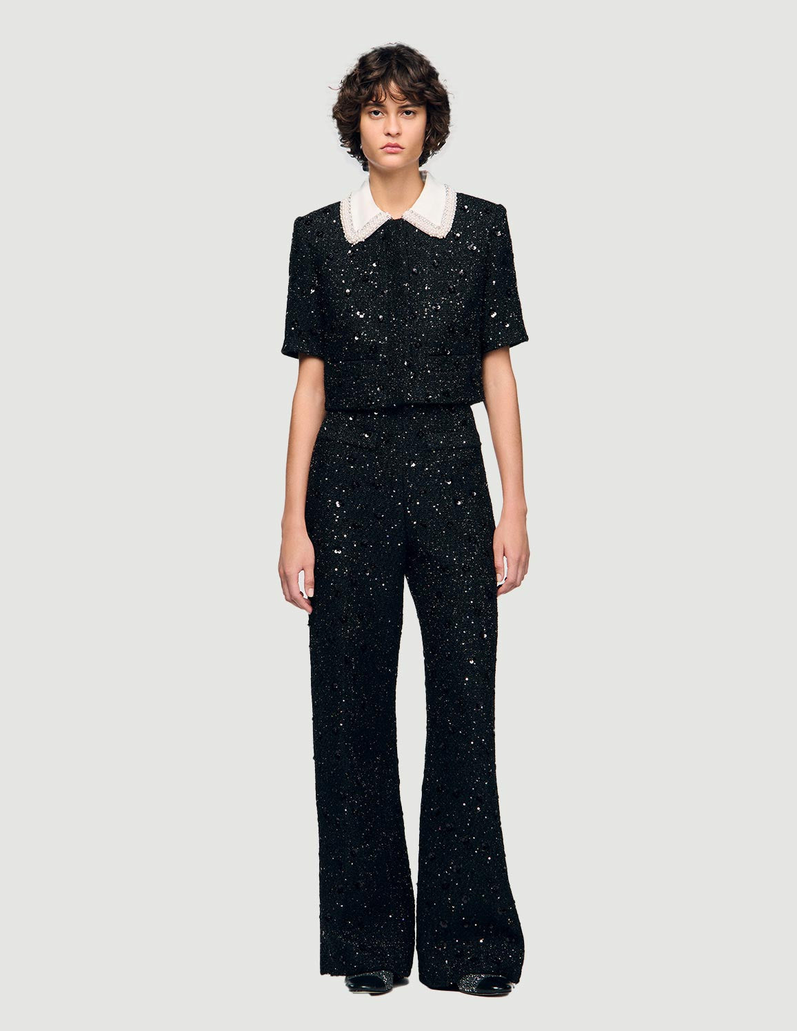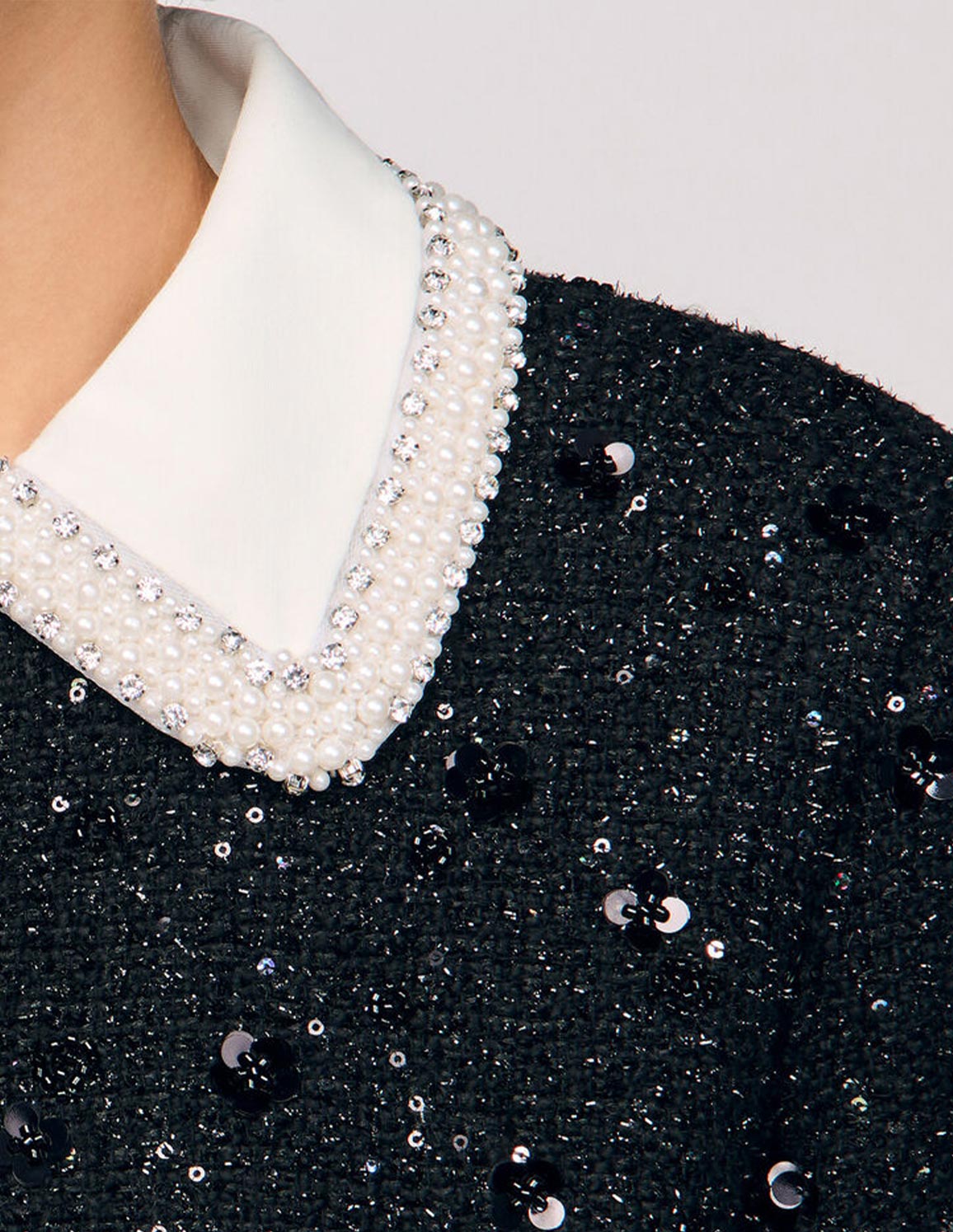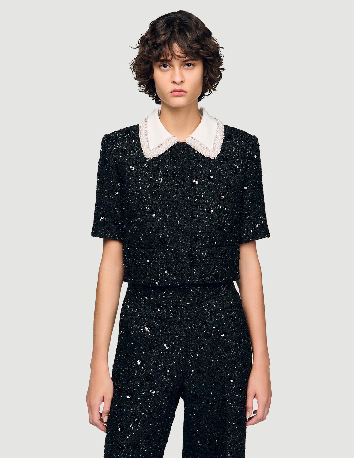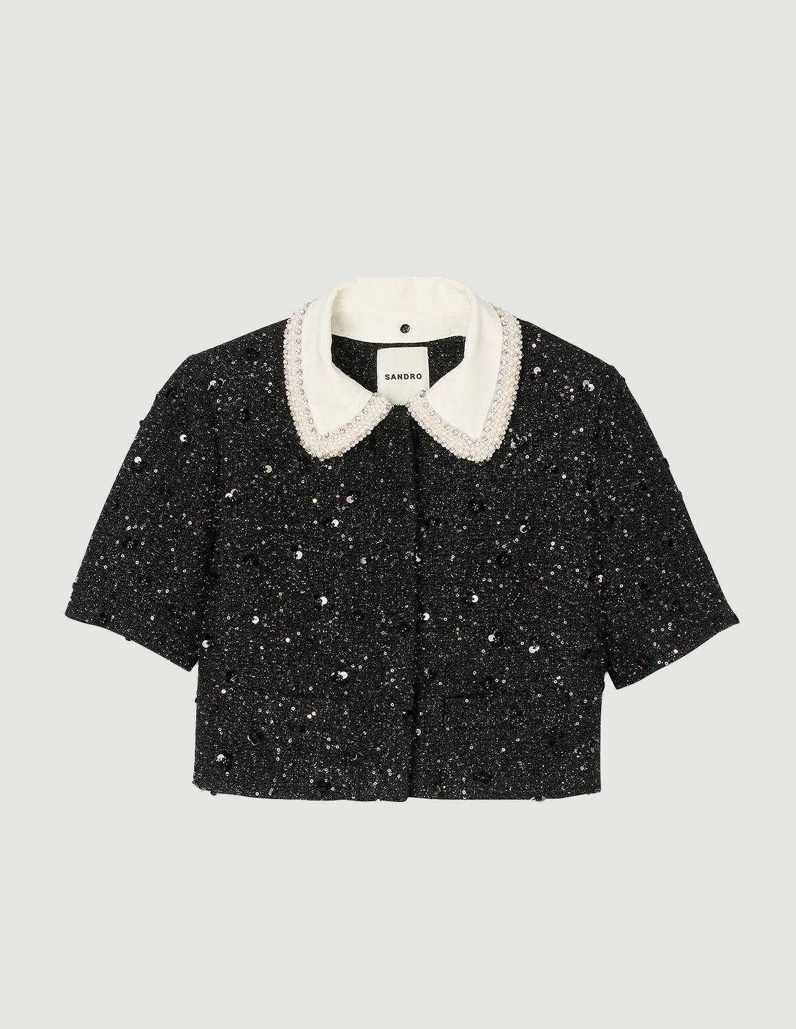 • Cropped tweed jacket embroidered with pearls and sequins, featuring a detachable contrasting jewellery collar and short sleeves.