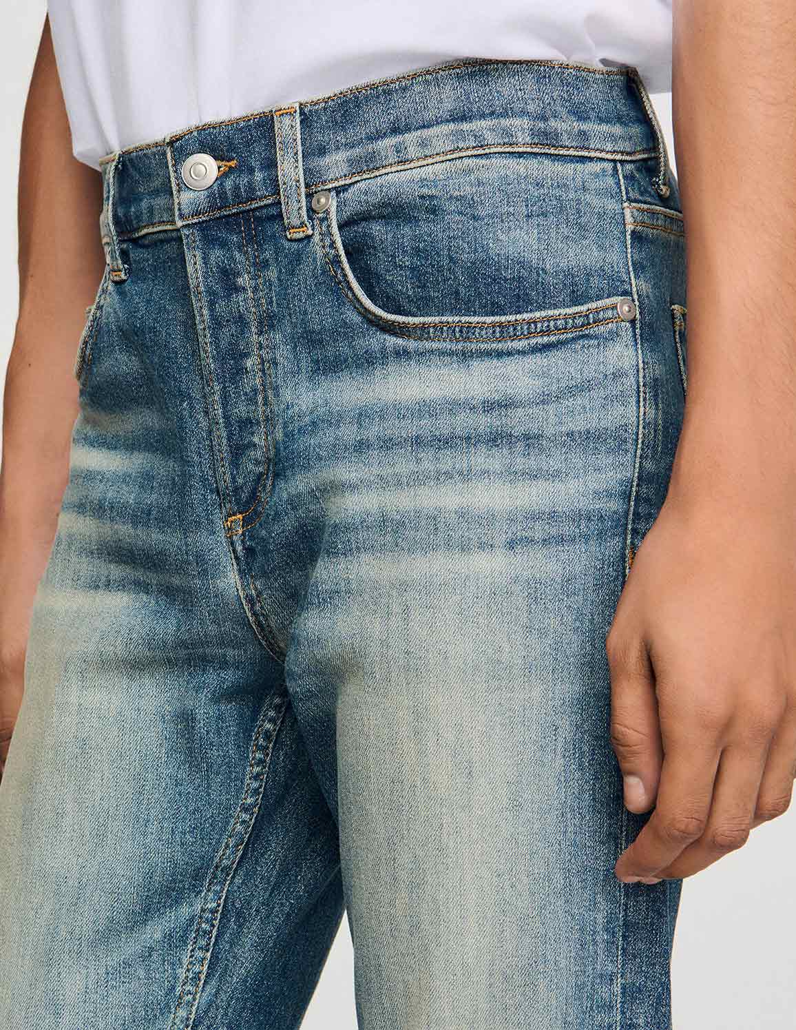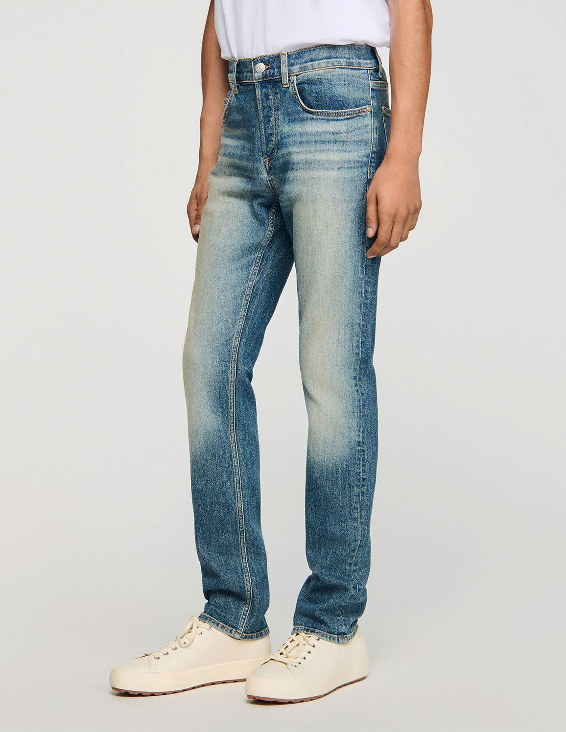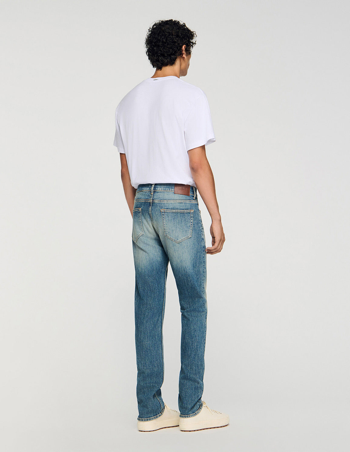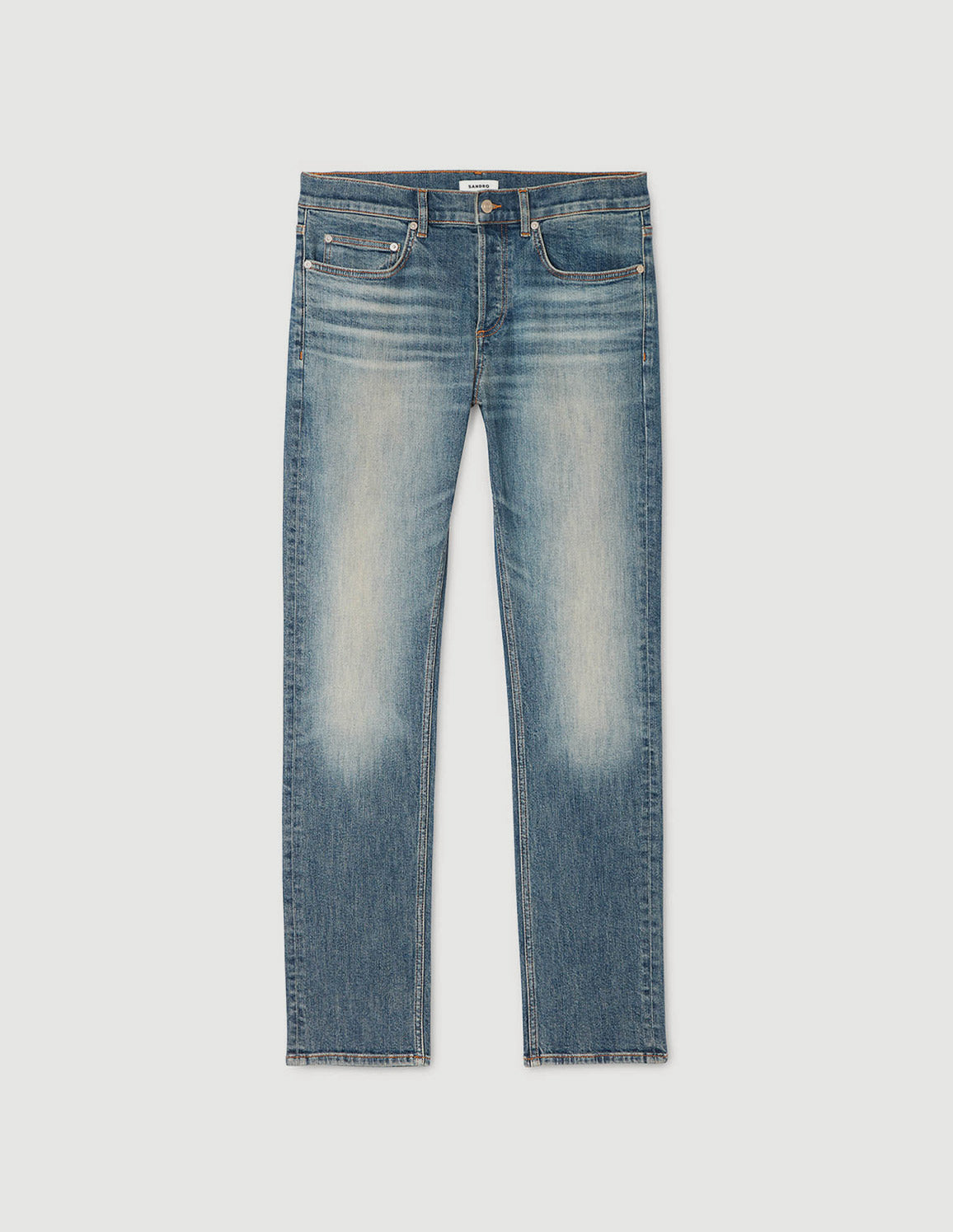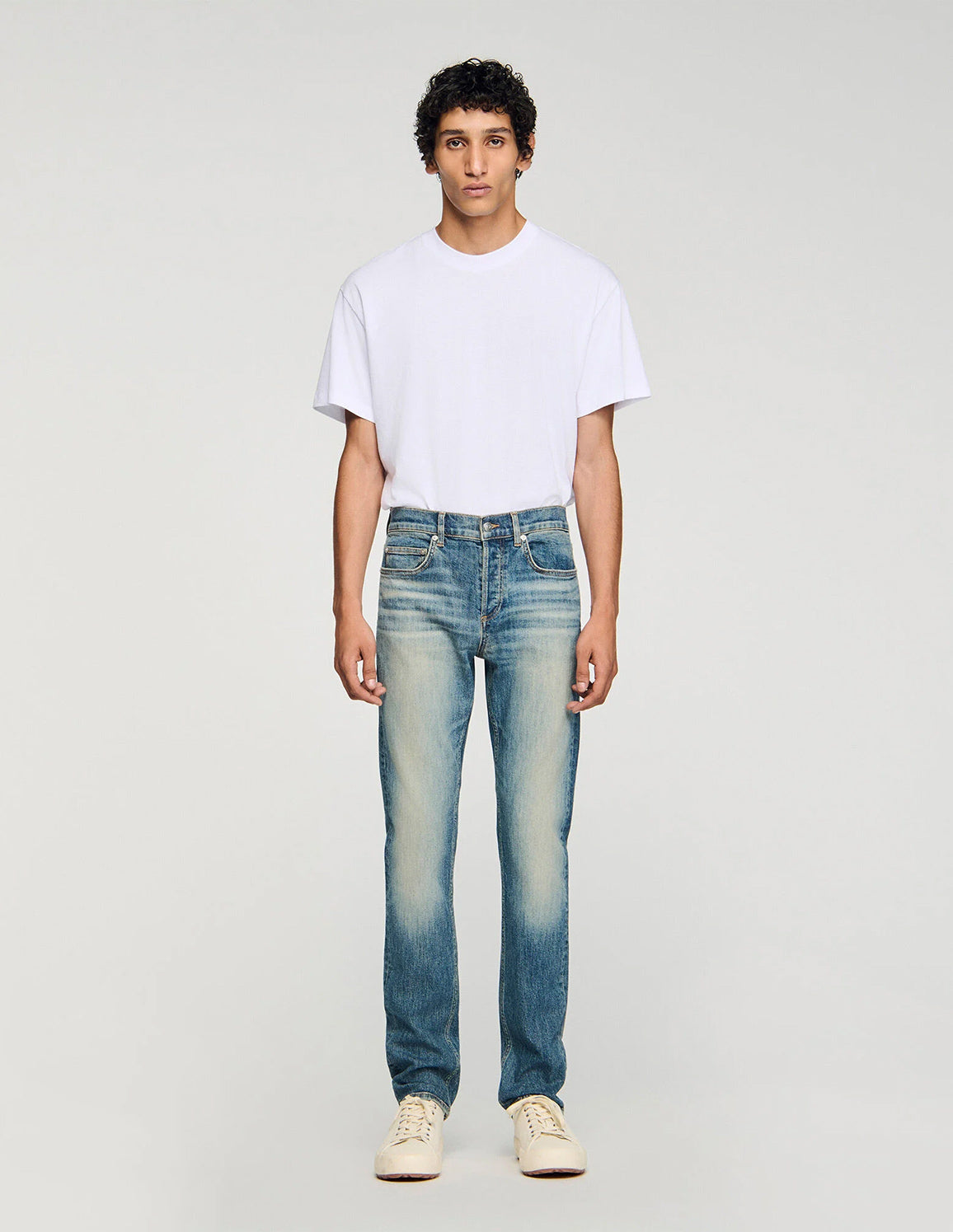 • Faded slim-fit denim jeans with button fastening at the front, featuring five pockets and an embossed Sandro leather jacron on the back.